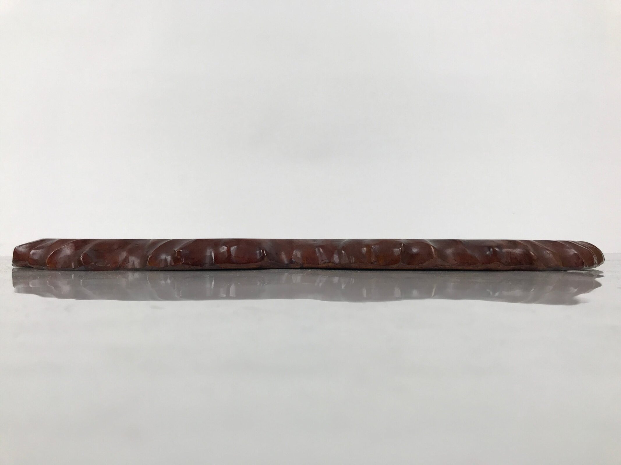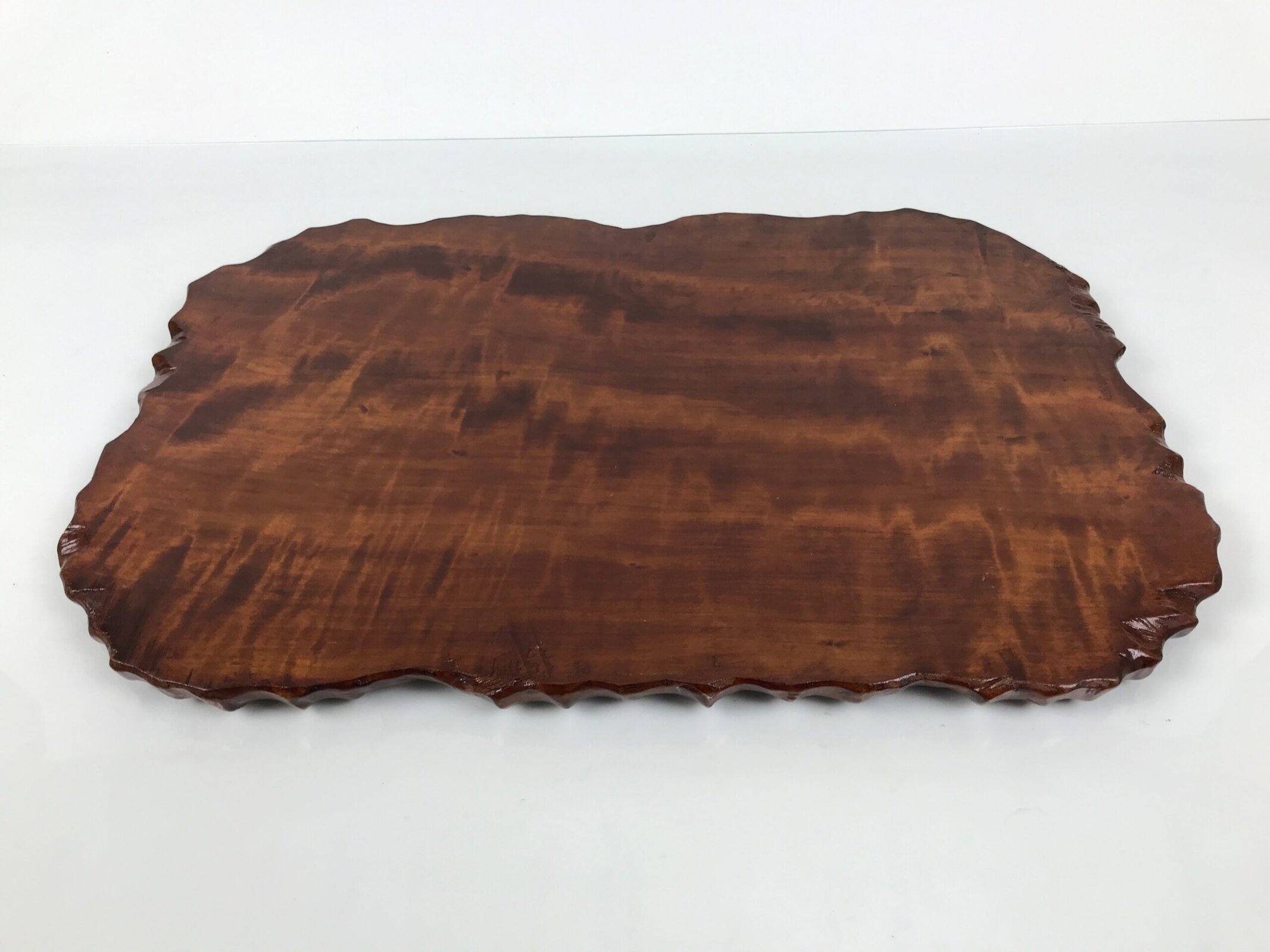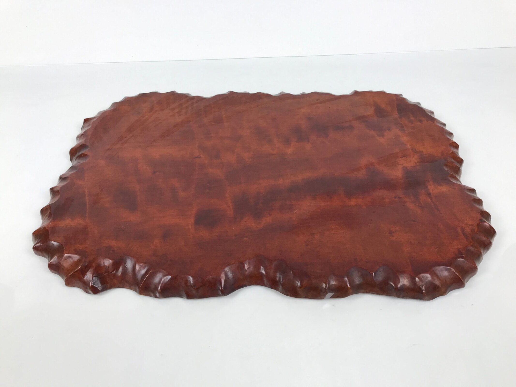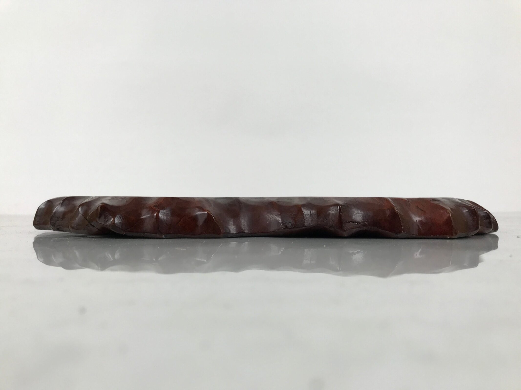 Used for the display of flower vases, ikebana arrangements, bonsai, and more, this classic, uniquely shaped kadai is one-of-a-kind, handcrafted from a piece of solid wood. It is stained a rich dark brown with a clear brushed lacquer coating. The stand has different curvy sides to create visual interest from any angle.