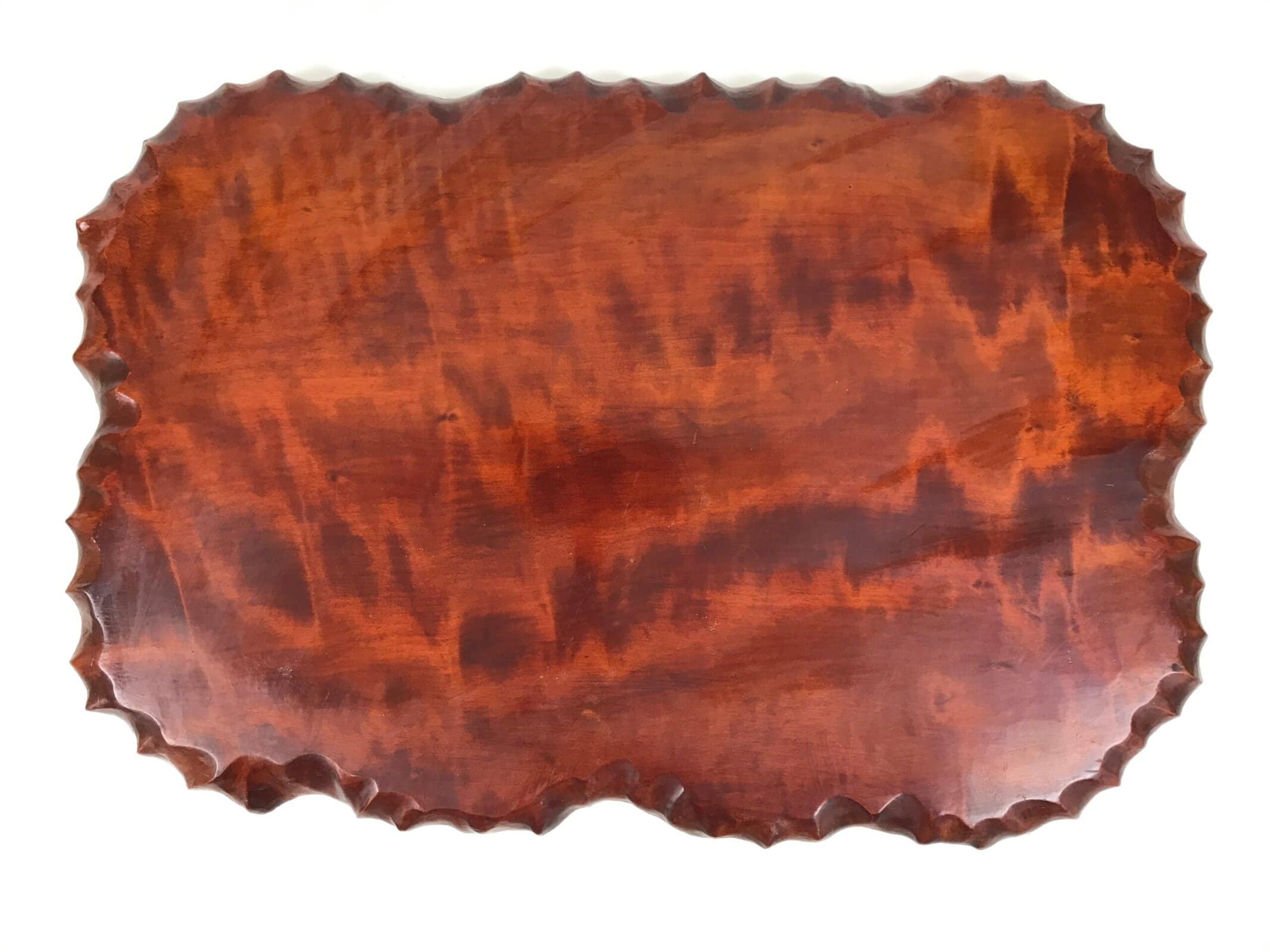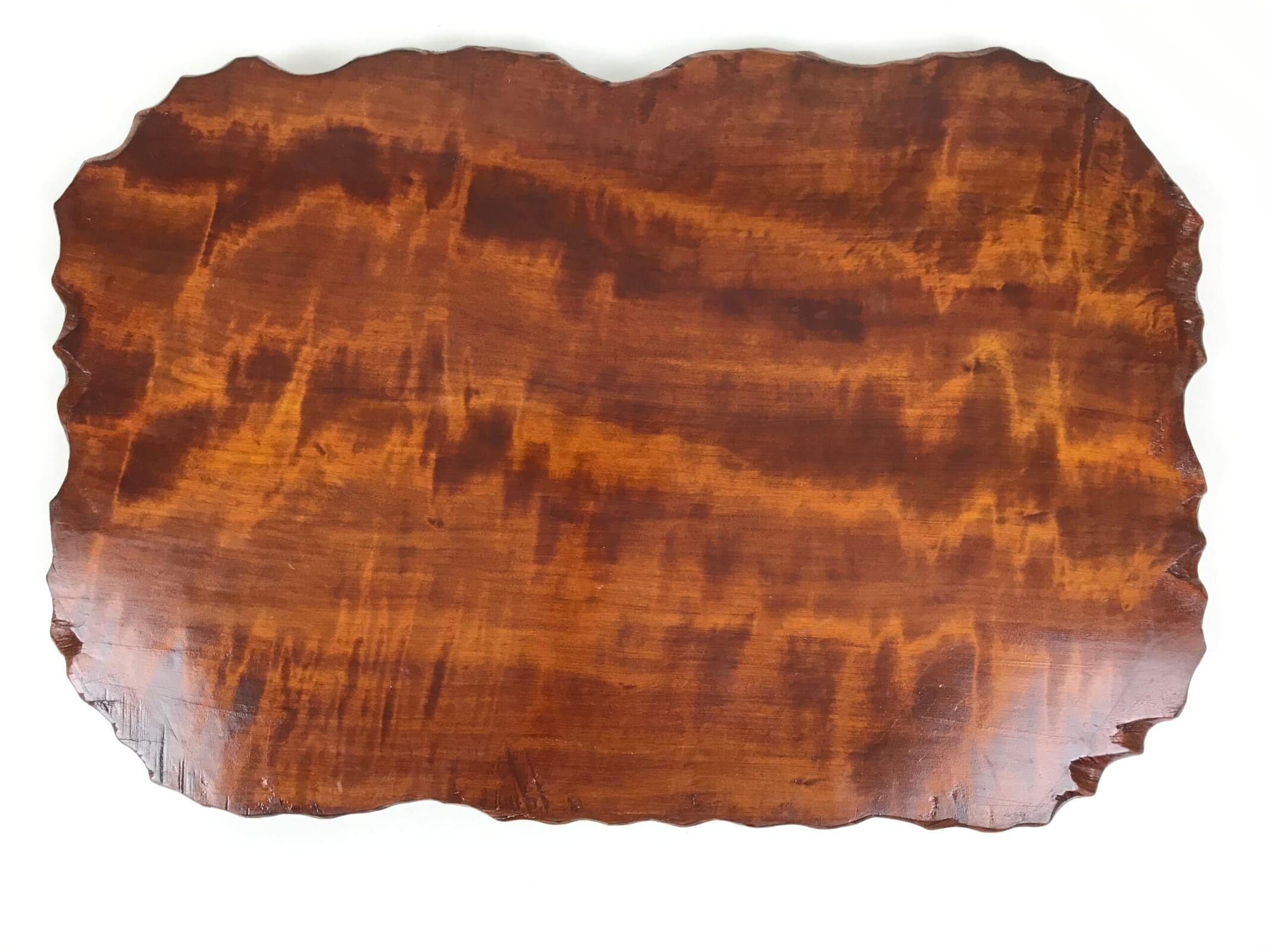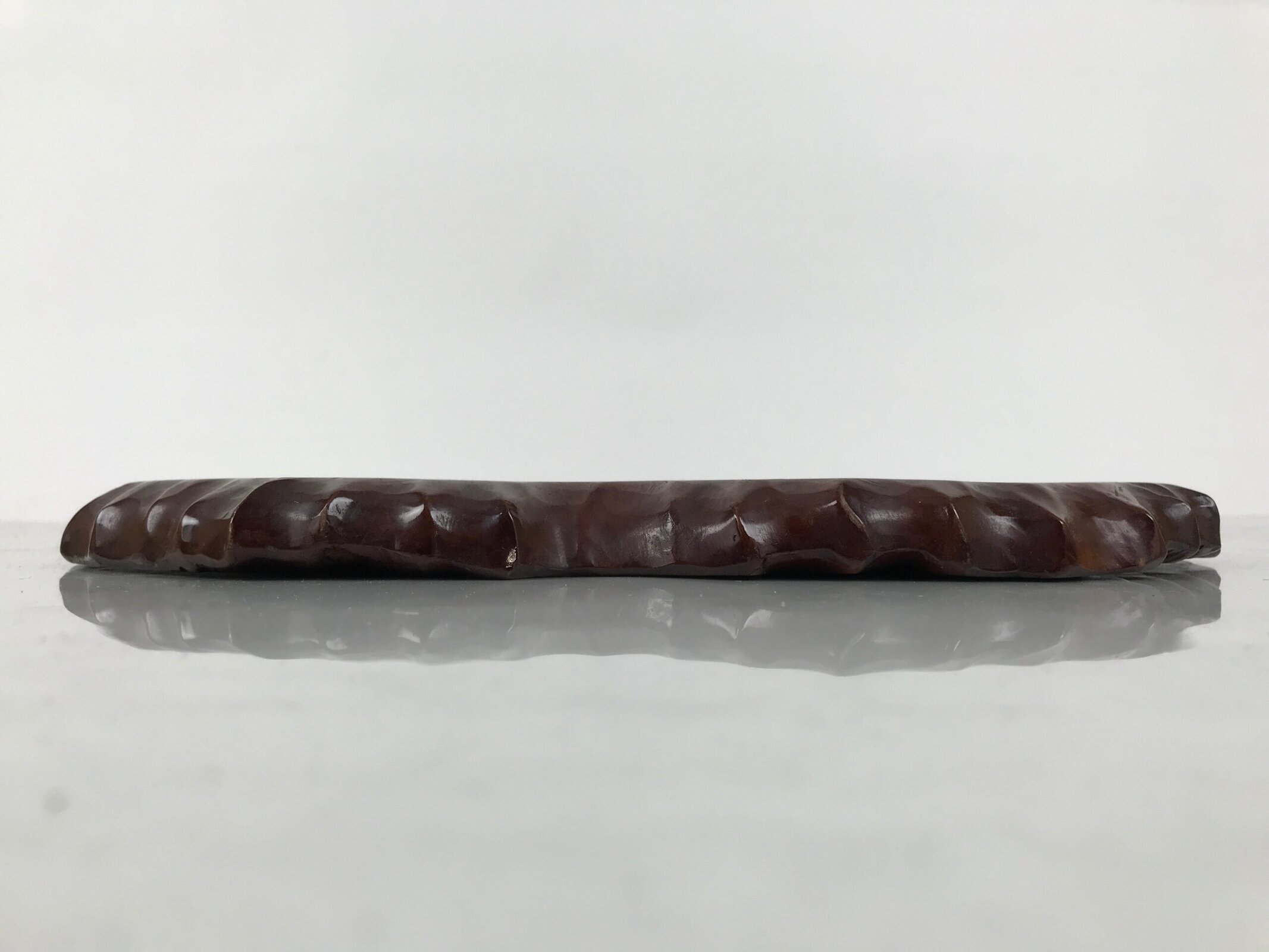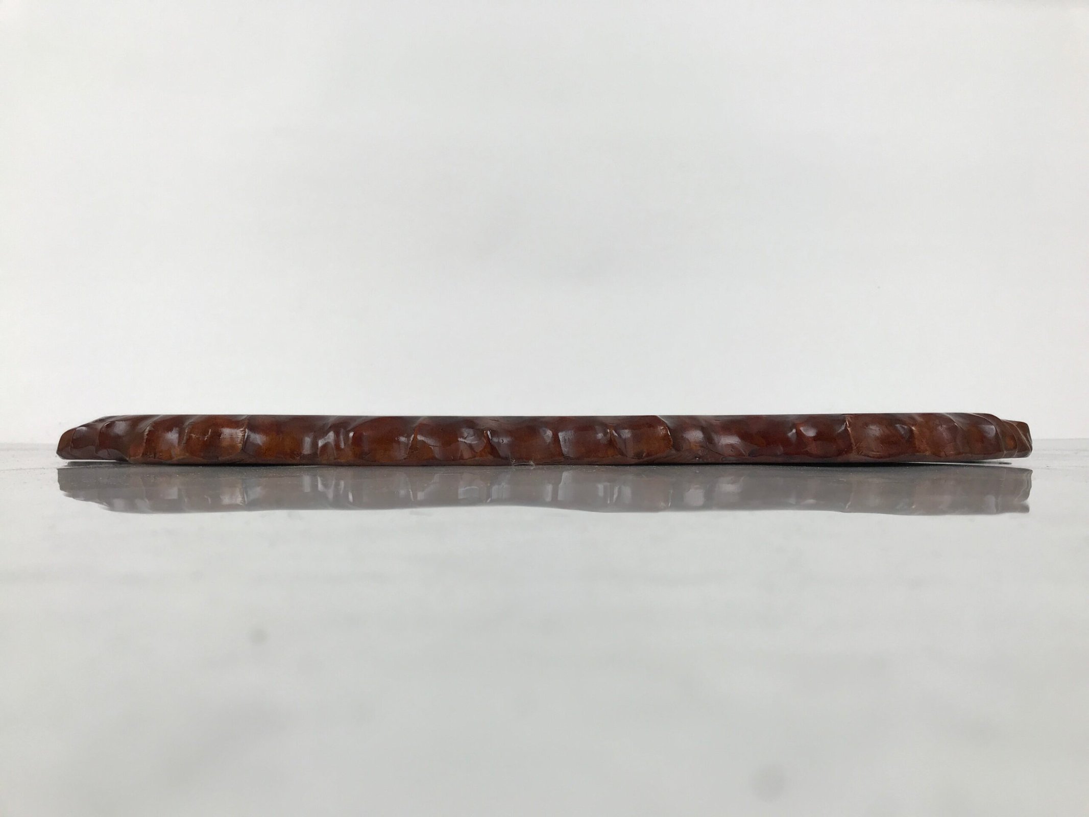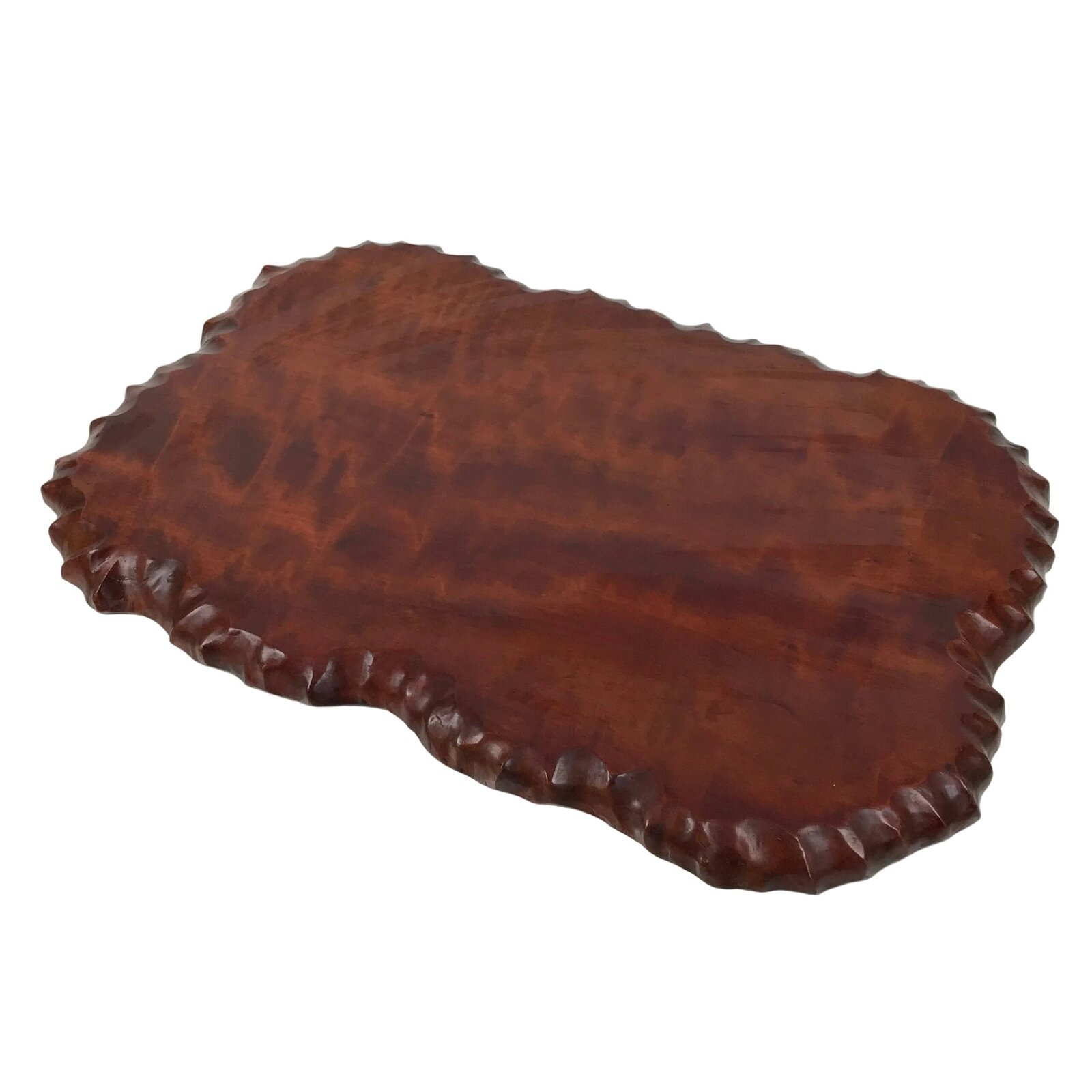 Used for the display of flower vases, ikebana arrangements, bonsai, and more, this classic, uniquely shaped kadai is one-of-a-kind, handcrafted from a piece of solid wood. It is stained a rich dark brown with a clear brushed lacquer coating. The stand has different curvy sides to create visual interest from any angle.