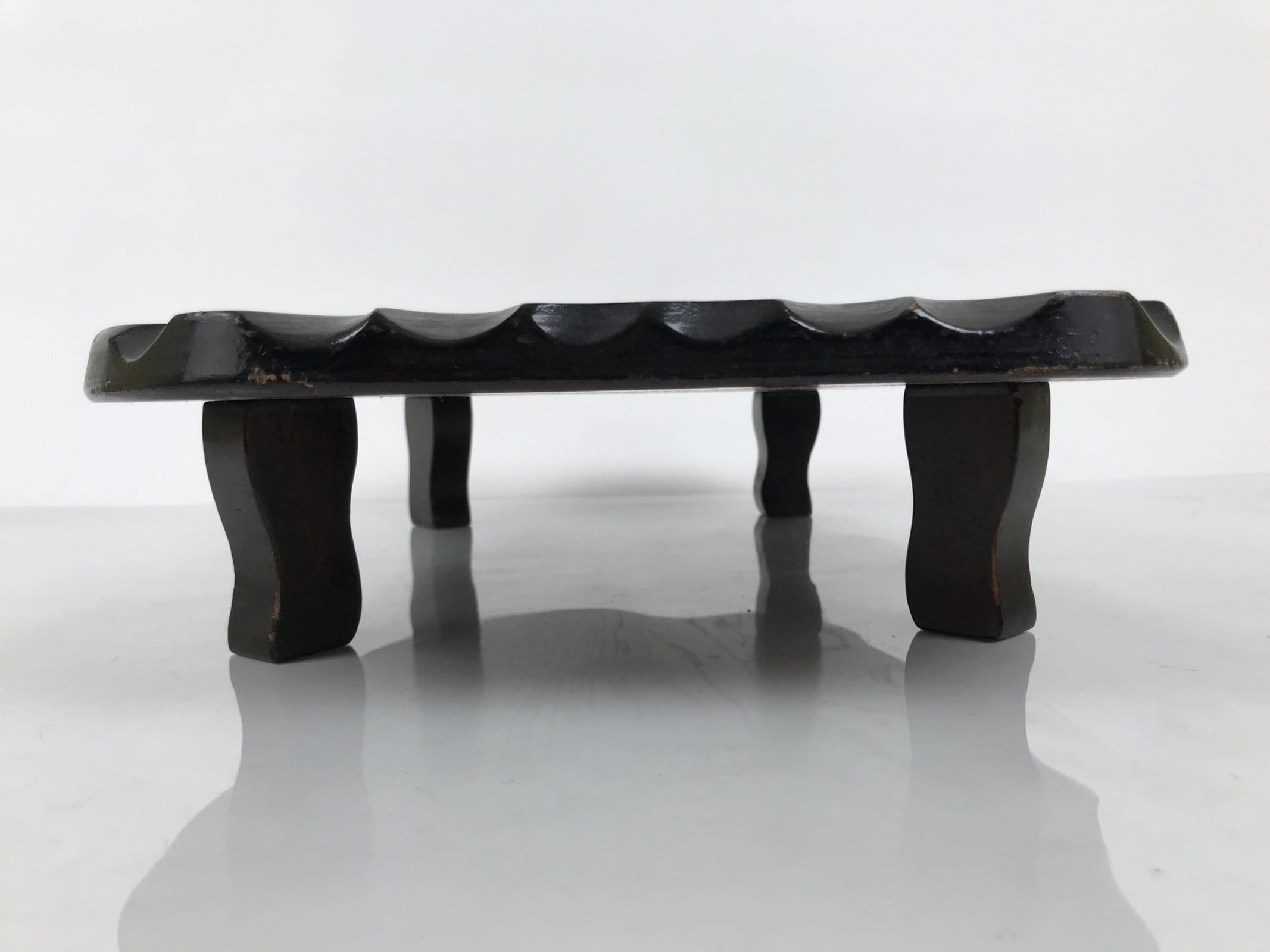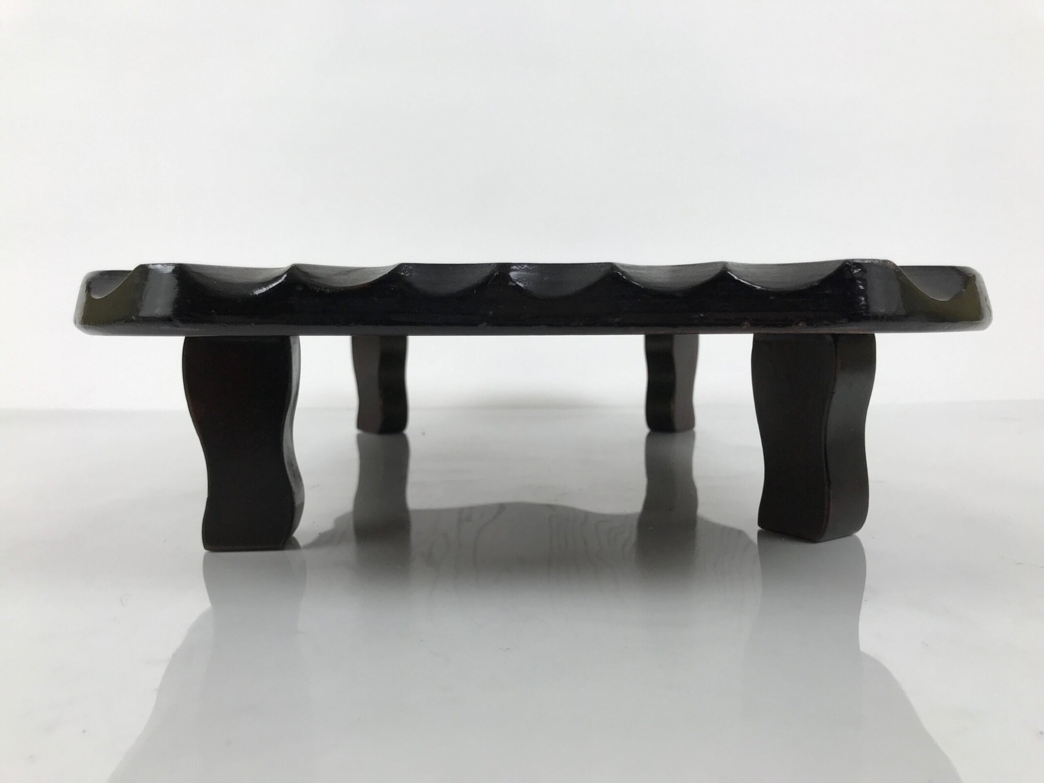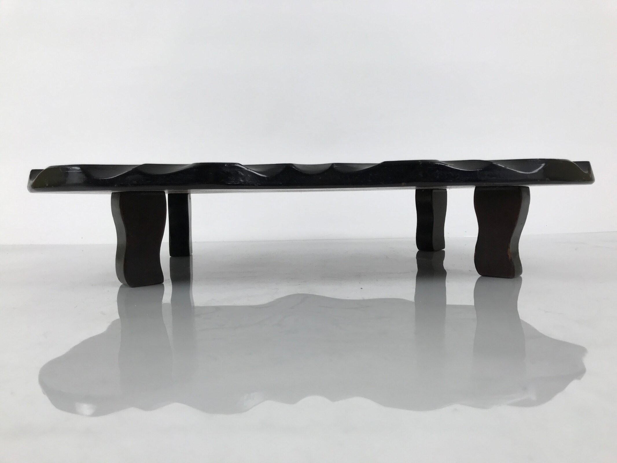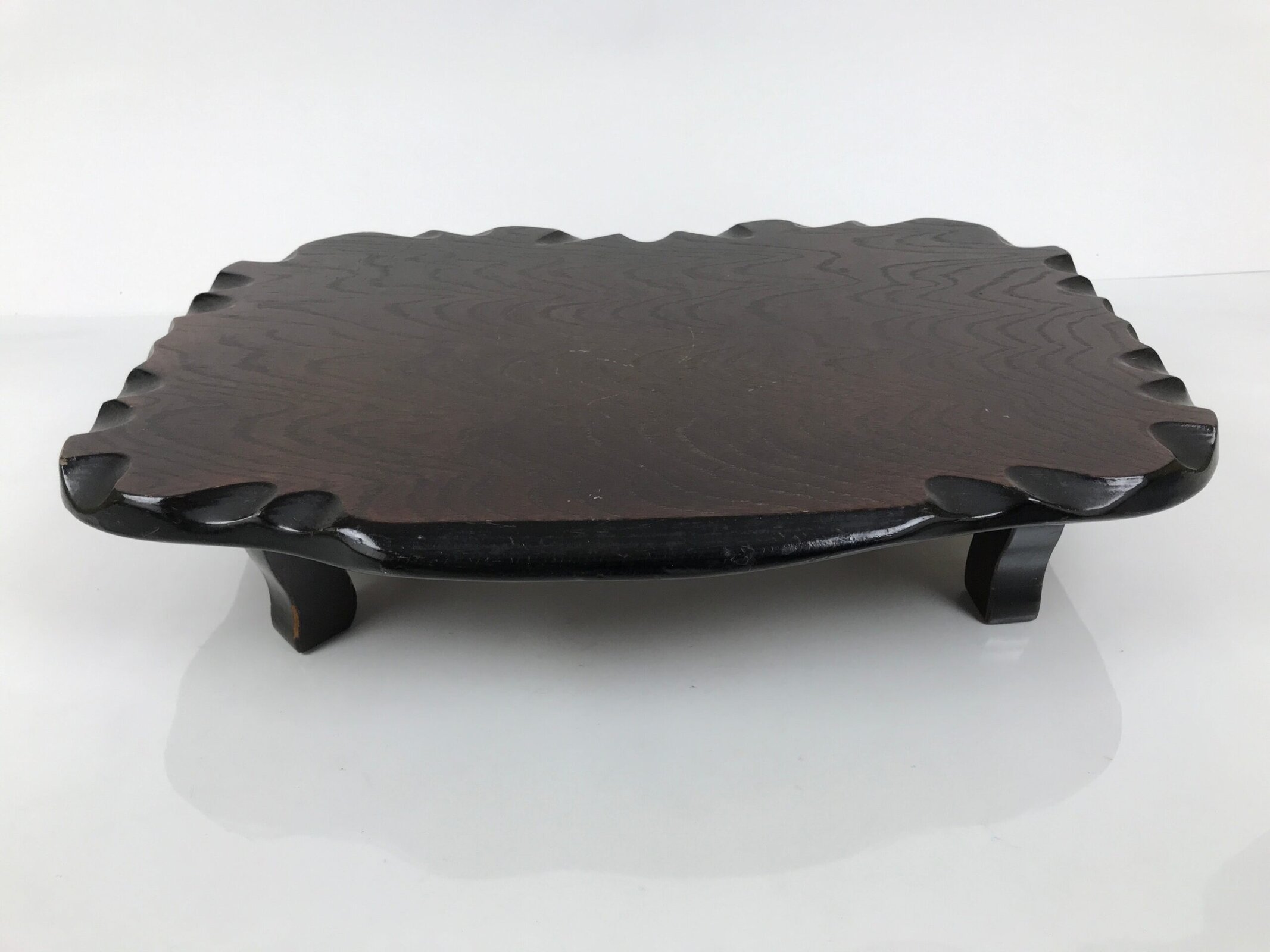 Used for the display of flower vases, ikebana arrangements, bonsai, and more, this classic, uniquely shaped kadai is one-of-a-kind, handcrafted from a piece of solid wood. It is stained a rich dark brown with a clear brushed lacquer coating. The stand has different curvy sides to create visual interest from any angle. It has four removable legs that allow the kadai to be used flat if preferred.