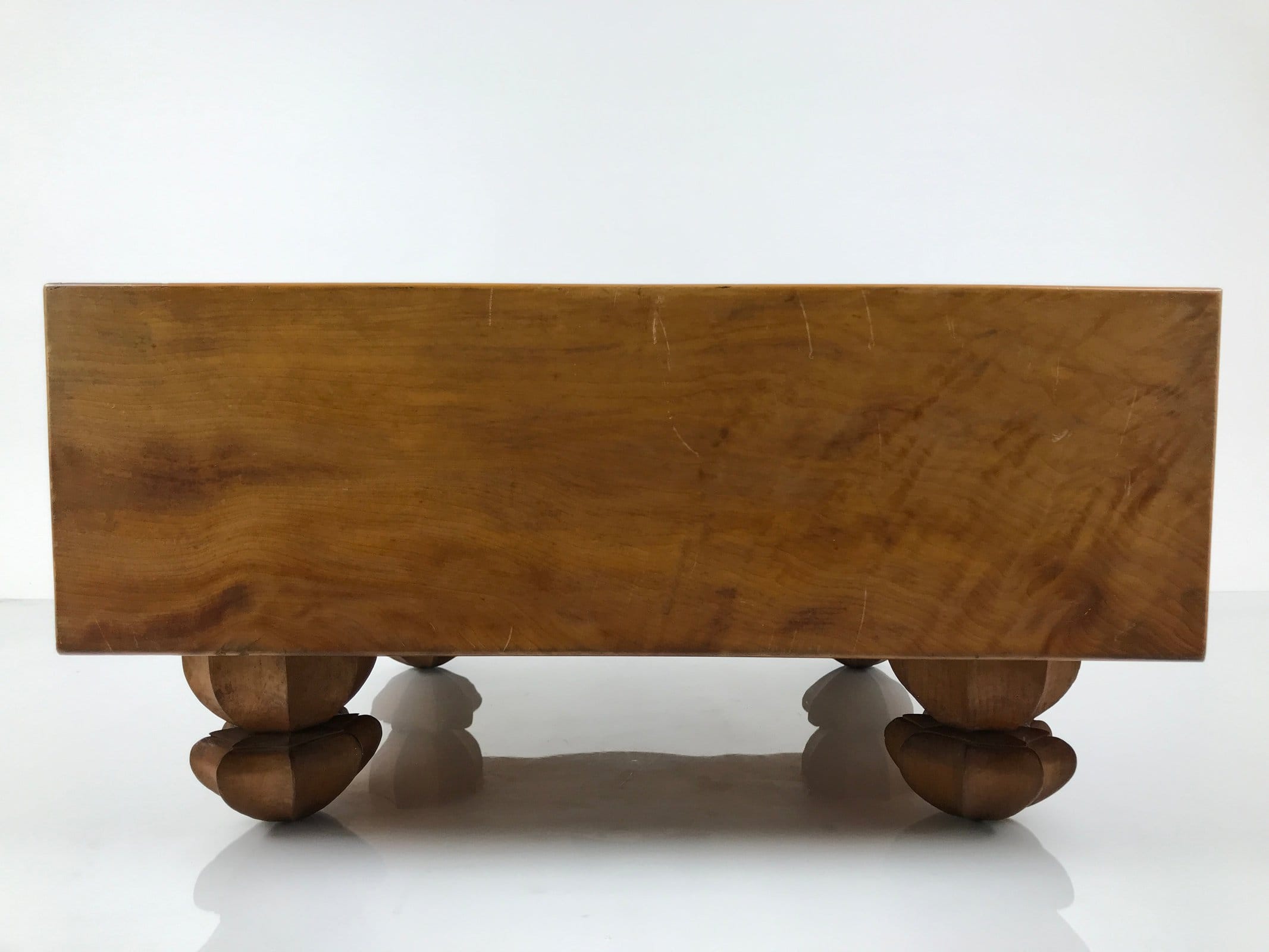 This is a vintage Goban, or go board, used to play the popular strategy board game Igo, or Go. This sturdy 19×19 grid game board in a medium brown wood color with a gorgeous clear lacquer finish rests on 4 removable legs, creating a small table that is typically used on the floor. Two sides are lacquered a slick black. It comes with a wooden protective cover.