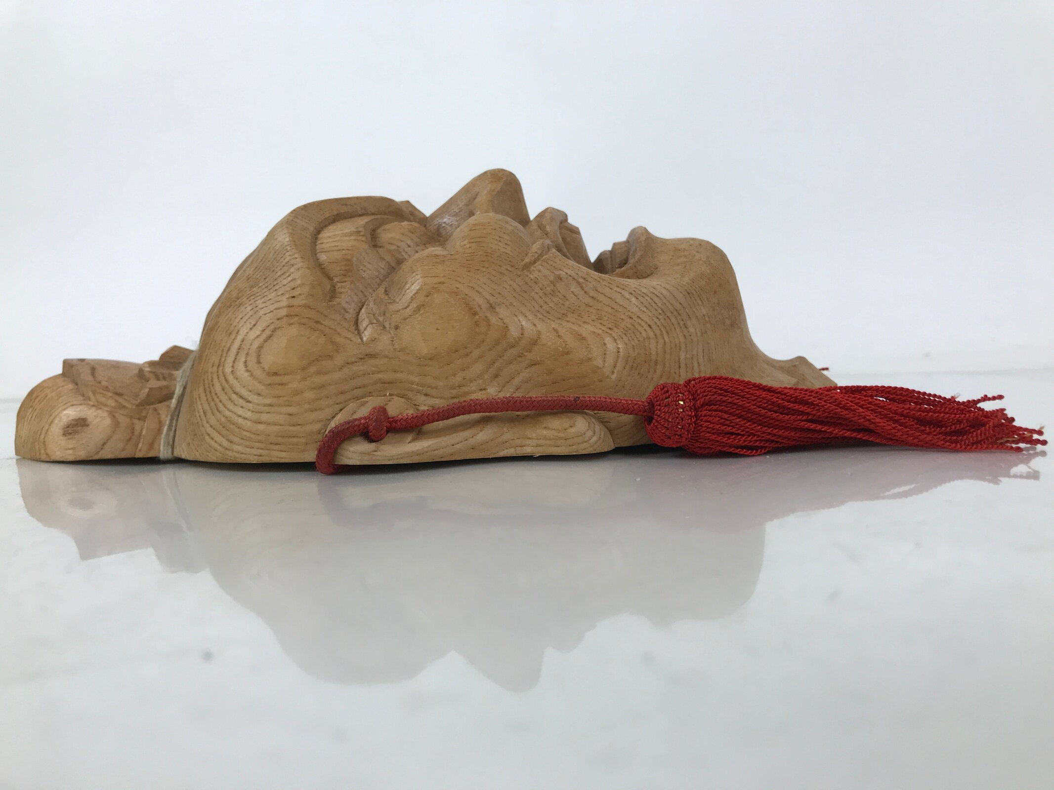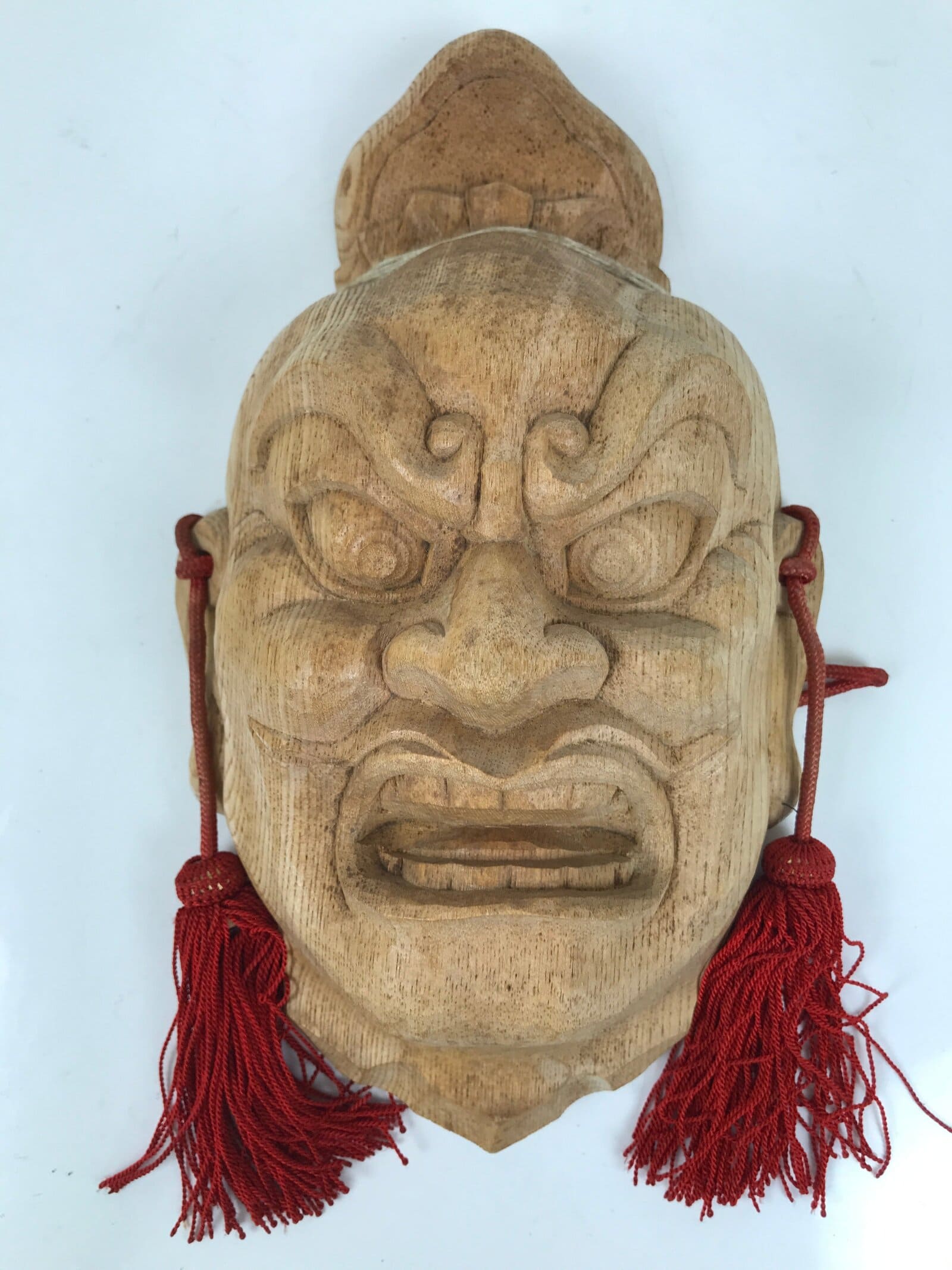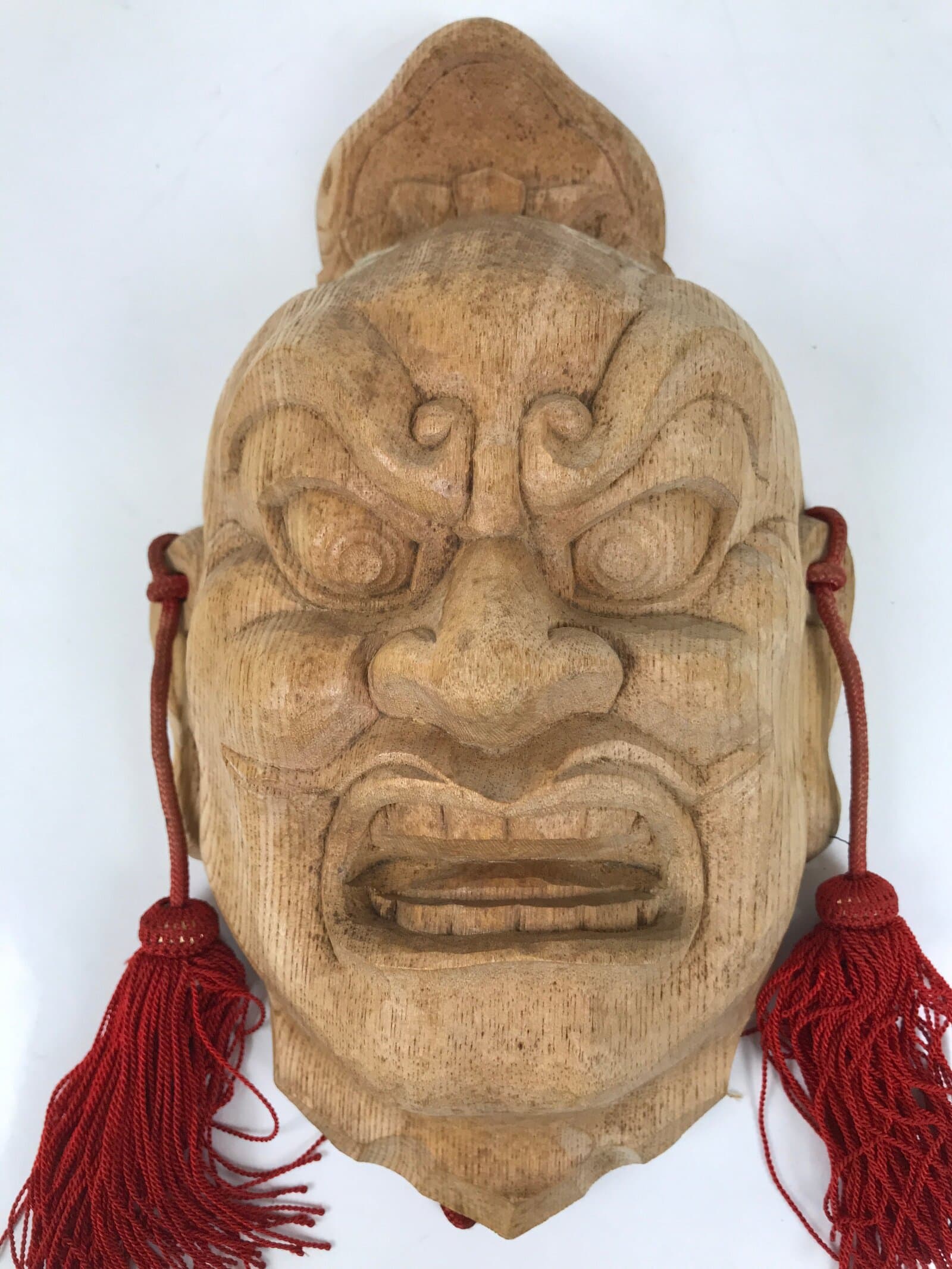 This is a Japanese hand-carved wooden mask of one of the Nio guardians, Agyou. It is a natural light brown wood color with a braided red cord with two tassels.