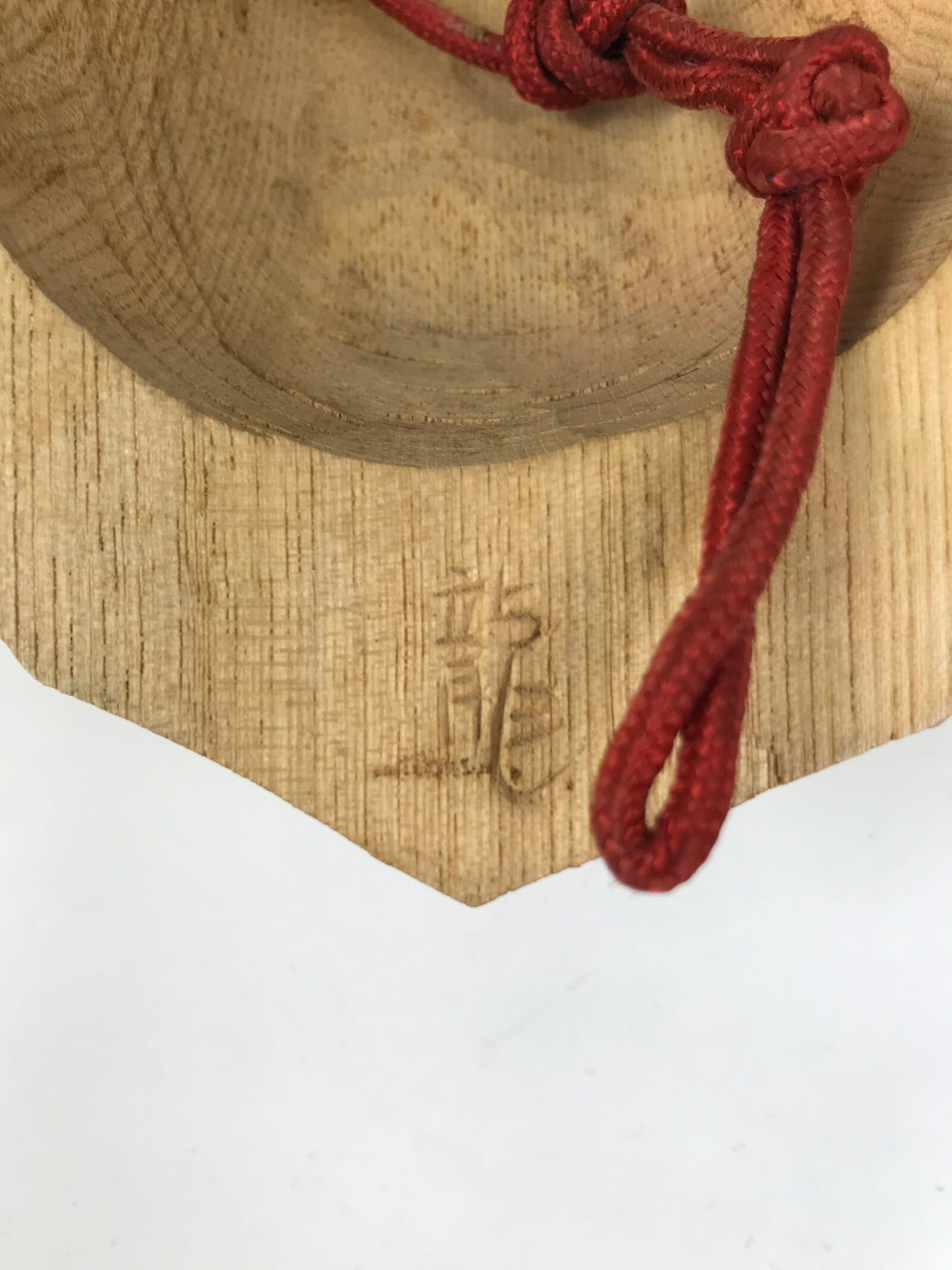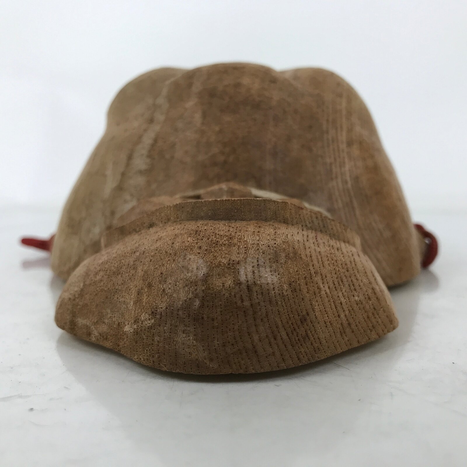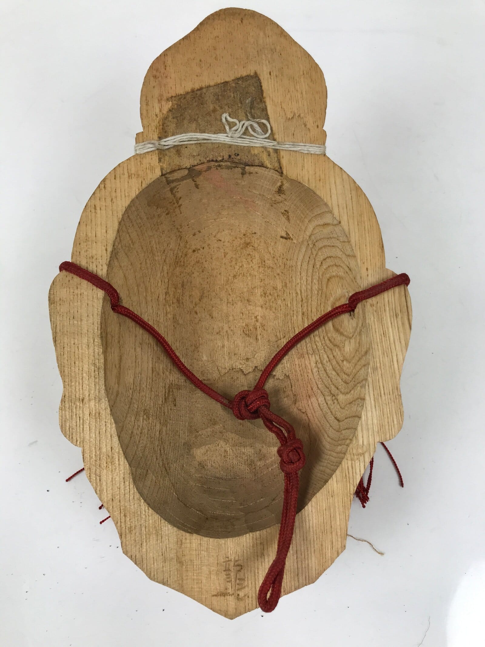 This is a Japanese hand-carved wooden mask of one of the Nio guardians, Agyou. It is a natural light brown wood color with a braided red cord with two tassels.