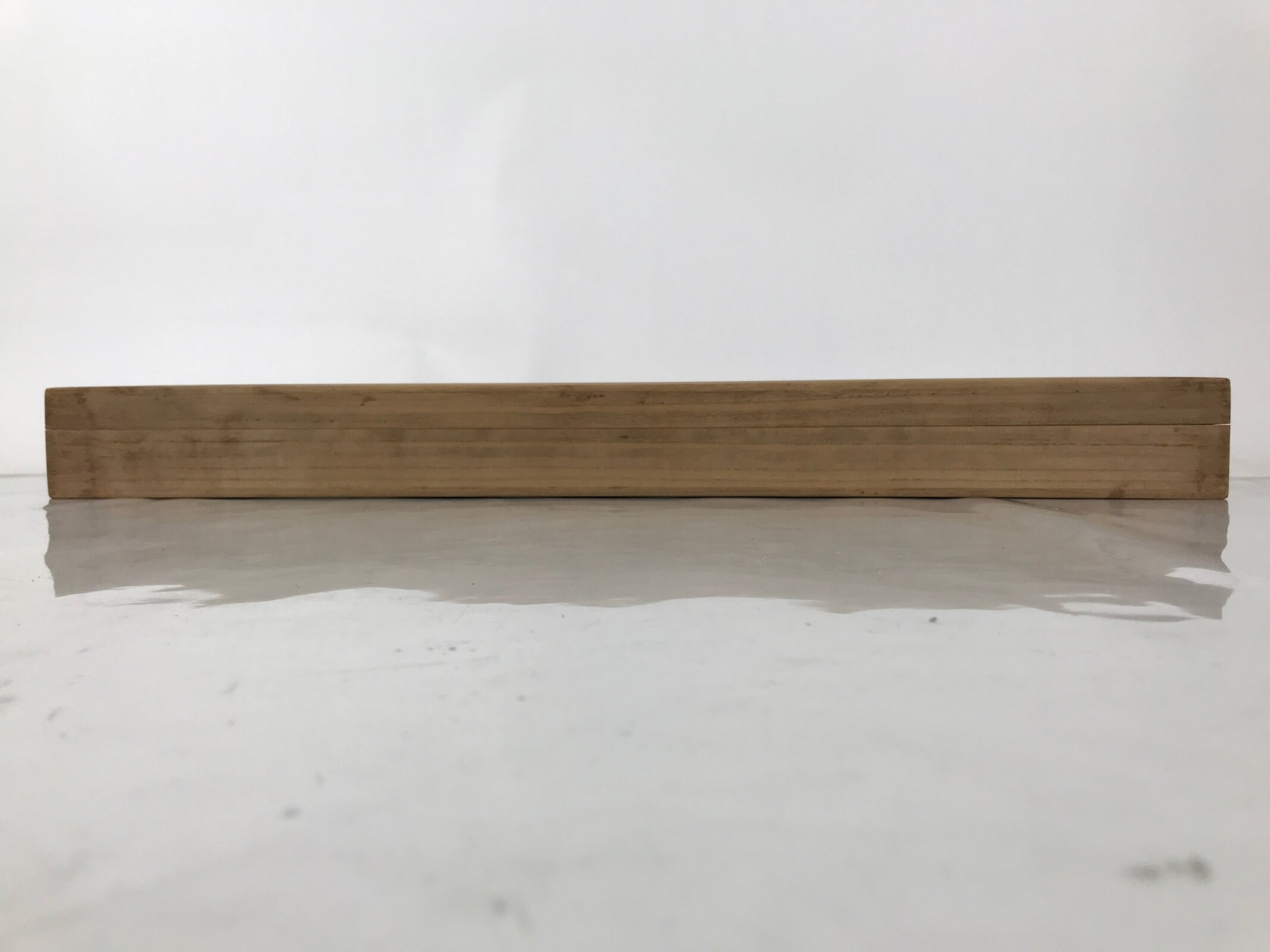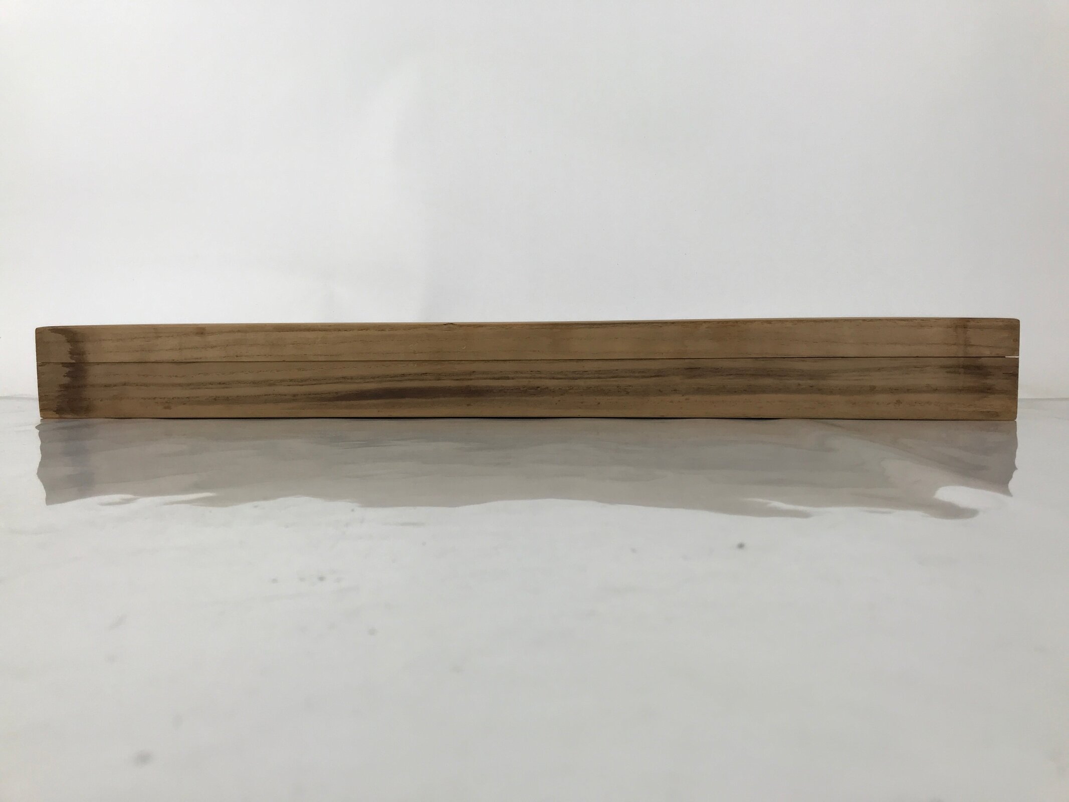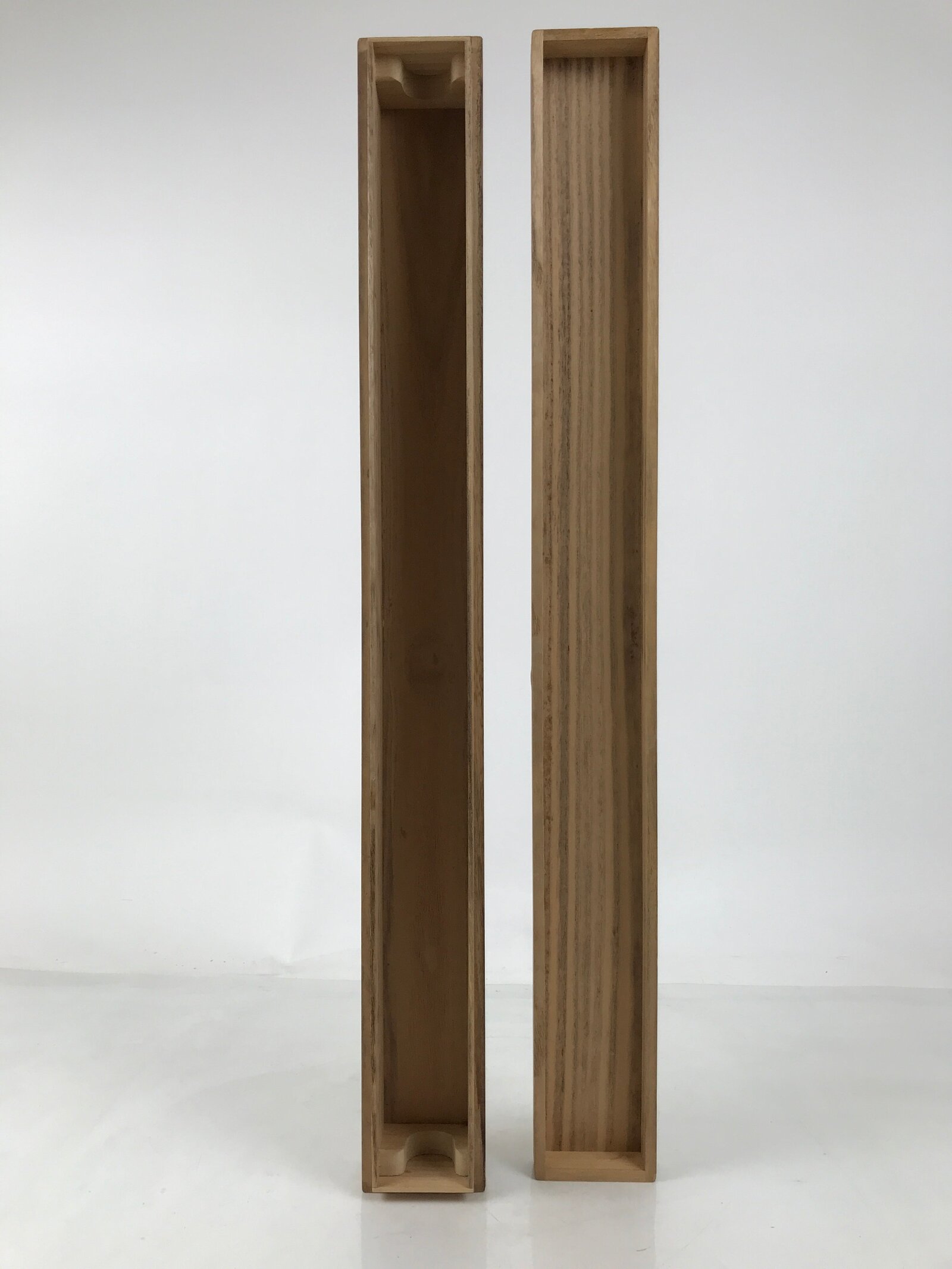 Hand-crafted and in a natural wood color, this sturdy, slender box is made to store a hanging scroll, or kakejiku. The lid fits flush on the top. It has two carved wooden brackets attached to the inside used to keep a scroll in place.