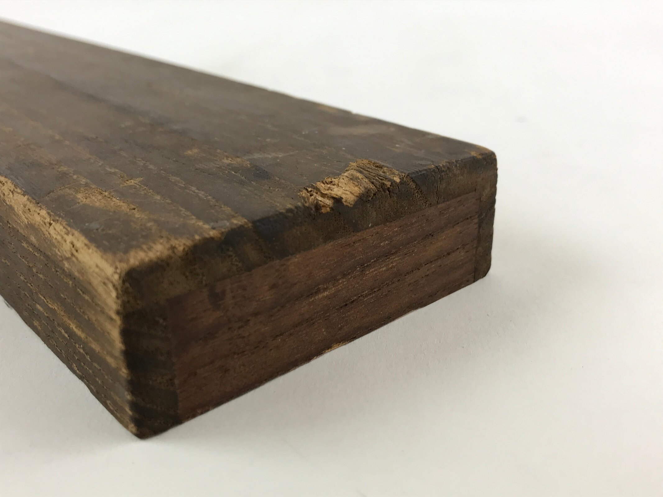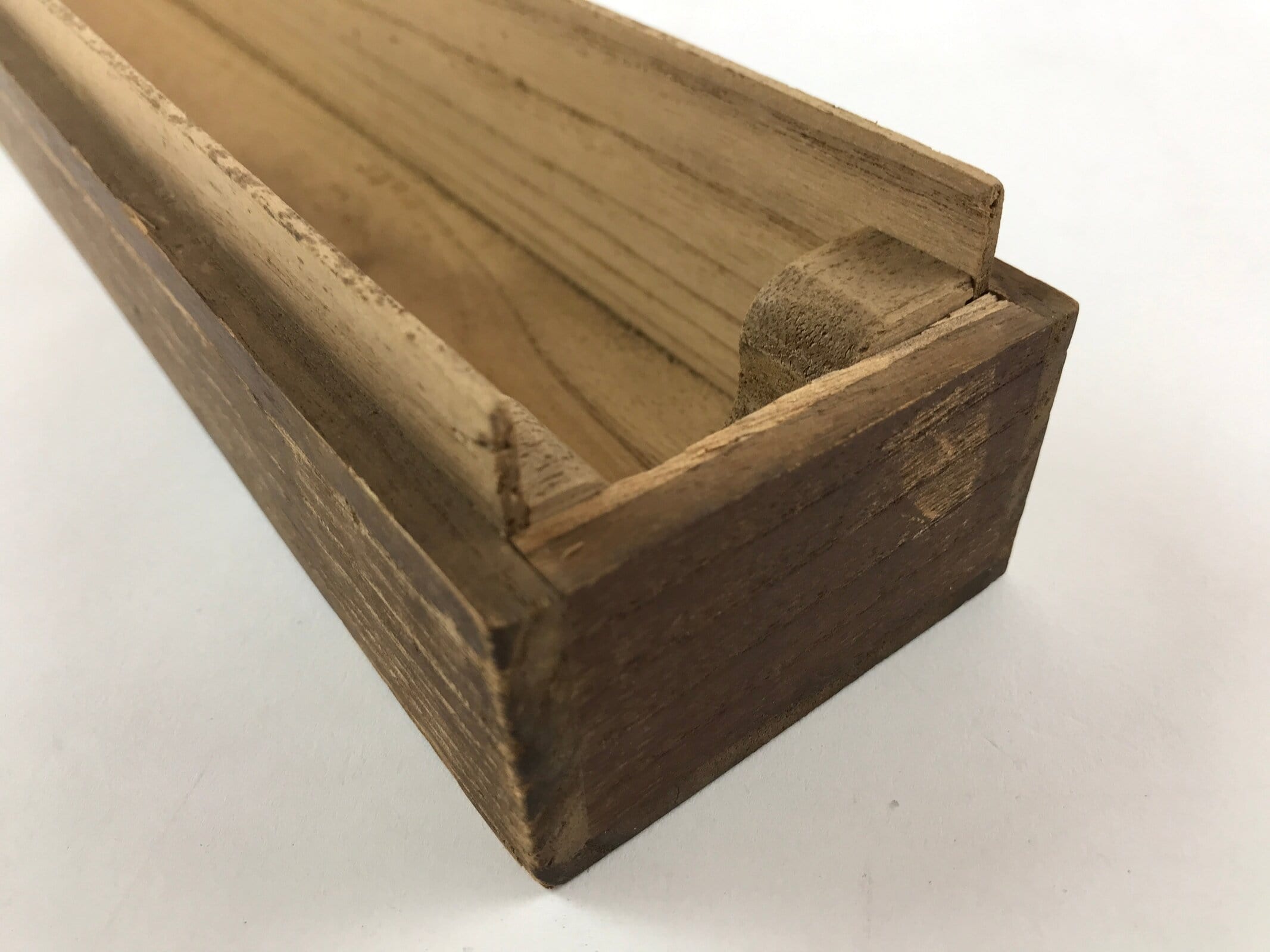 Hand-crafted and a medium brown color, this sturdy, slender wooden box is made to store a hanging scroll, or kakejiku. The lid is step-top and fits flush on the top. The inside features two wooden brackets used for securing a scroll in place. One bracket is fixed and the other is adjustable.
