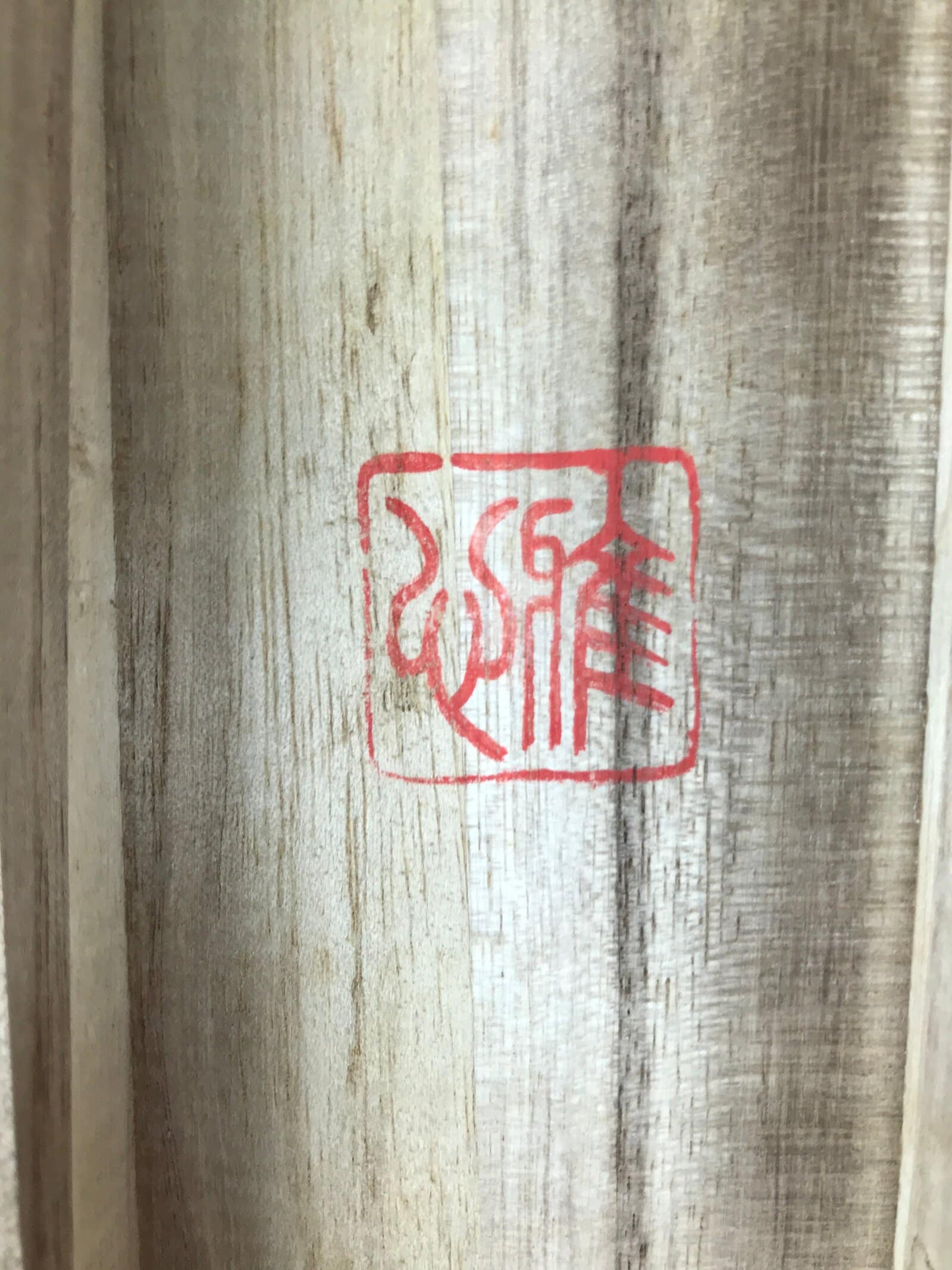 Hand-crafted and in a natural wood color, this sturdy, slender box is made to store a hanging scroll, or kakejiku. The lid fits flush on the top. It has two wooden brackets inside the box to secure the scroll. This specific box has inscriptions on the top and a red seal on the inside of the lid. There is a label on the lid.