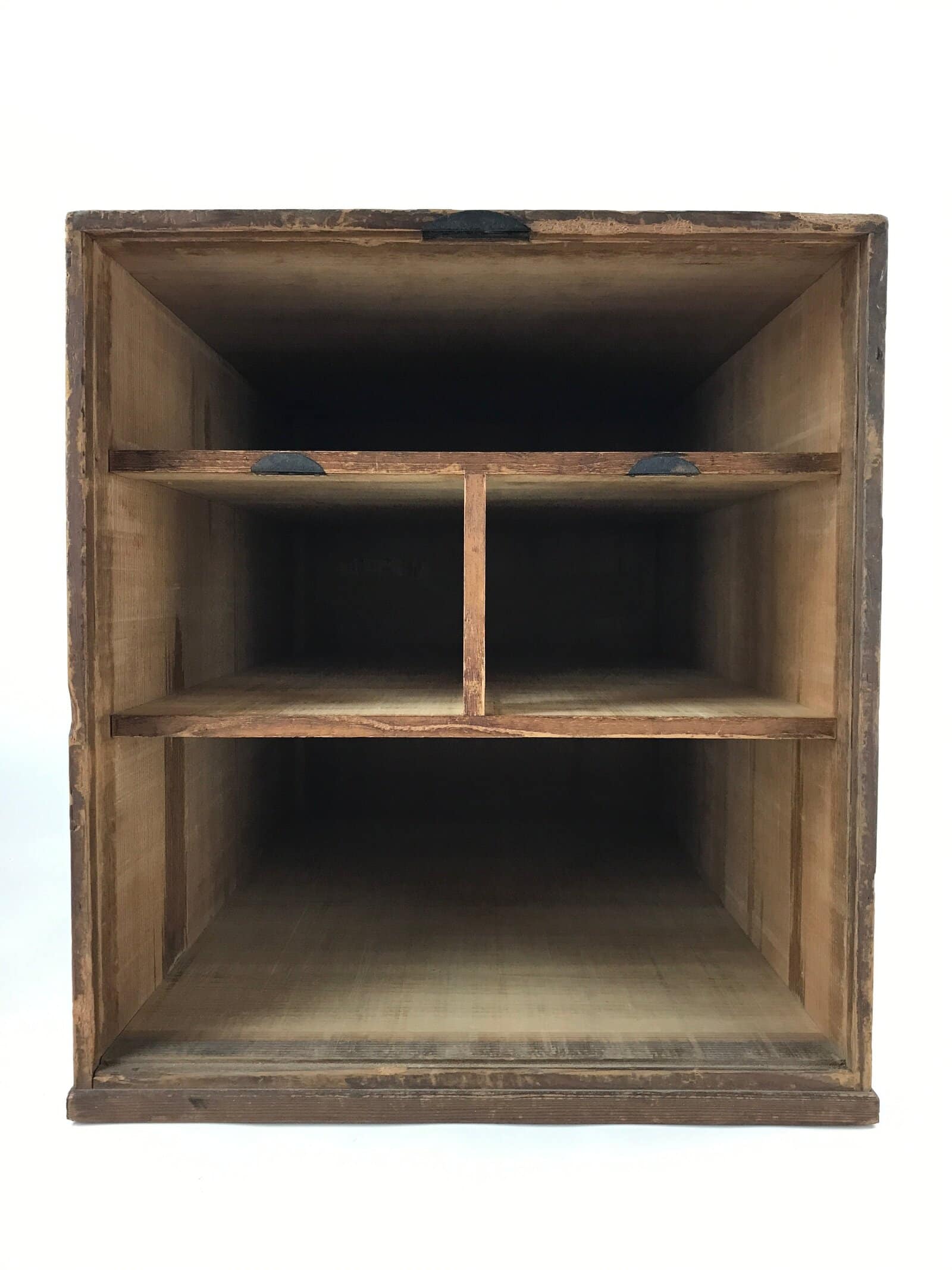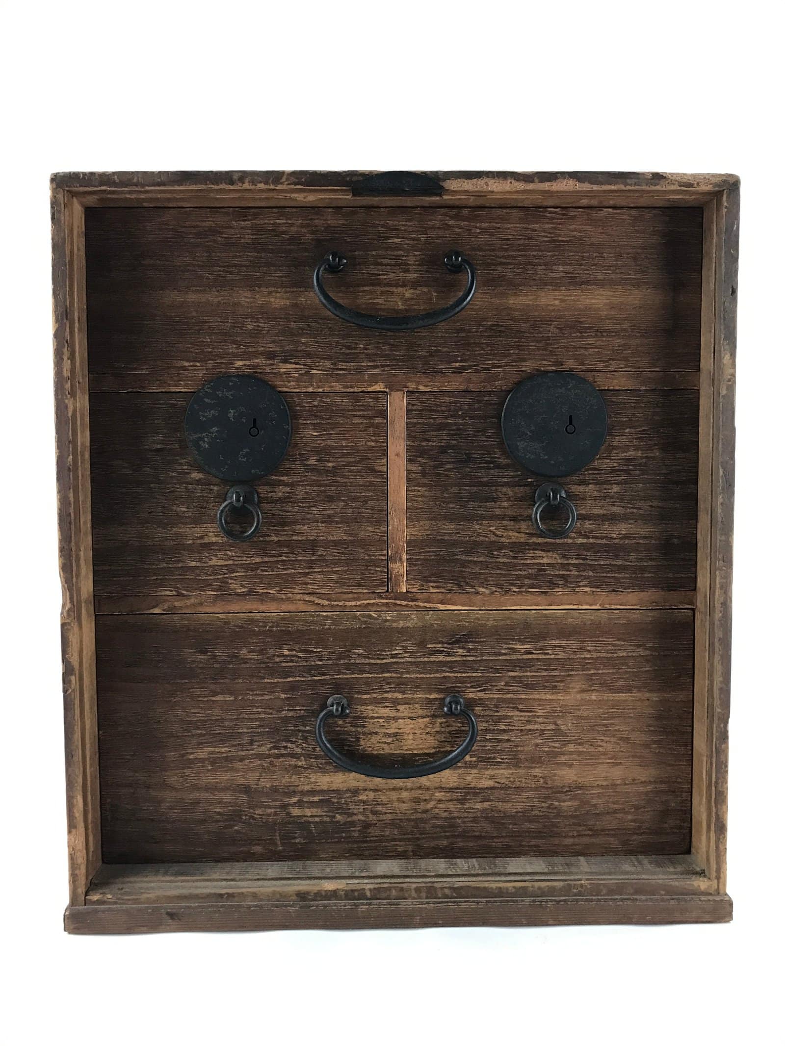 This is a large Japanese storage chest made of fragrant hinoki wood. It contains four drawers, two of which have built-in iron locks (key not included). It uses simple metal hardware. At one time, this chest had a lockable, removable door panel at the front, but it is missing. This item may have been a lock box or safe.
