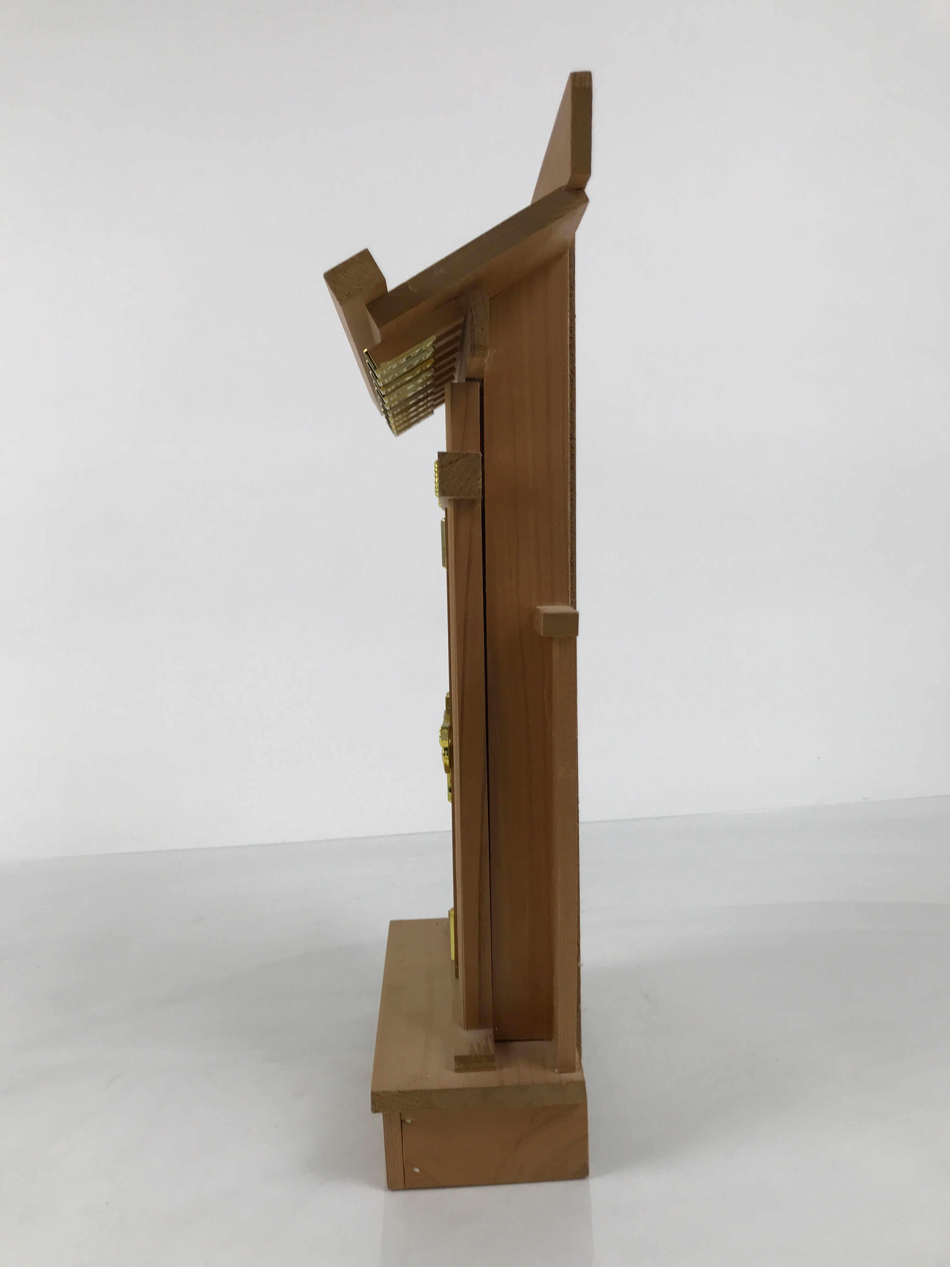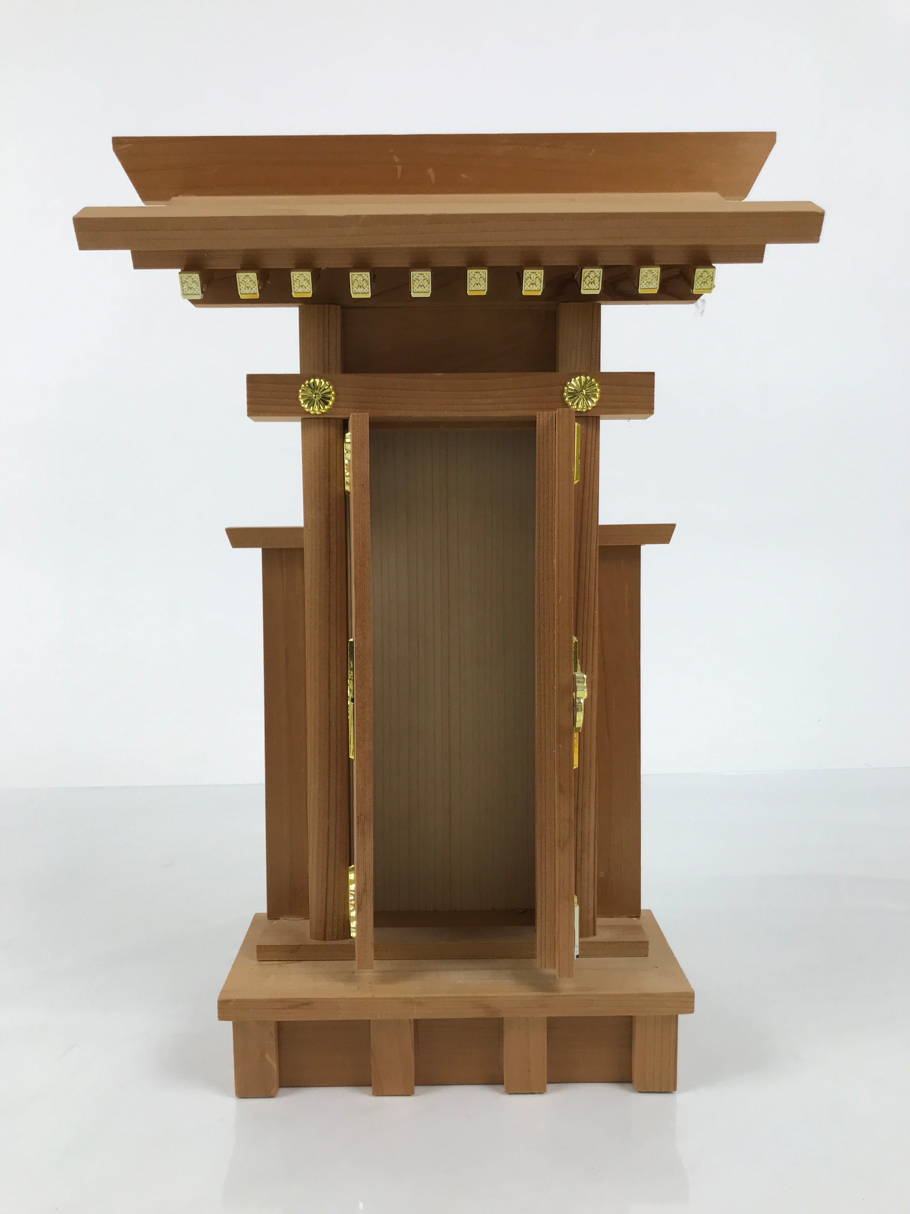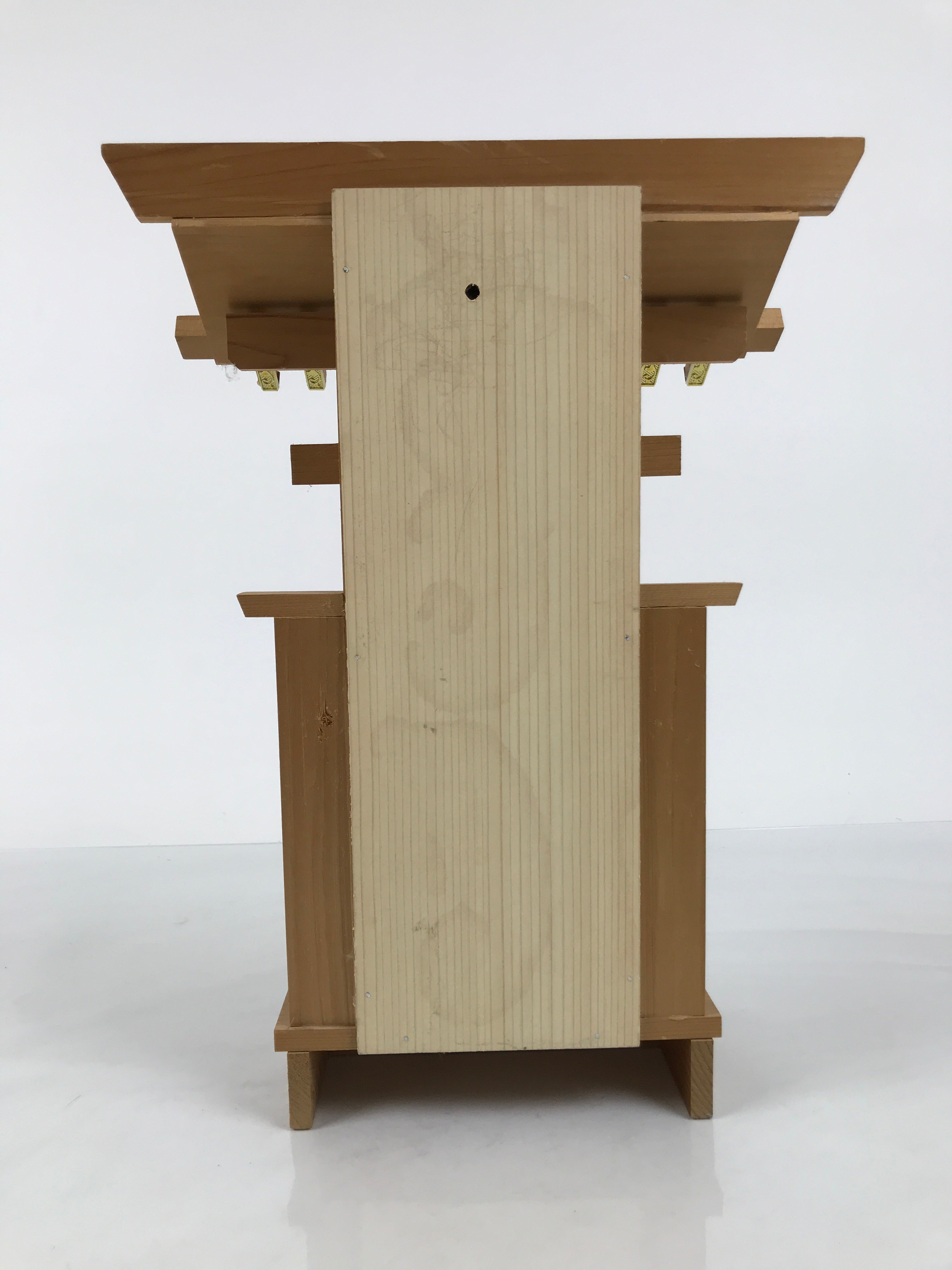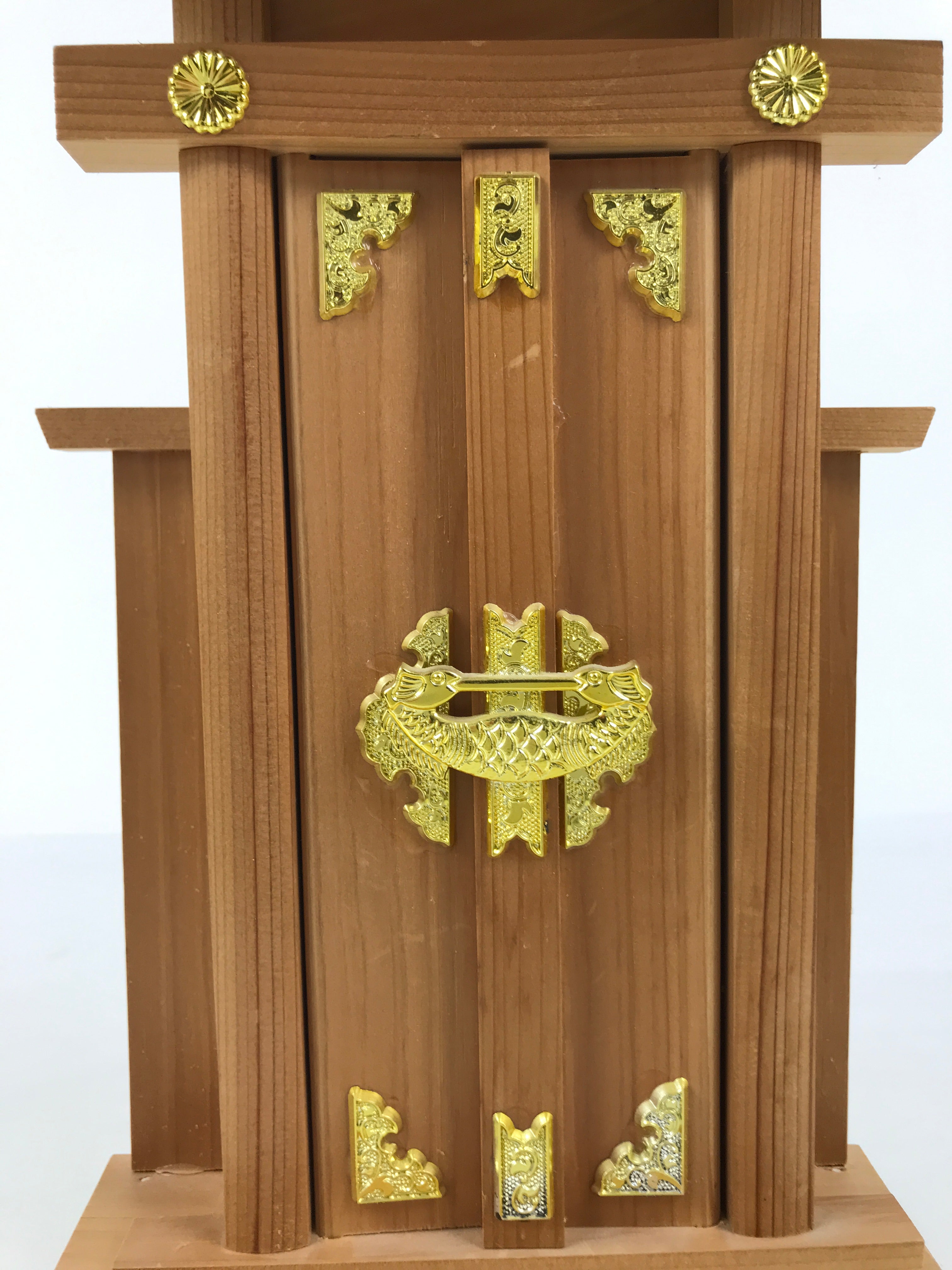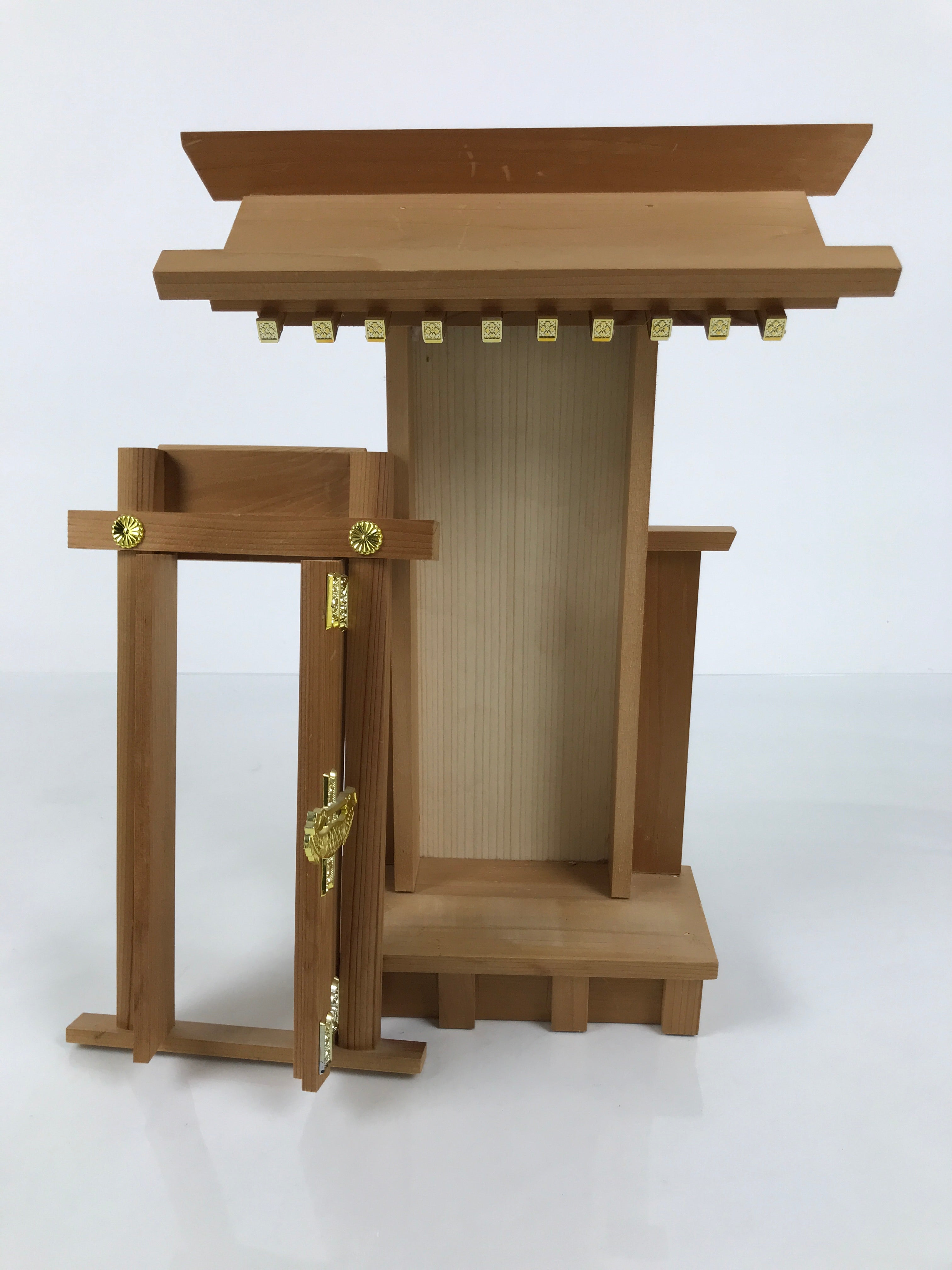 This particular vintage shrine is made of wood with gold resin decorations on the edge of the roof and on the door.. The door panel can open and is removable for easy access to the inside. It has a flat back so it can be easily installed against a wall.