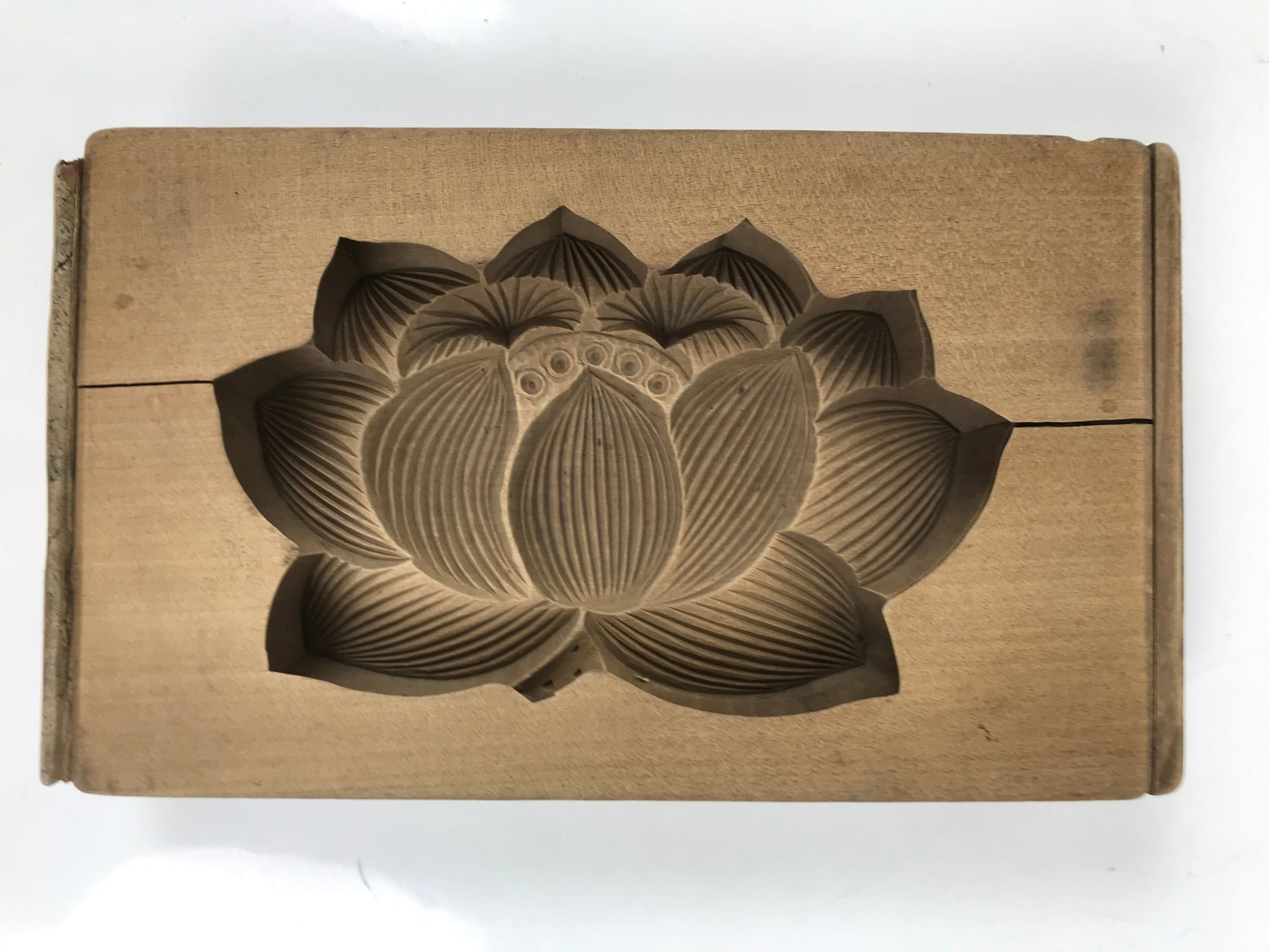 This two-panel kashigata mold is carved with the design of a lotus flower. This mold can be used to make sweets or as an eye-catching decorative item.