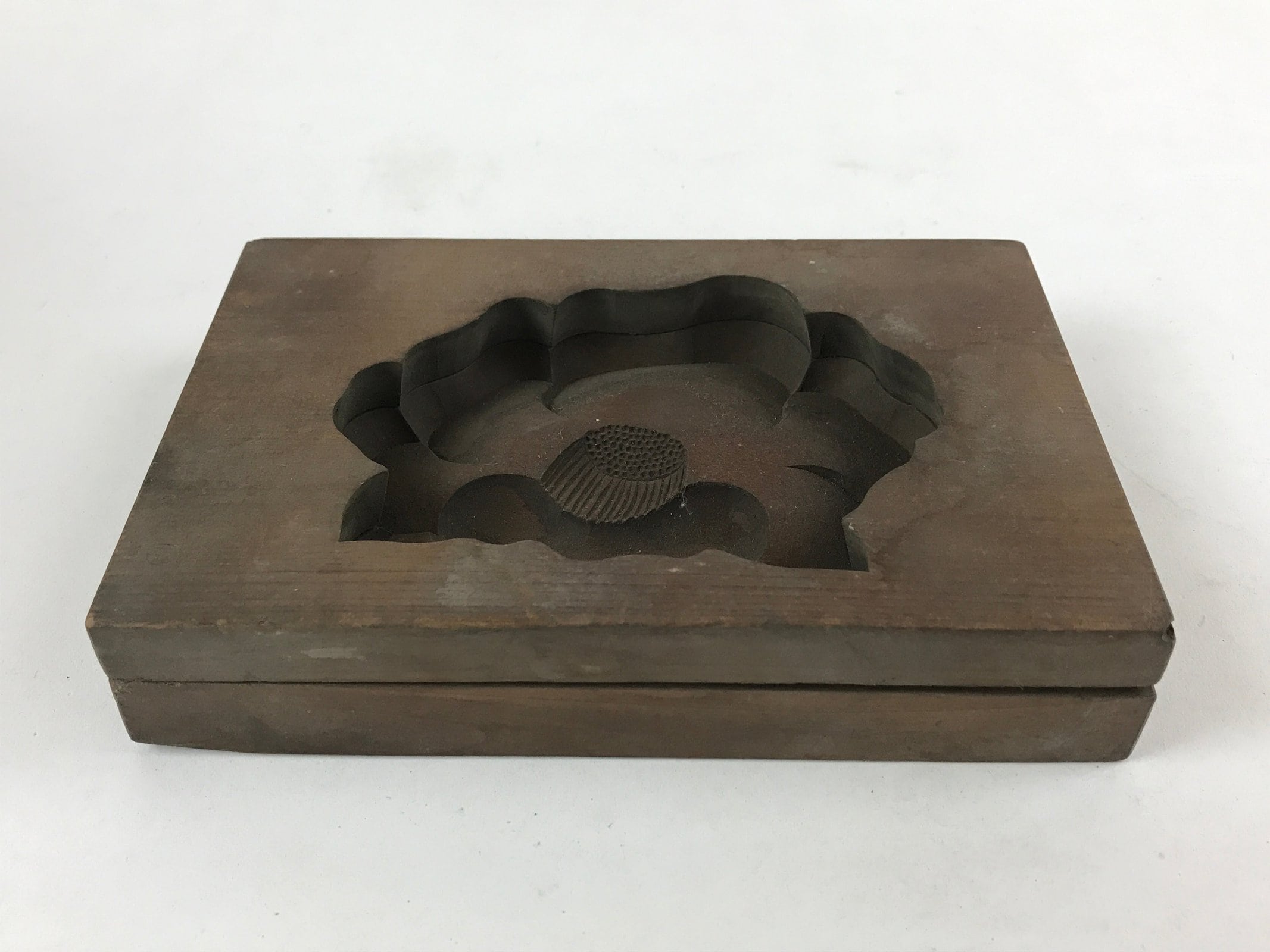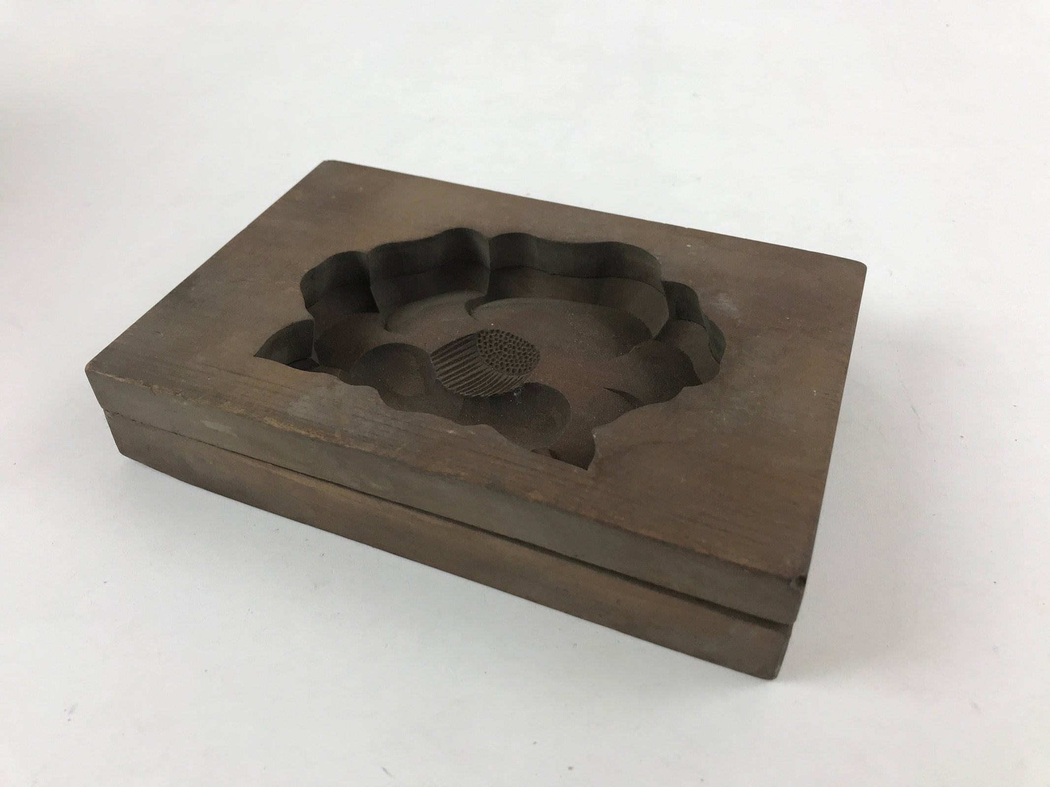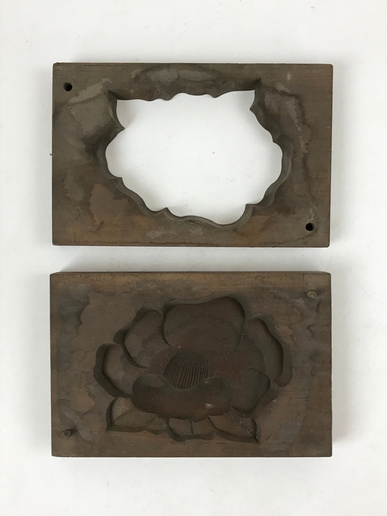 This two-piece kashigata mold is carved with a lotus flower. This mold can be used to make sweets or as an eye-catching decorative item.