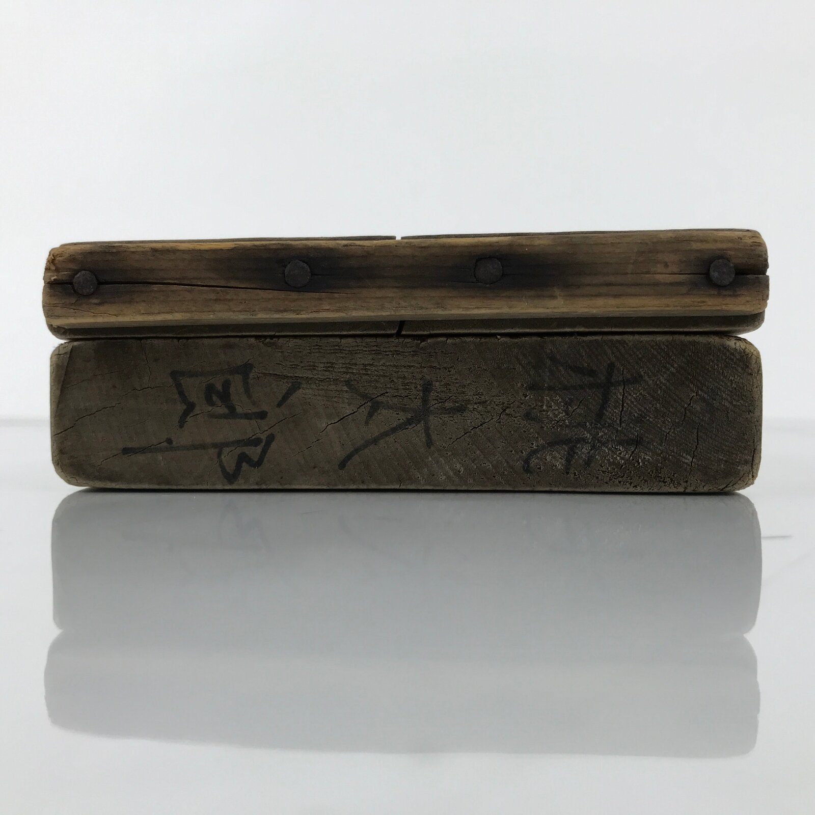 - Good condition considering its age. Discolorations and dark marks/stains. Worn edges. Crack in top panel has been previously repaired. Wear and tear due to age. Please see the photos.