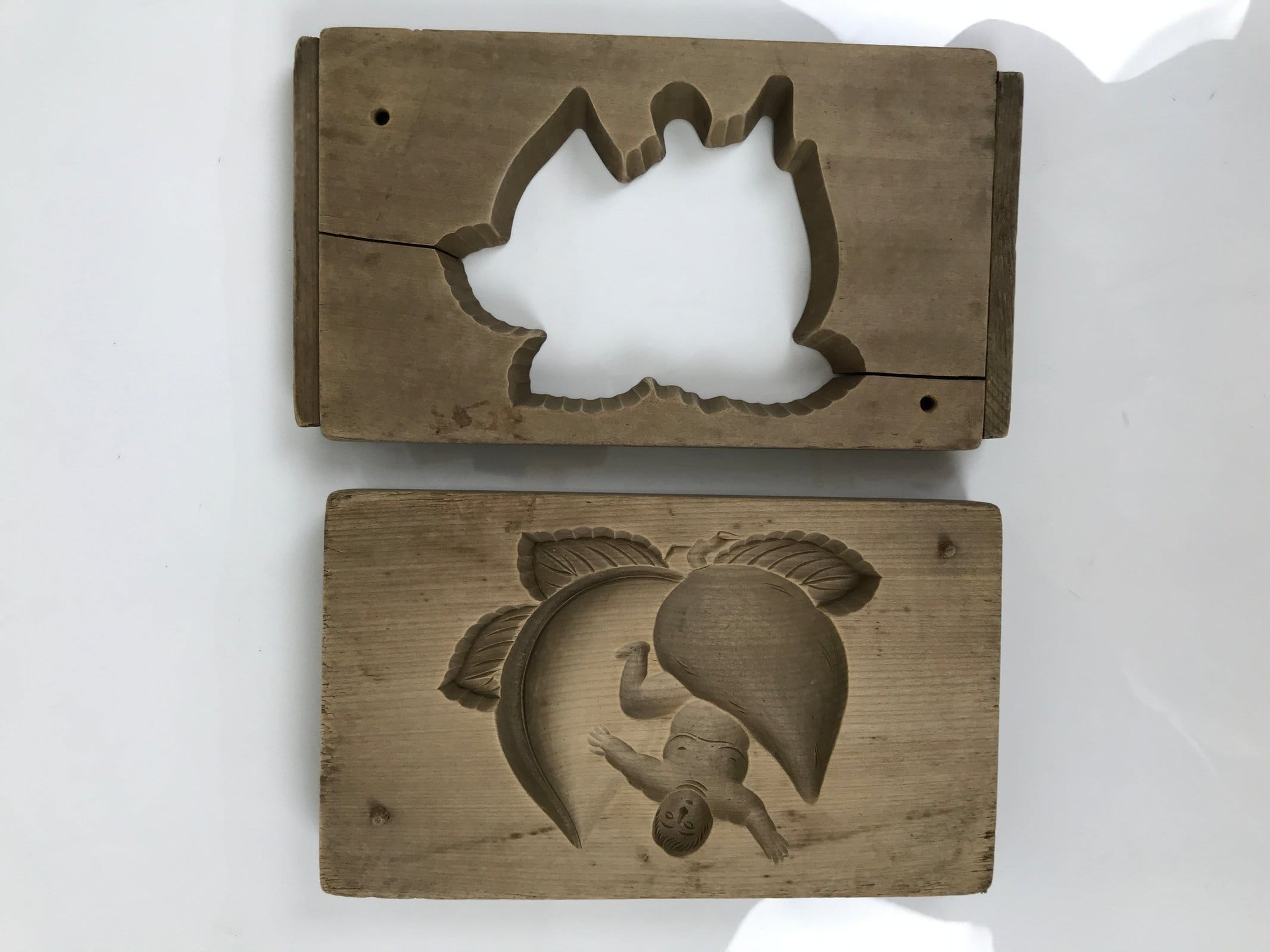 This two-panel kashigata mold is carved with the design of Momotaro, a famous story character. Momotaro was born from a peach, then once grown, he and a host of animal friends travel to an island called Onigashima where they fight oni (ogres/demons). This mold can be used to make sweets or as an eye-catching decorative item.