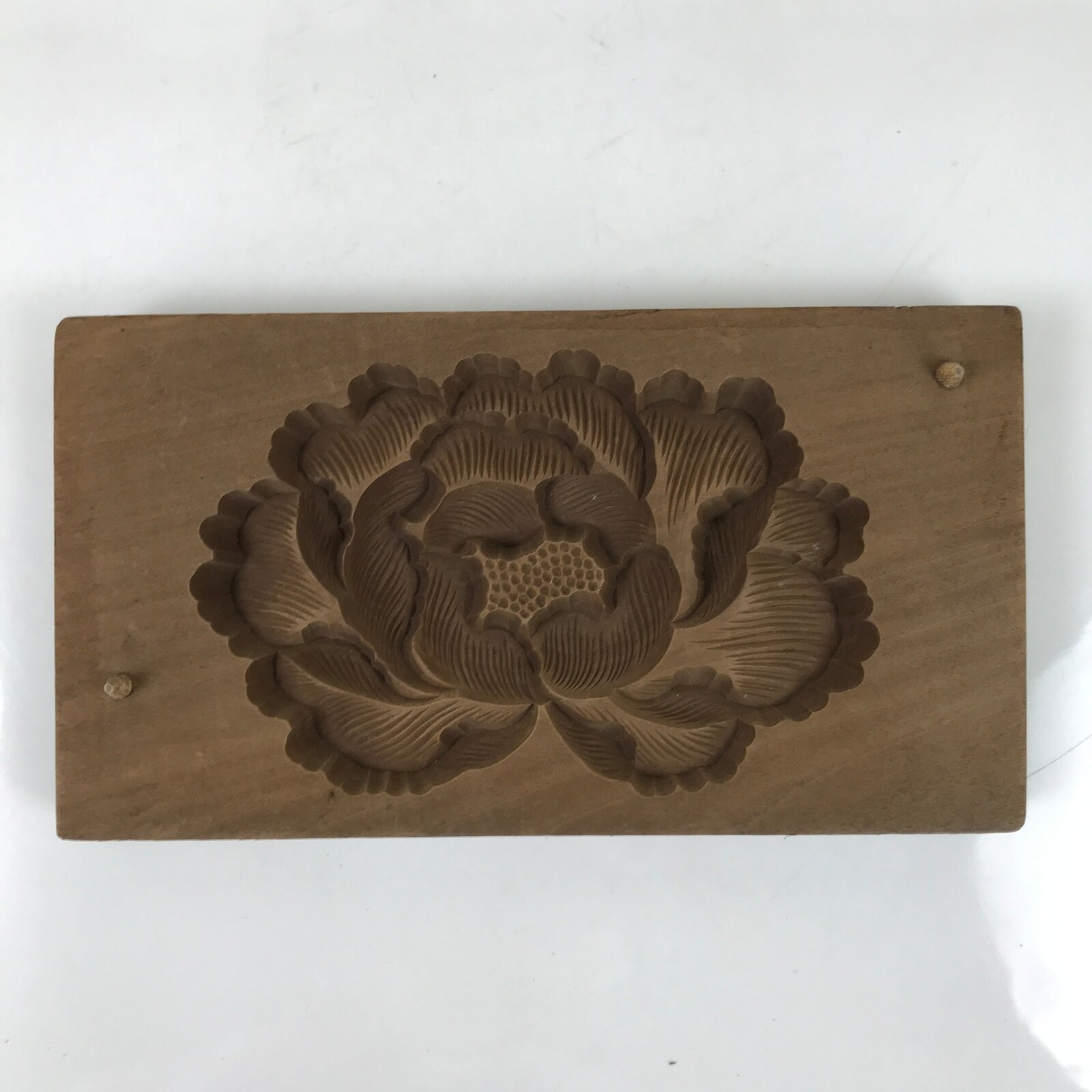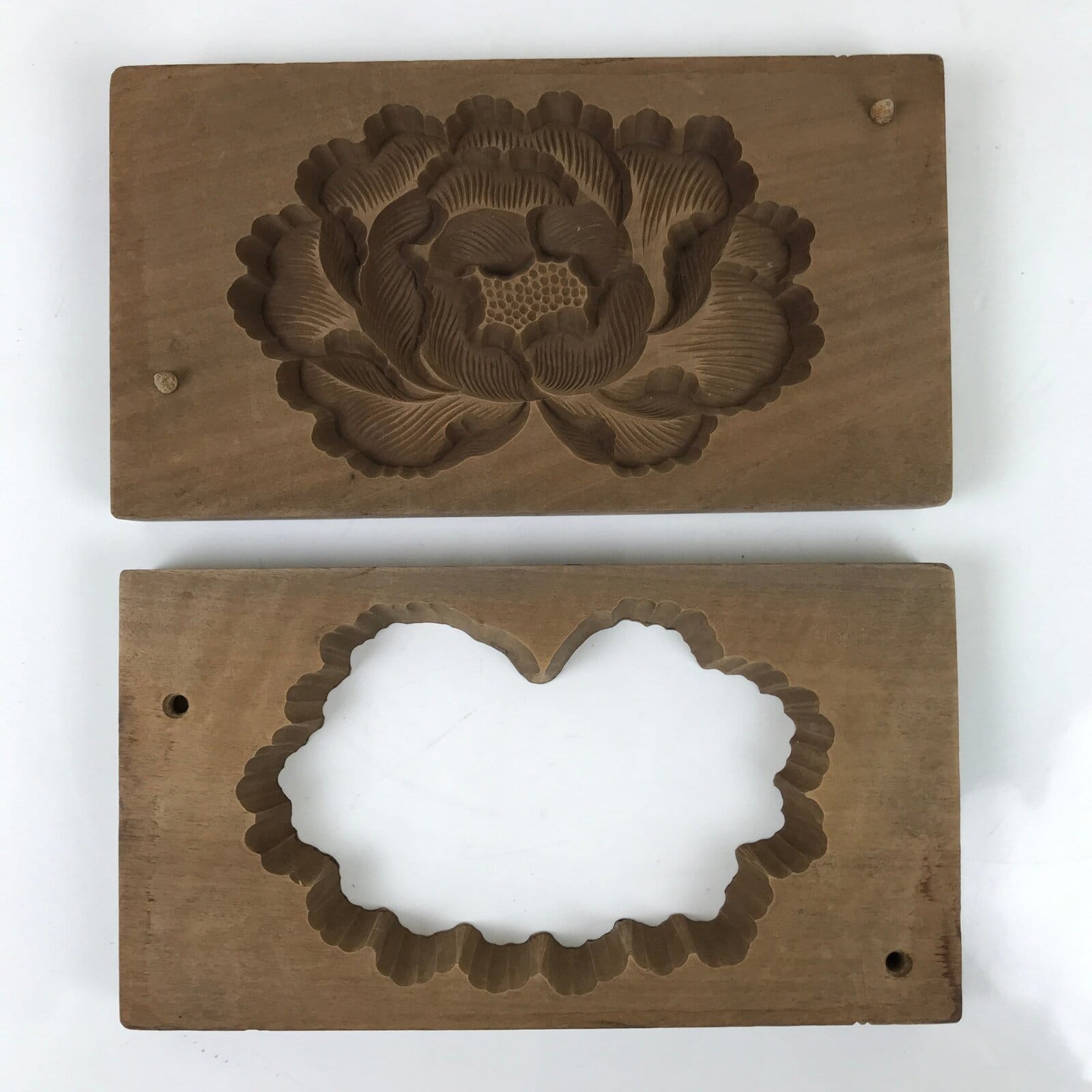 This two-panel kashigata mold is carved with the design of a full-bloom peony flower (botan). This mold can be used to make sweets or as an eye-catching decorative item.