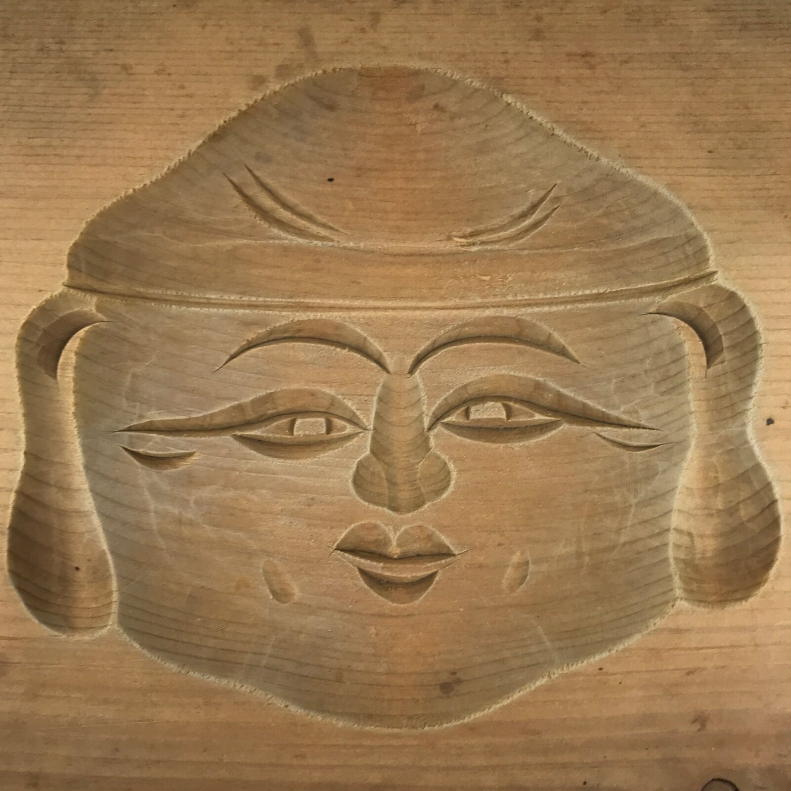 This single-panel kashigata mold is carved with the face of Ebisu, one of the Seven Lucky Gods. He is often depicted with bales of rice, a large sack, and the famous magic hammer. He symbolizes good fortune and wealth. This mold can be used to make sweets or as an eye-catching decorative item.