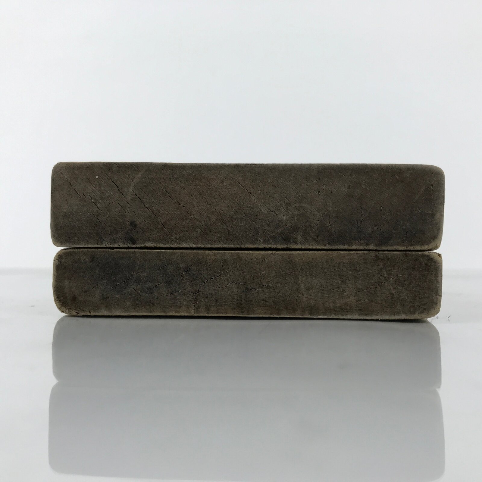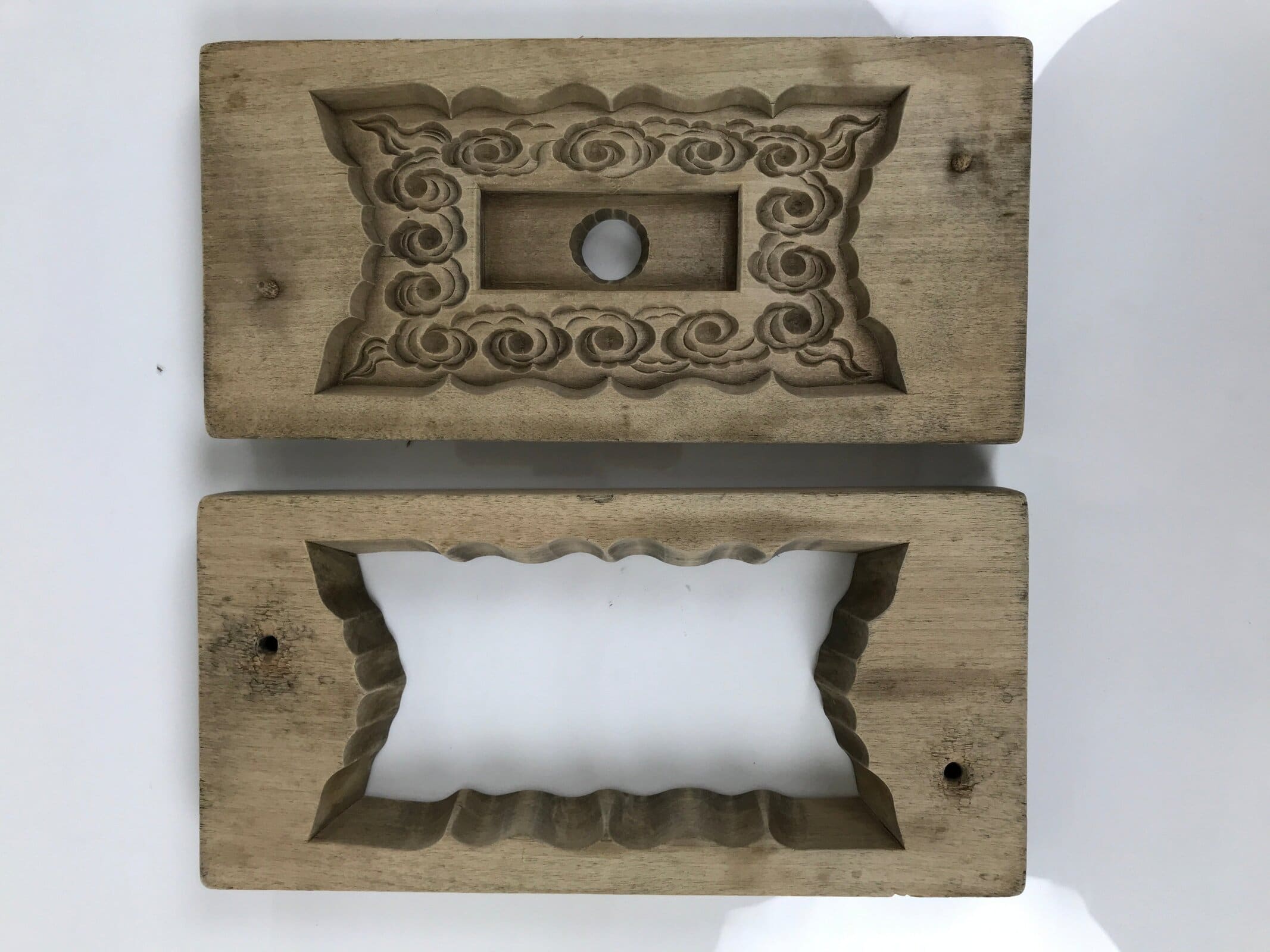 This two-panel kashigata mold is carved with the design of a frame with clouds. There is an empty spot at the center to place a smaller text kashigata piece (not included). This mold can be used to make sweets or as an eye-catching decorative item.