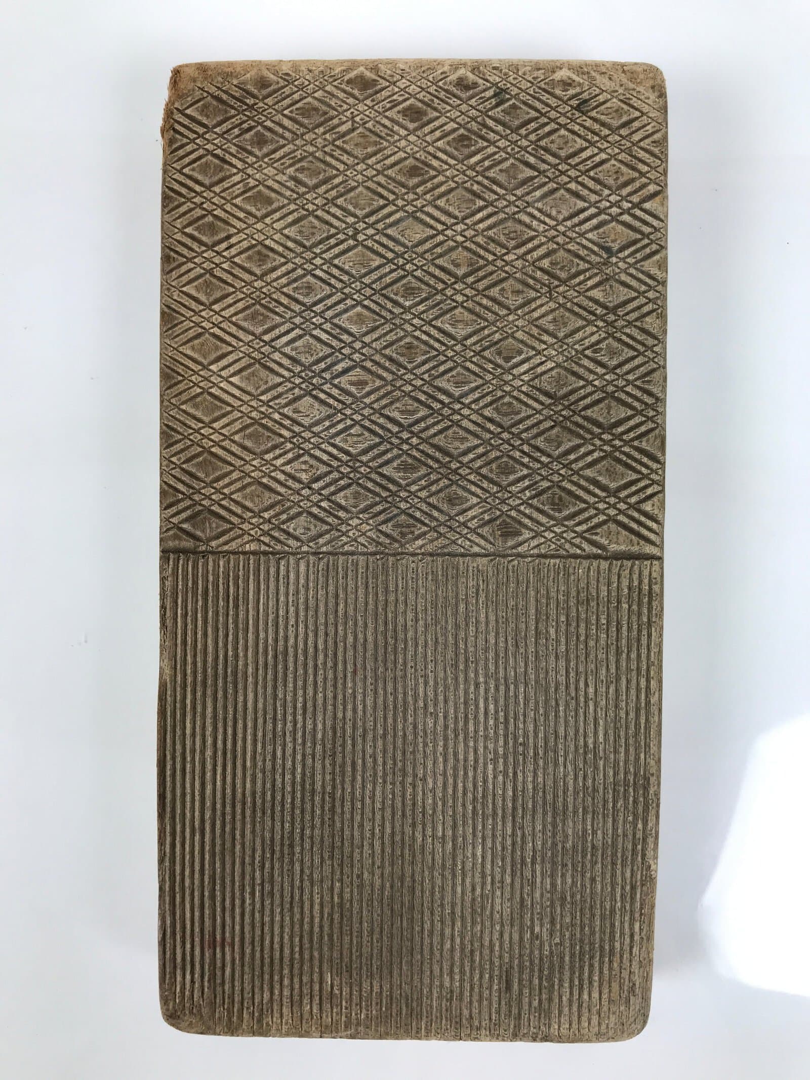 This single-panel kashigata mold is carved with two different line patterns: a simple horizontal/vertical line and a diamond (hishi) line design. It is used with other simple kashigata molds as a patterned back plate. This mold can be used to make sweets or as an eye-catching decorative item.
