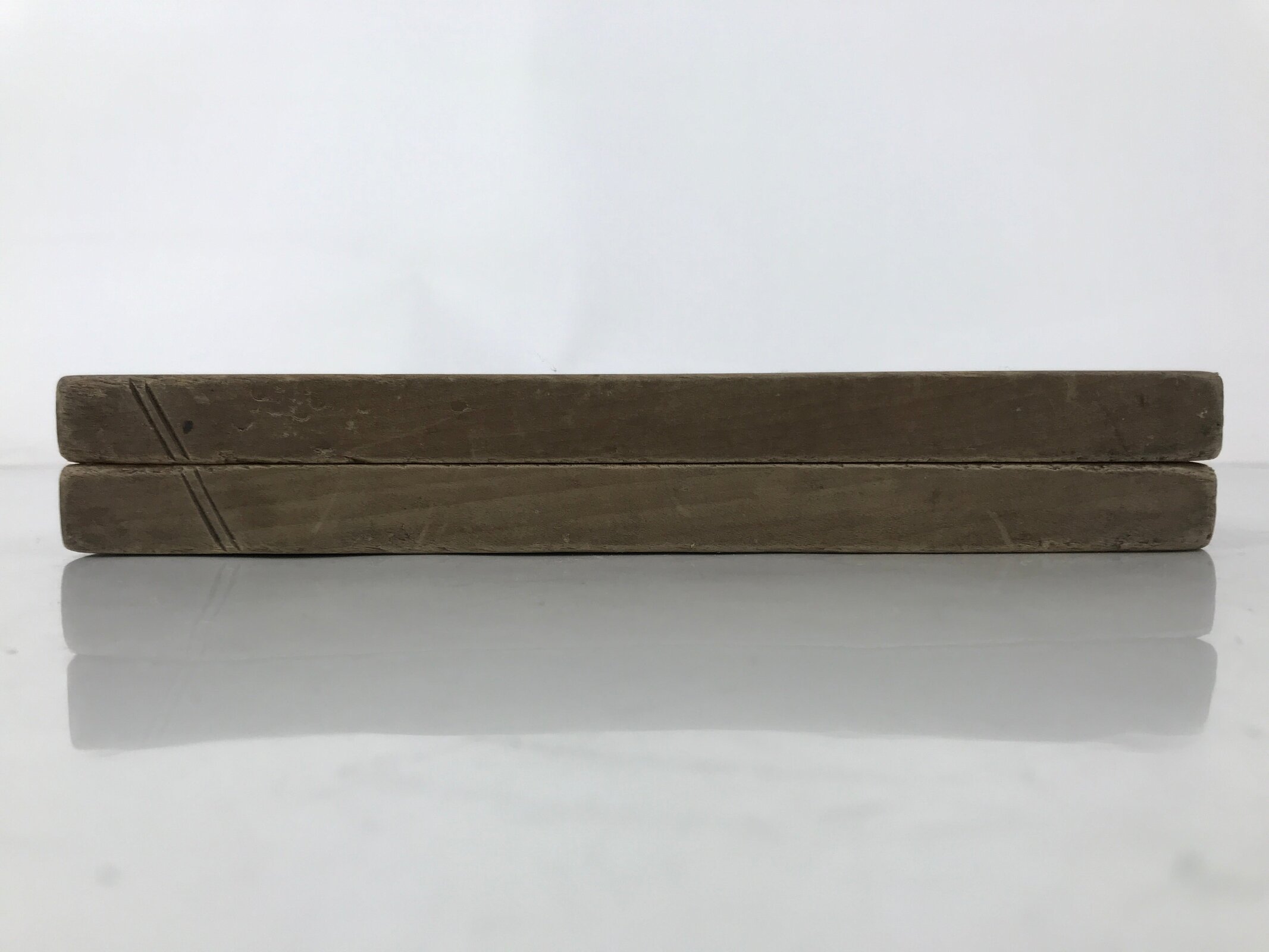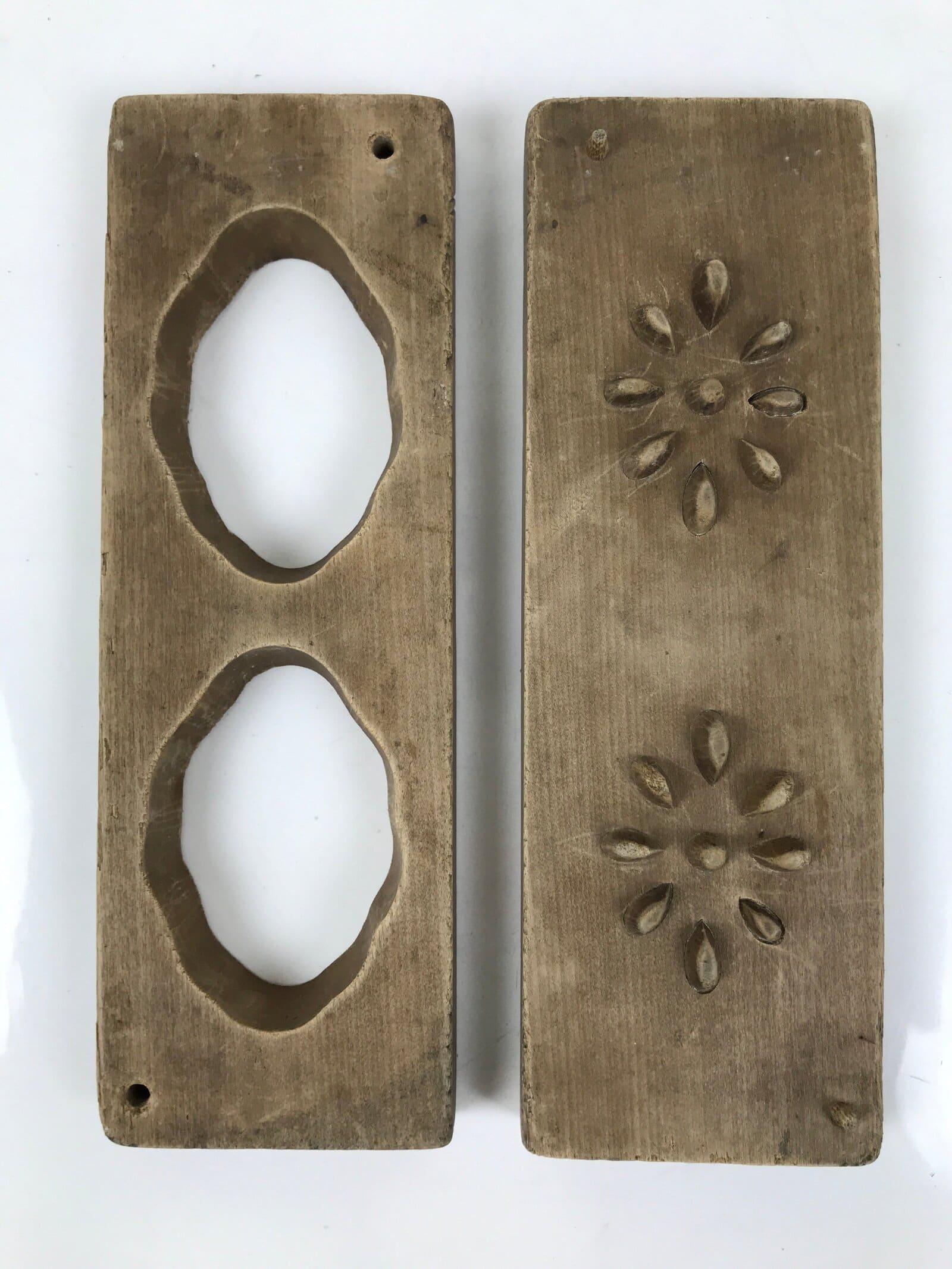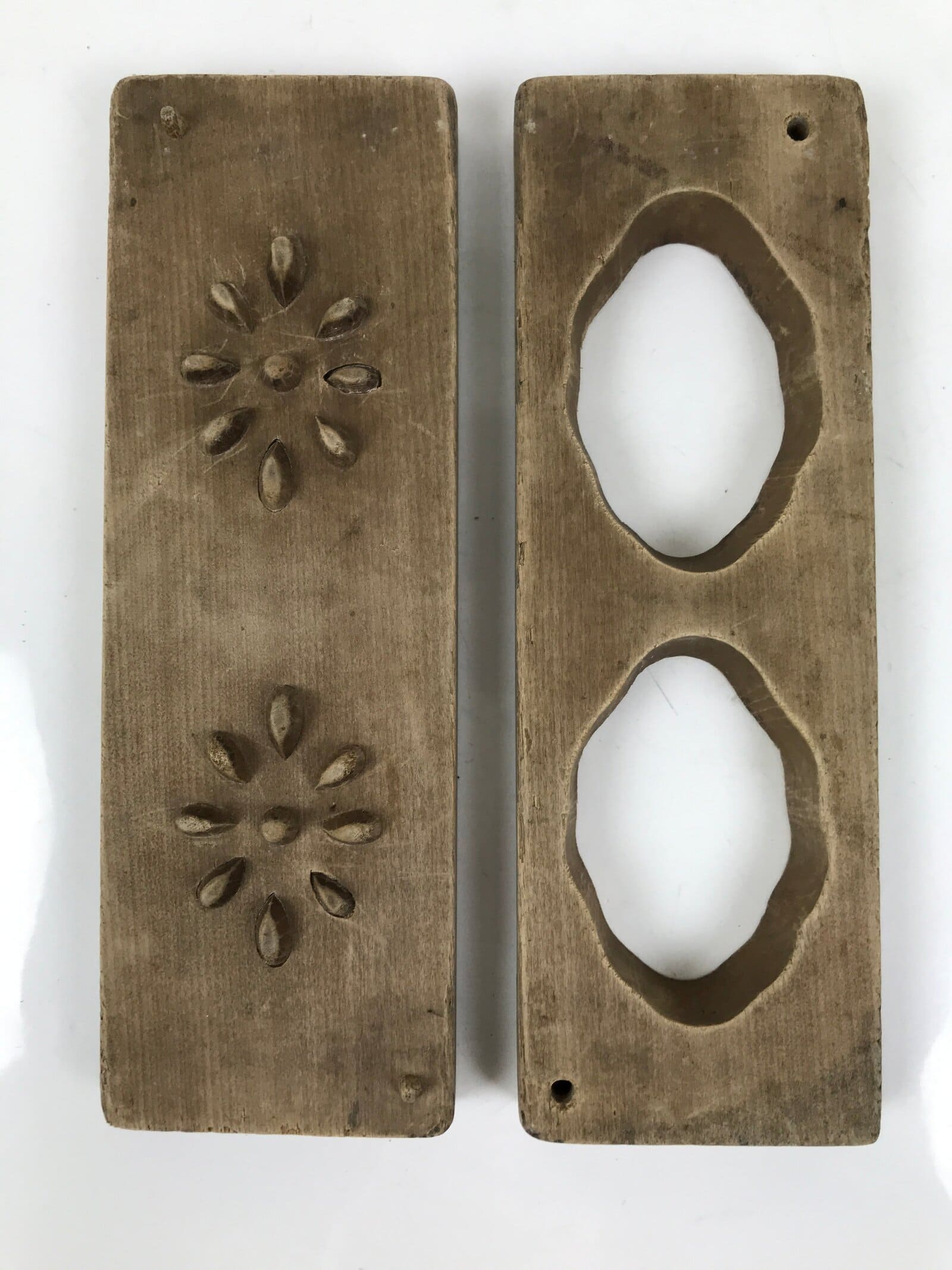This two-panel kashigata mold is carved with the design of two cut cross-sections of lotus root (renkon), a popular root vegetable used in Japanese cooking. This mold can be used to make sweets or as an eye-catching decorative item.