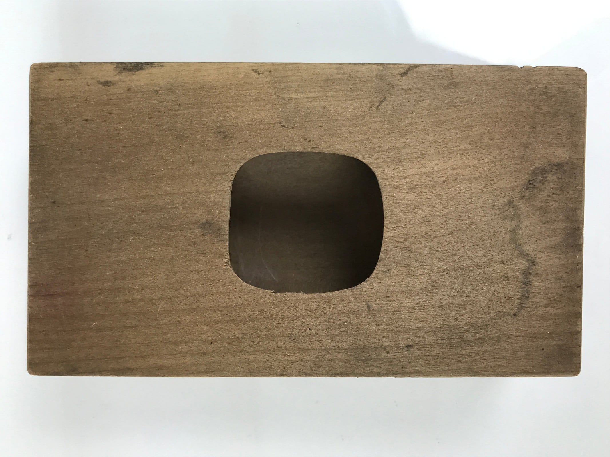 This two-panel kashigata mold is carved with the design of a simple, rounded square shape with a flat bottom for stability. There are no added designs. This item would likely have another design stamped onto it. This mold can be used to make sweets or as an eye-catching decorative item.