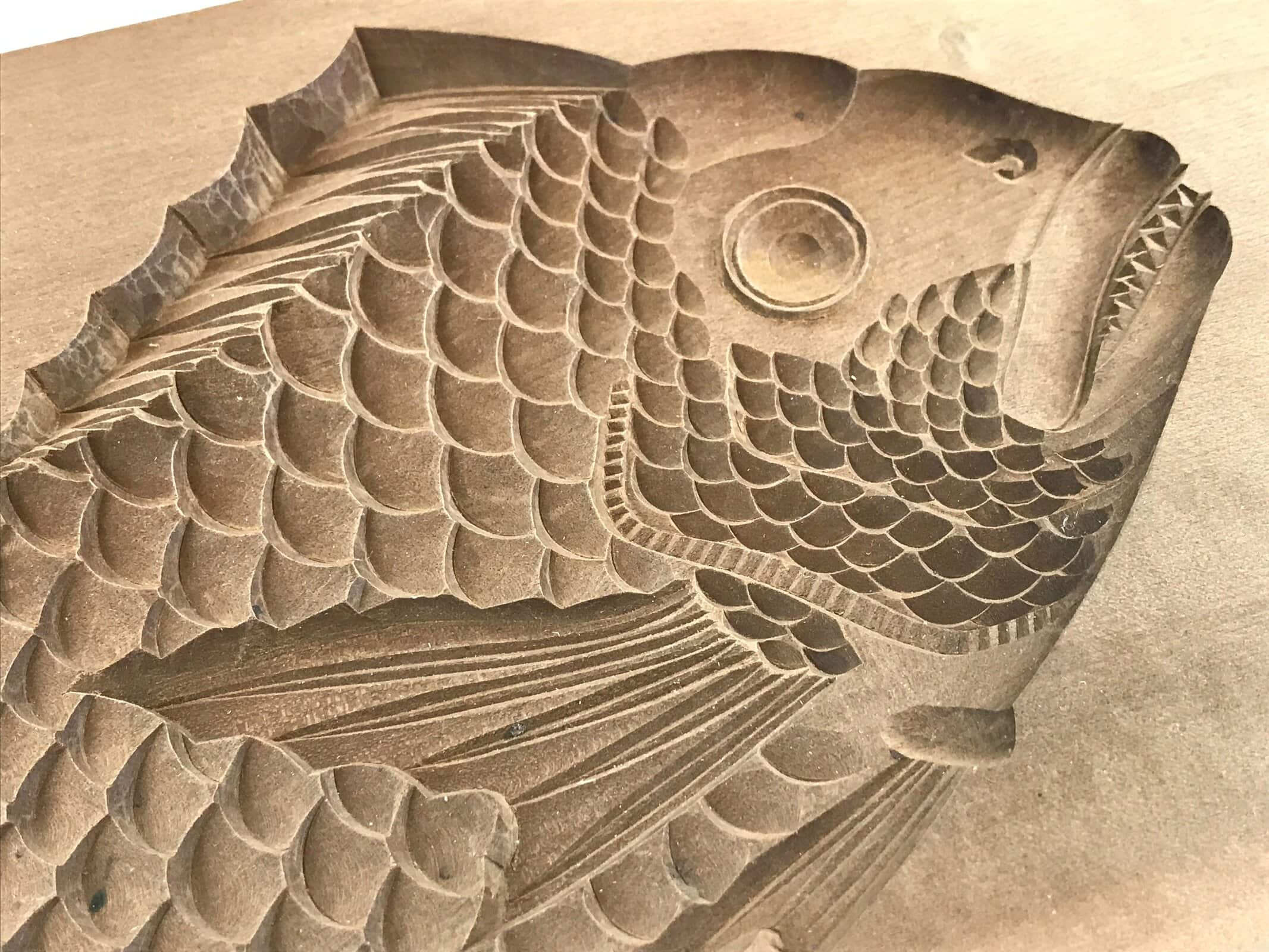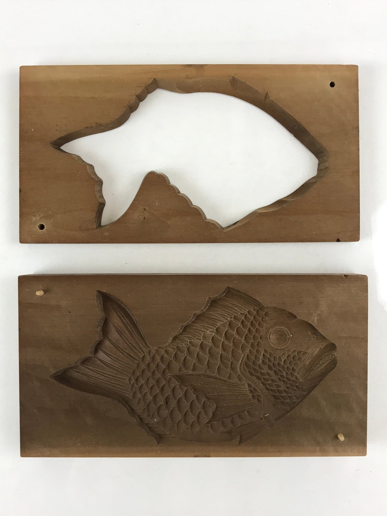This large two-piece kashigata mold is intricately carved with the image of a sea bream fish (tai). Sea Bream is a bright red fish with gold eyes and is usually associated with celebrations and symbolizes good luck. This mold can be used to make sweets or as an eye-catching decorative item.