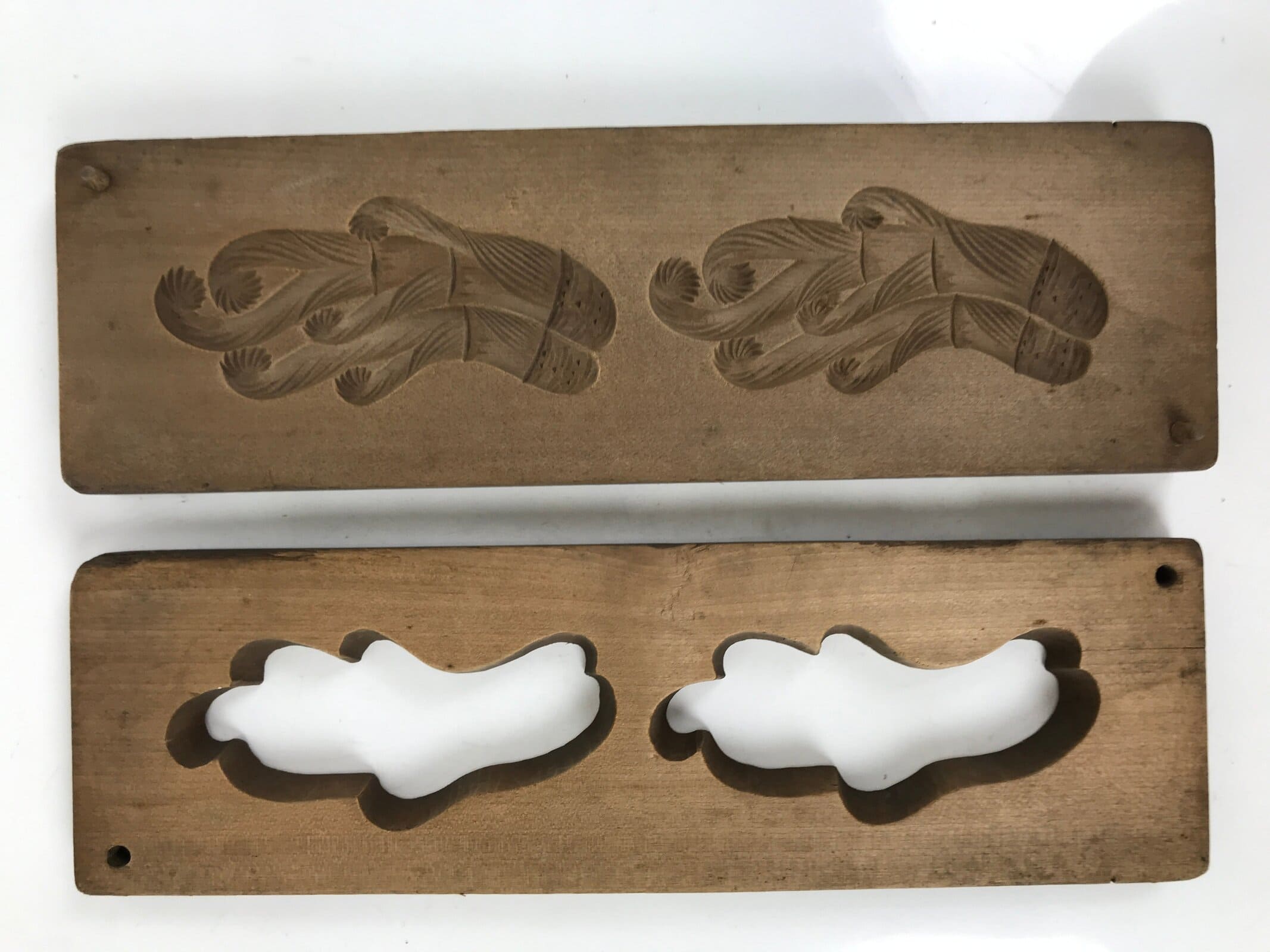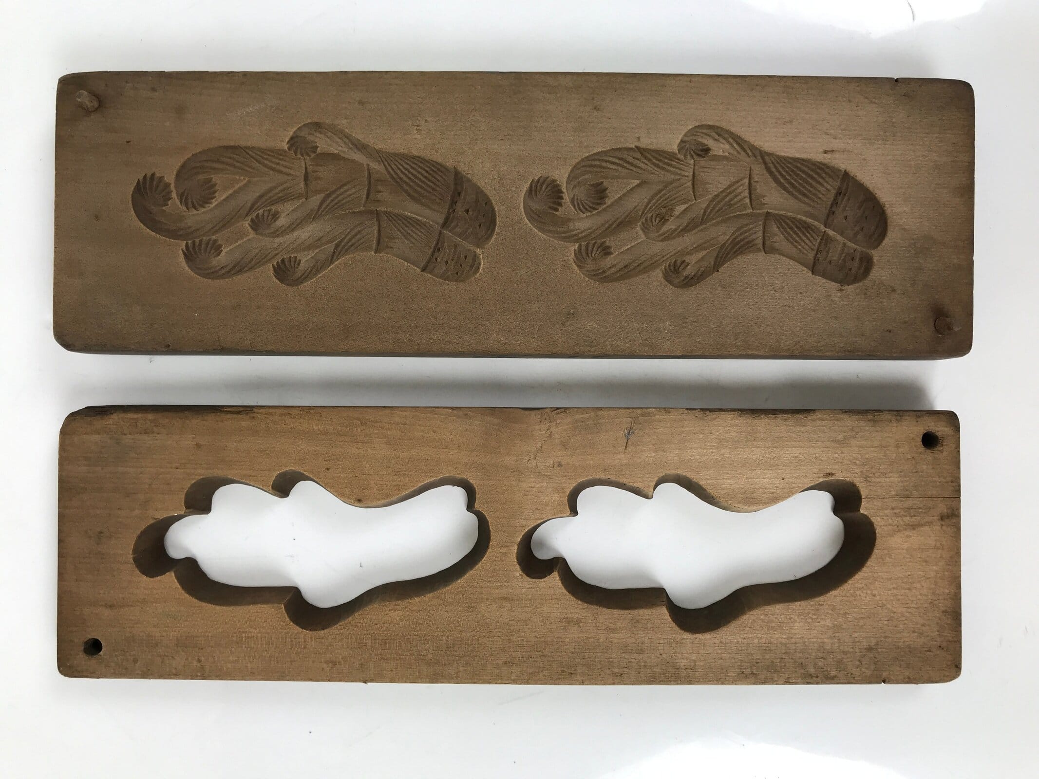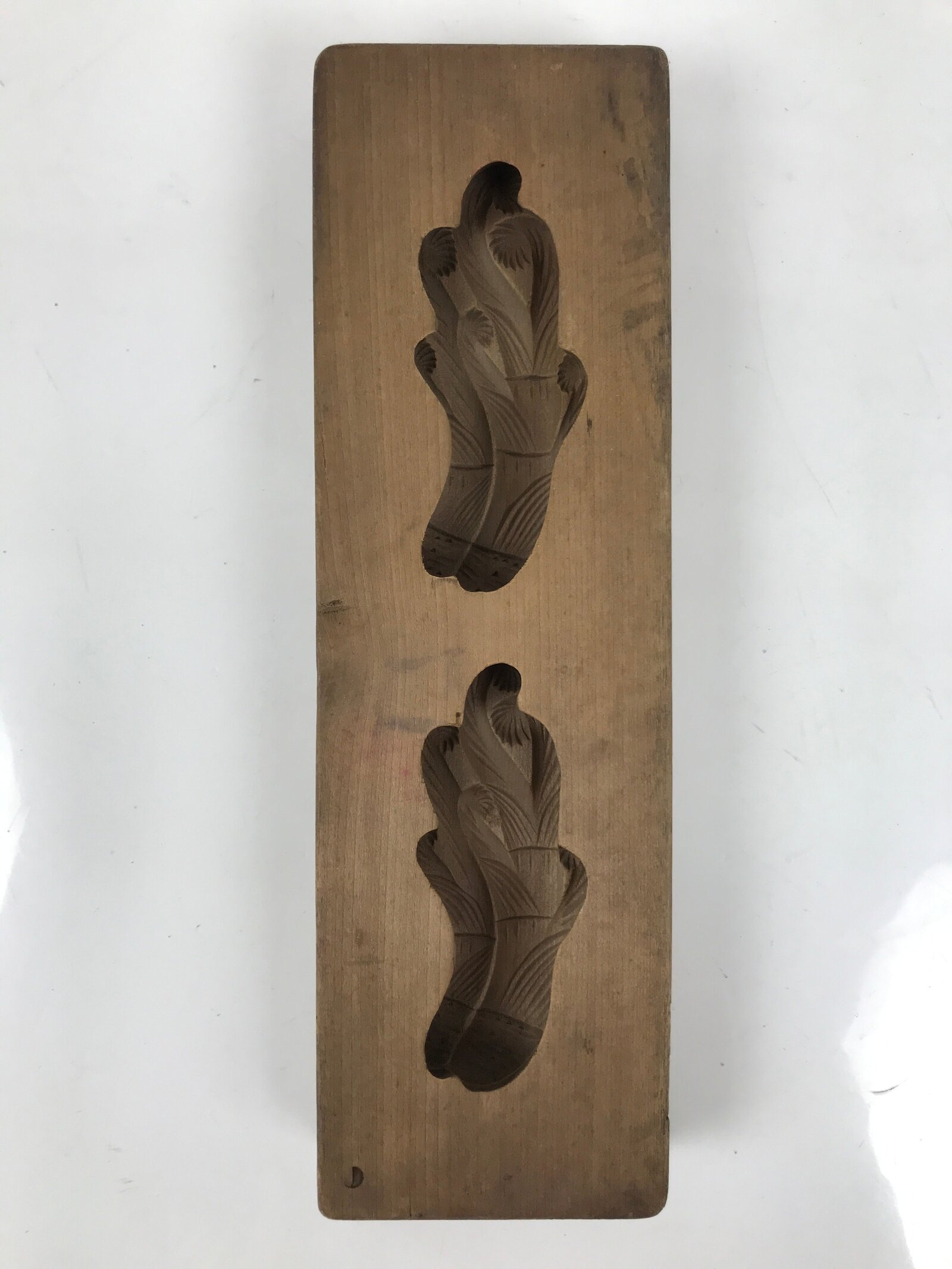 This two-panel kashigata mold is carved with two images of a type of fern called warabi which is used in both cooking and for traditional crafts such as baskets. This mold can be used to make sweets or as an eye-catching decorative item.