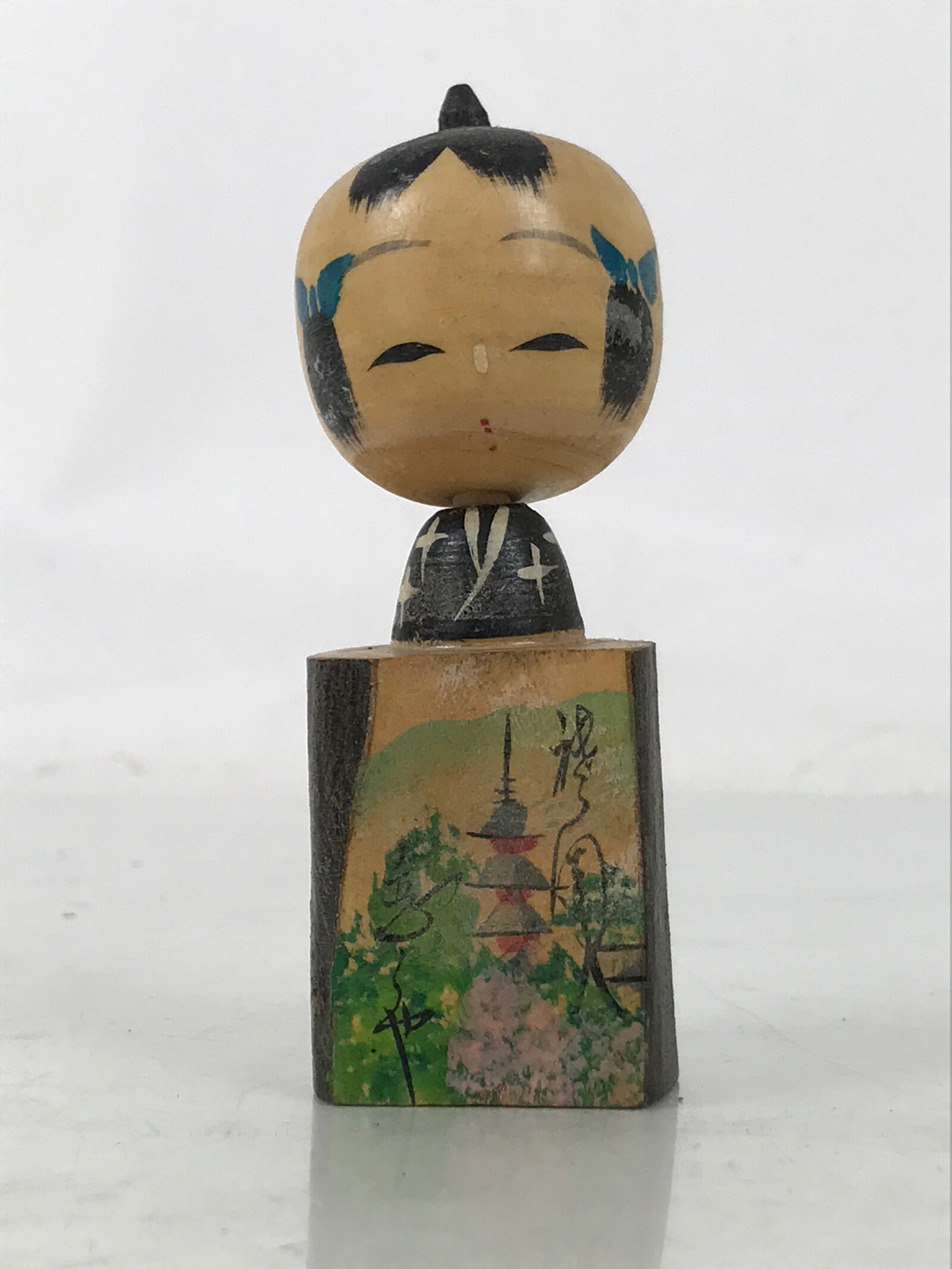 This is a vintage Japanese wooden doll figurine. It represents a boy in a black Kimono and has an old hairstyle. The head is wobbly. The body of the figurine is in a wooden cylinder that features a cut with a painting on one side. The painting depicts a pagoda at a temple, likely one of the temples in Kyoto, and trees.