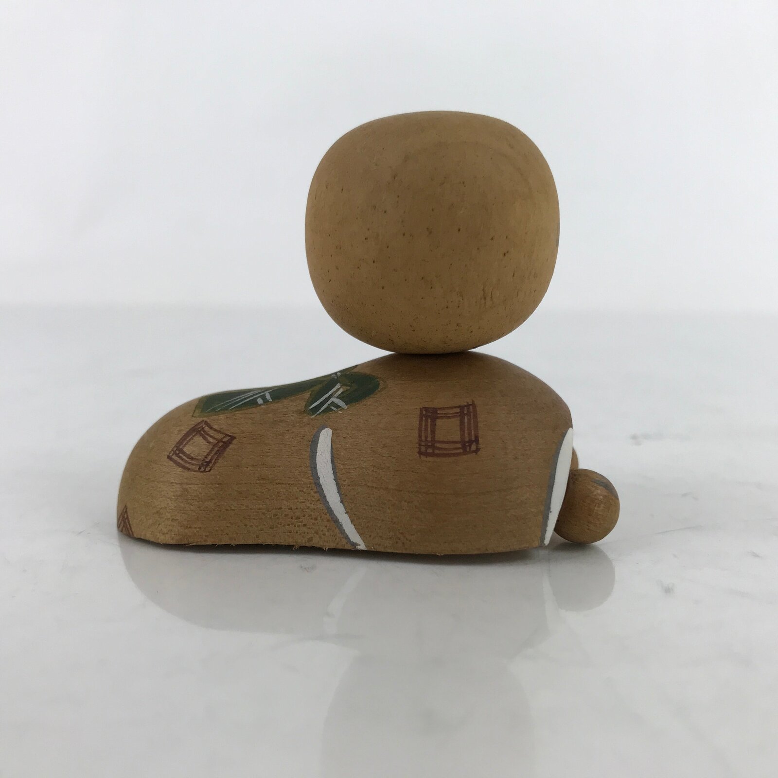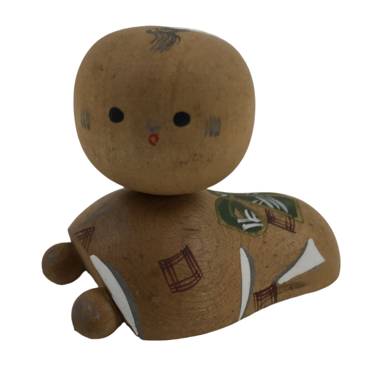This vintage Japanese wooden kokeshi doll figurine represents a crawling baby with a bobblehead. The figurine is painted with green, brown and white details, including a bow on the top. Kokeshi dolls are traditional toys.