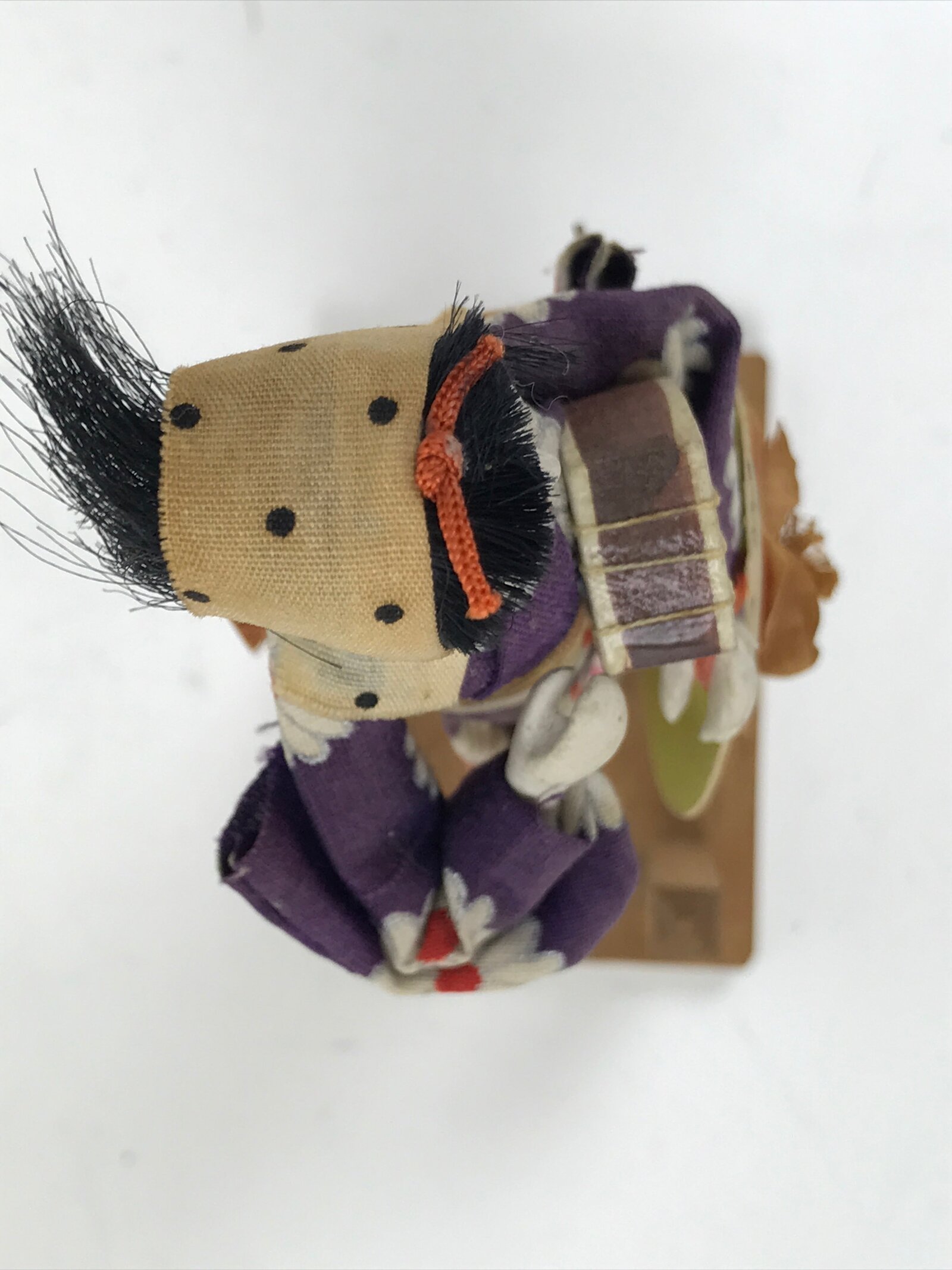 This vintage Japanese wooden kokeshi doll represents a women dressed in a purple kimono with big white and red flowers. The large obi is golden. The girl holds a shamisen and a large hat with some inscriptions. The head, hands and feet are clay. The doll is attached to a wooden base.