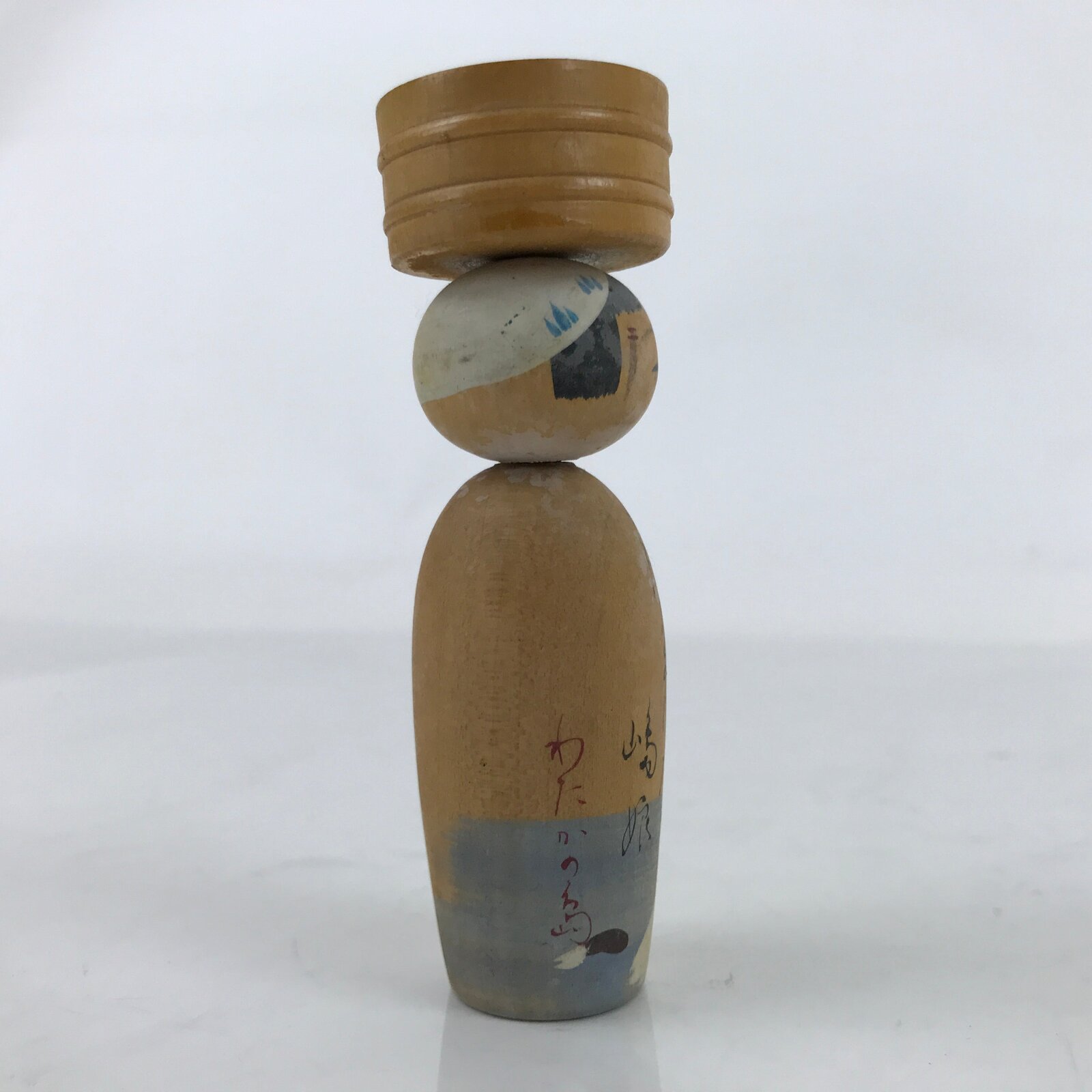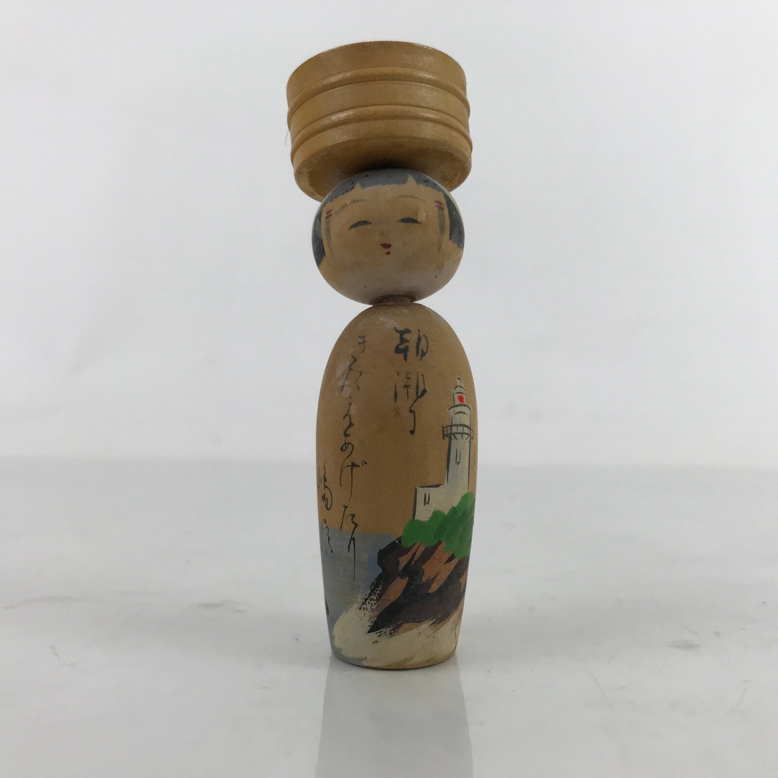 This vintage Japanese wooden kokeshi doll figurine features a painted lighthouse with calligraphy on the front. The doll has a hoke, a wooden basket, on its head with a pearl bead glued inside it. According to the inscriptions, it is the Anorisaki lighthouse located in Watakanojima Island (Mie prefecture). Kokeshi dolls are traditional toys that can easily be used for decorative purposes.