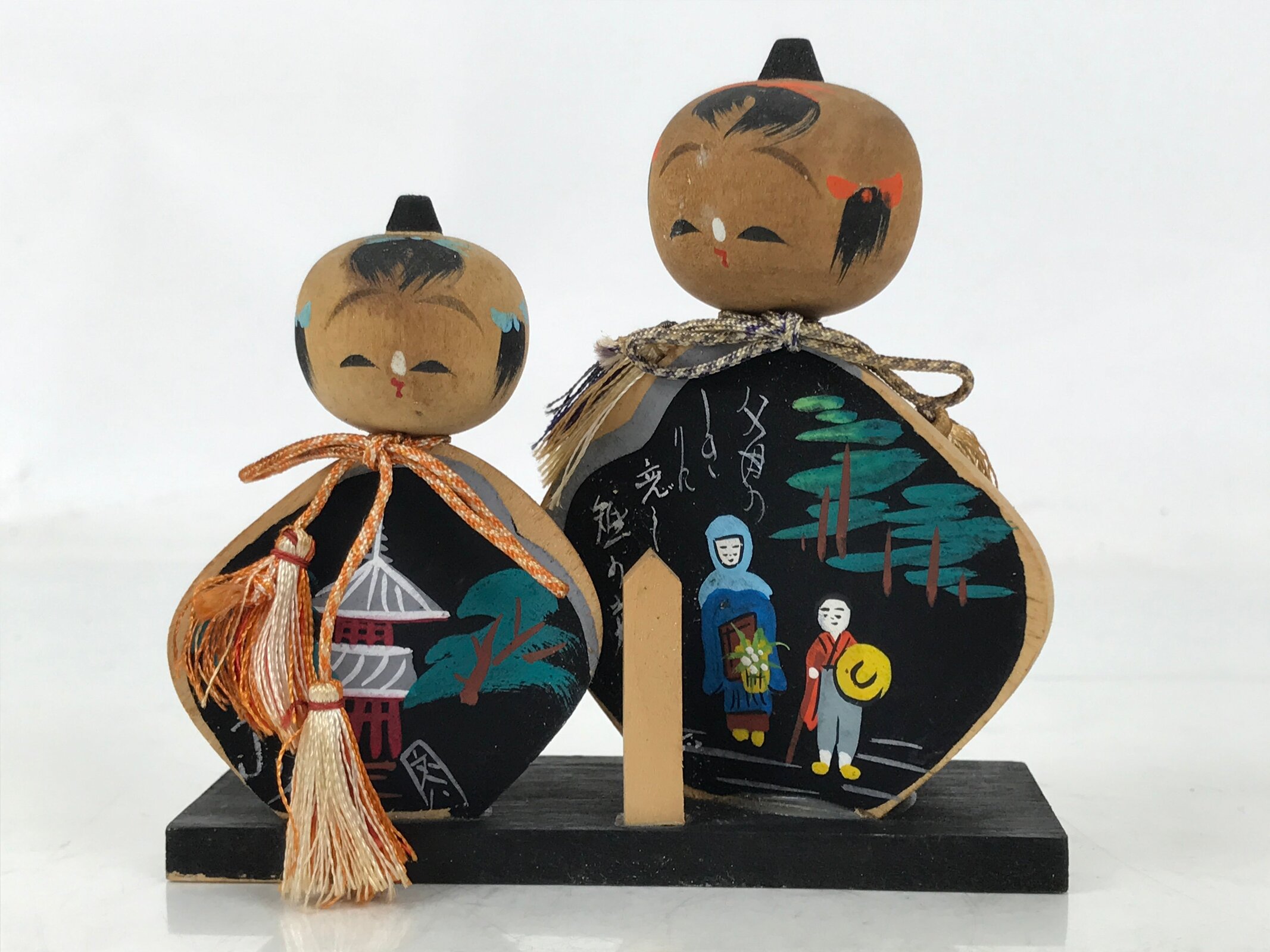 This vintage Japanese wooden kokeshi figurine consists of two dolls with illustrations painted on the front. On the right, the illustration represents two people walking next to trees, with a haiku poem from Matsuo Basho. On the left, there is a picture of the temple with trees and an inscription: Mount Koya.