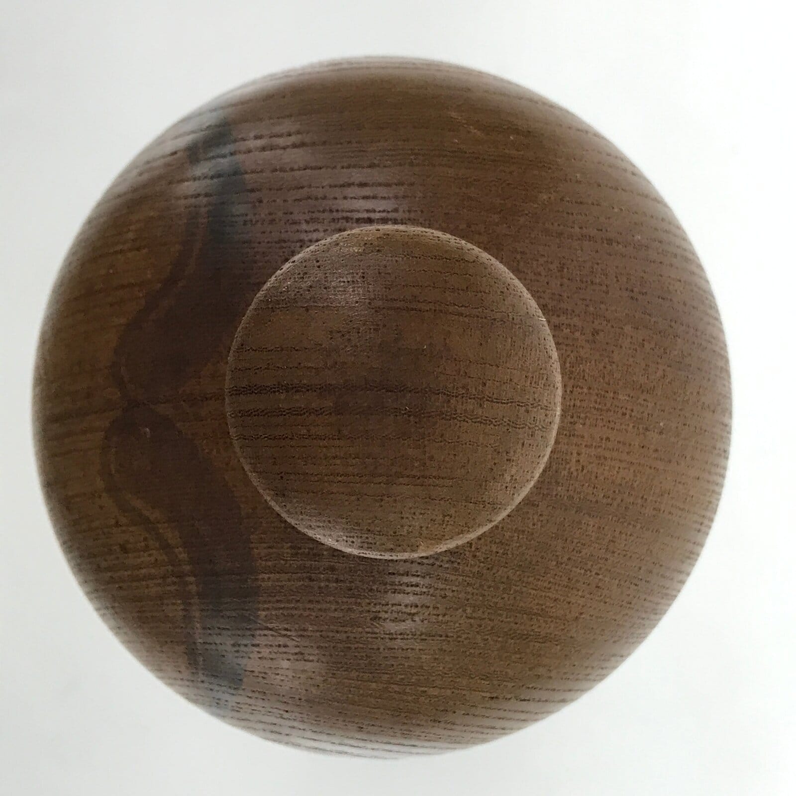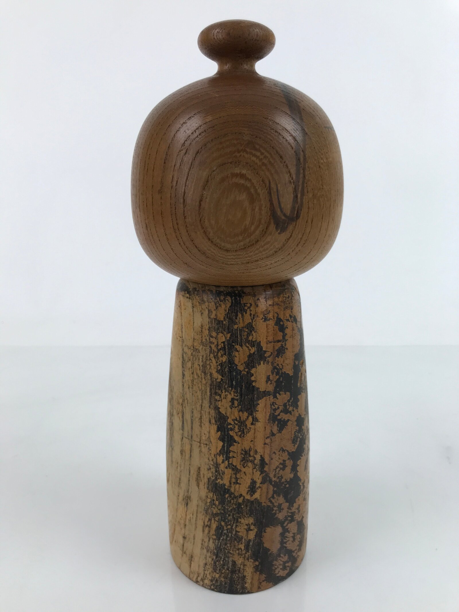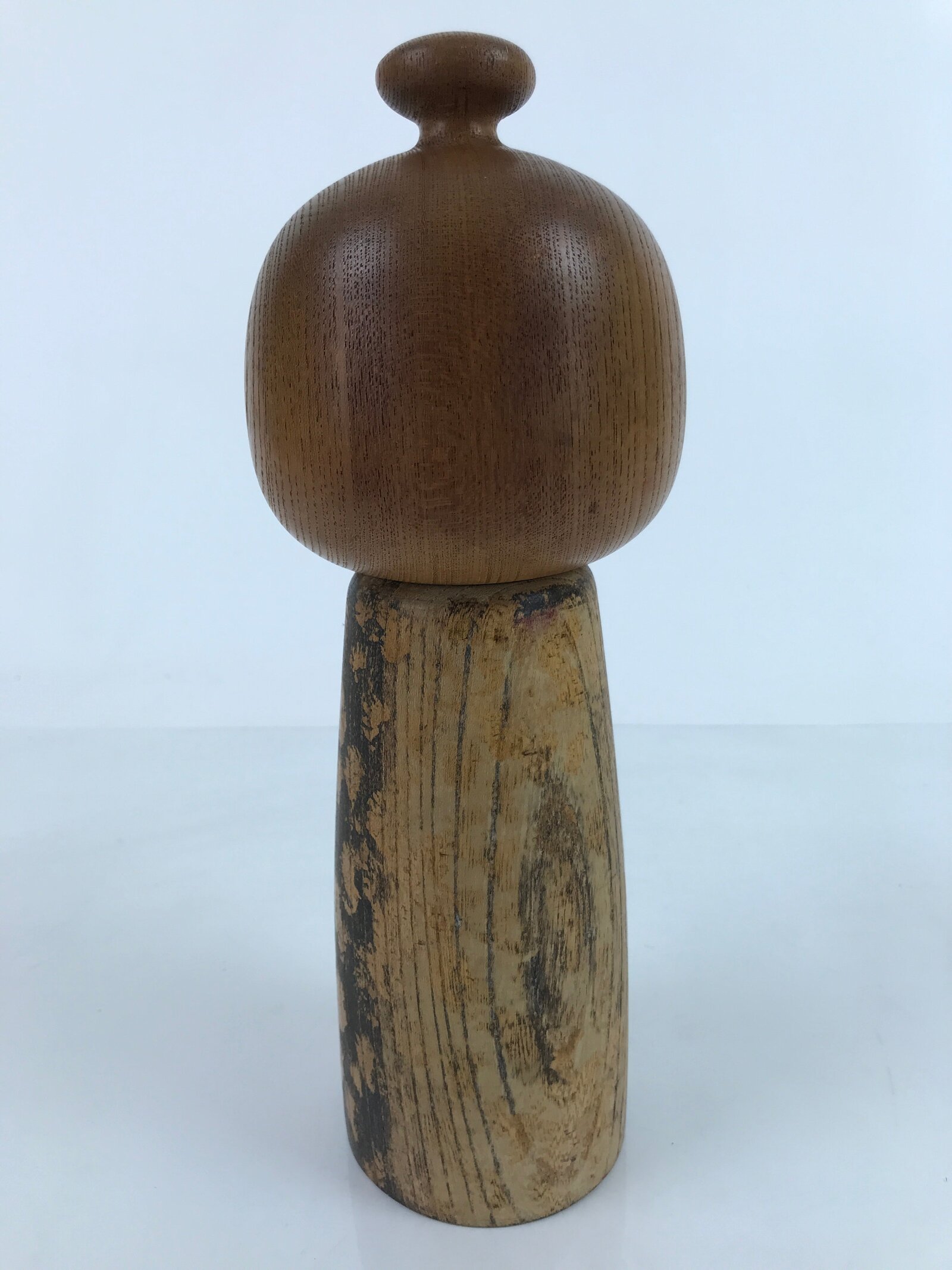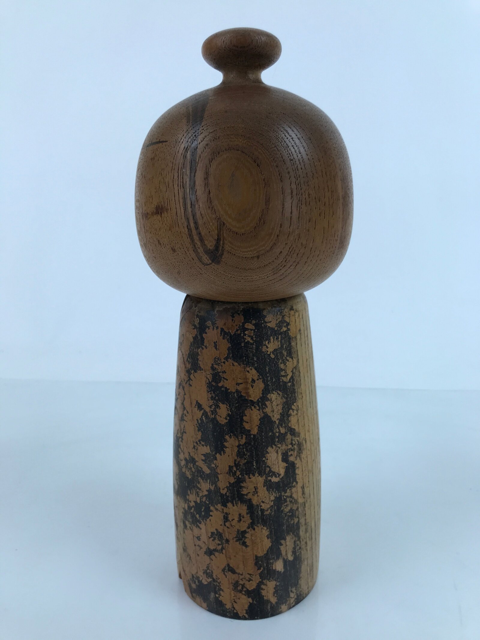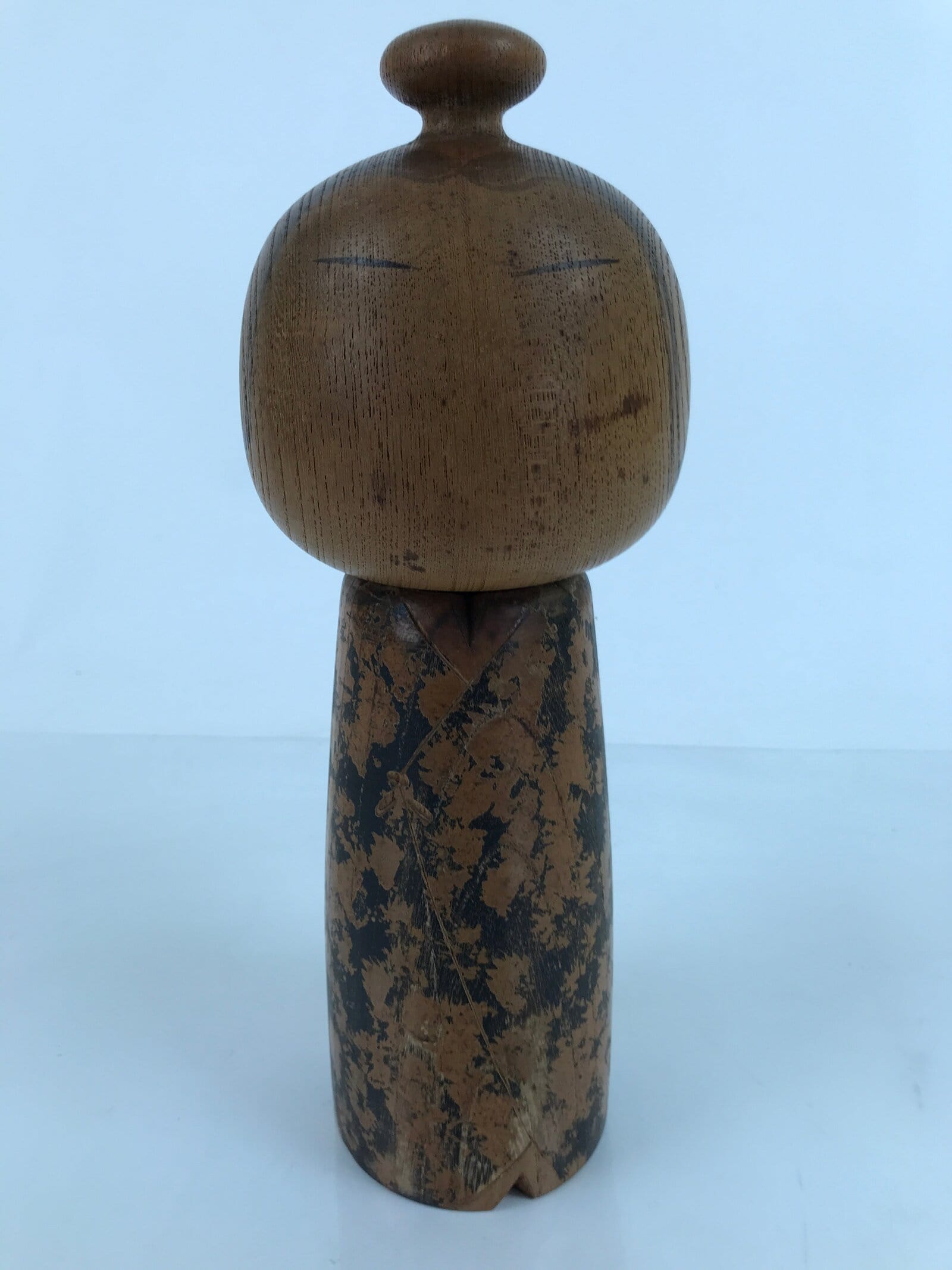 This is a vintage Japanese wooden kokeshi doll figurine. Kokeshi are simple wooden Japanese dolls with no arms or legs that have been crafted for more than 150 years as a toy for children. This stout kokeshi doll does not have a face other than eyebrows, and it has a carved and painted kimono on the body. There is a knob on the top to symbolize perhaps a bun or top knot.