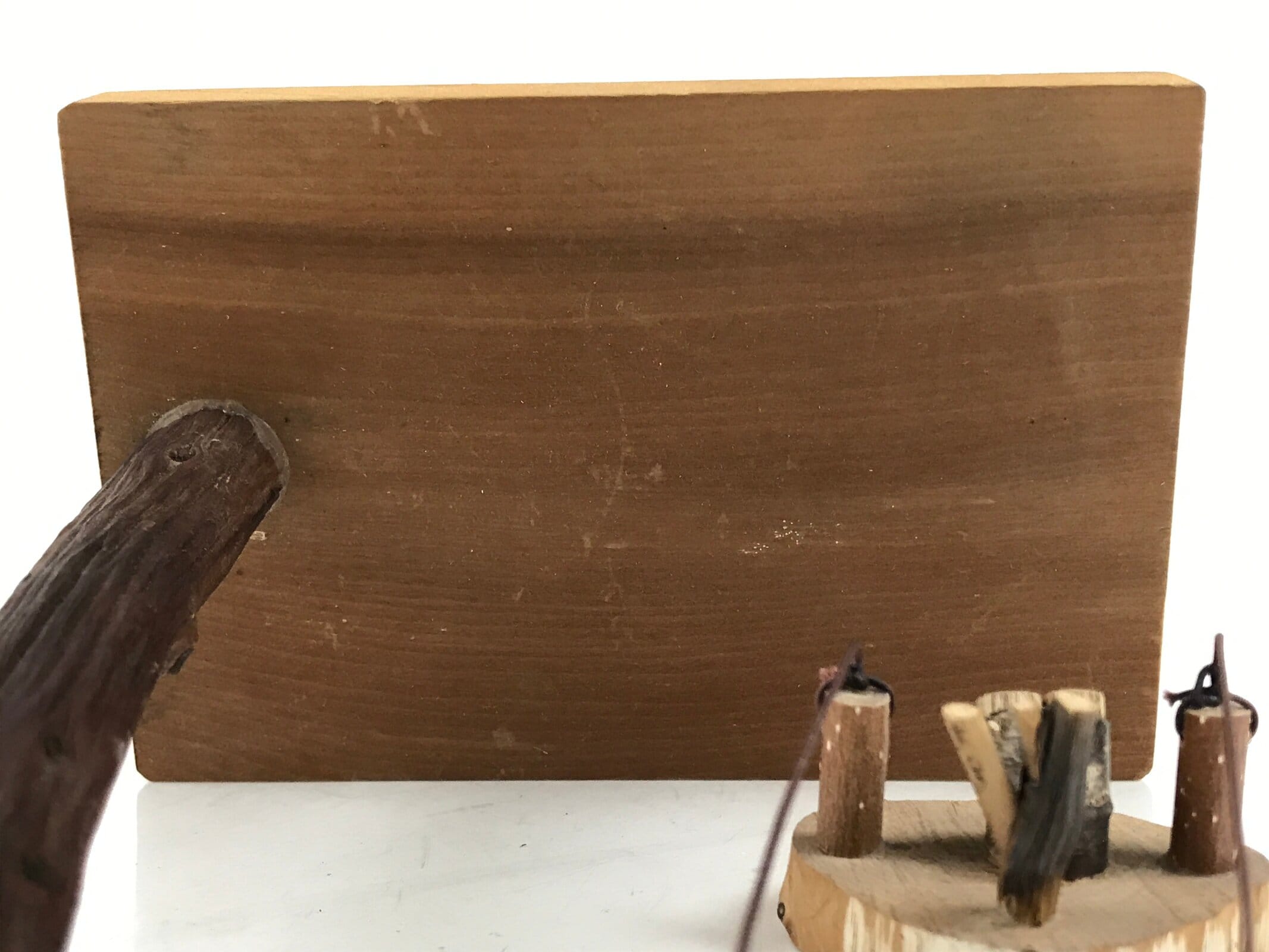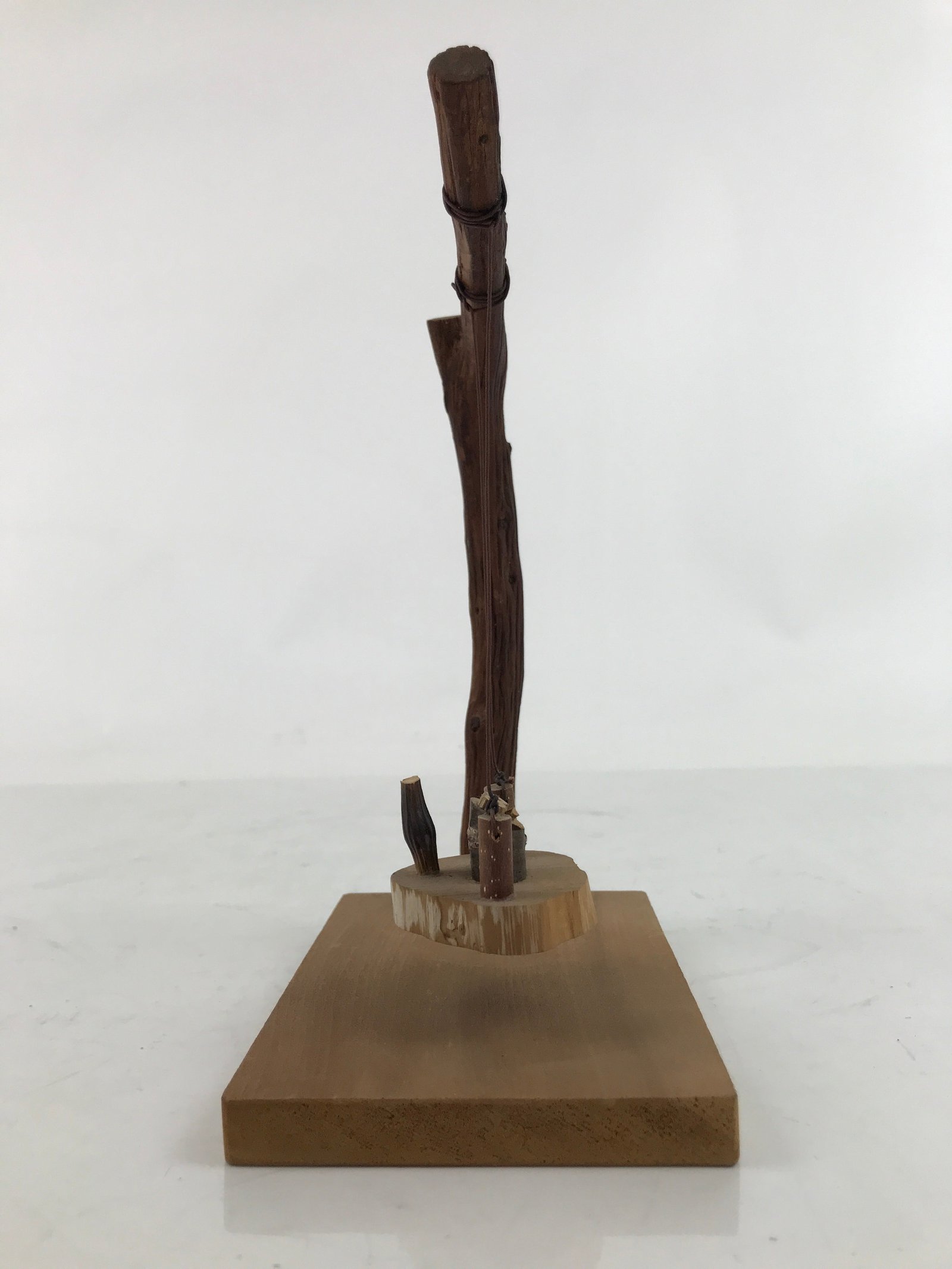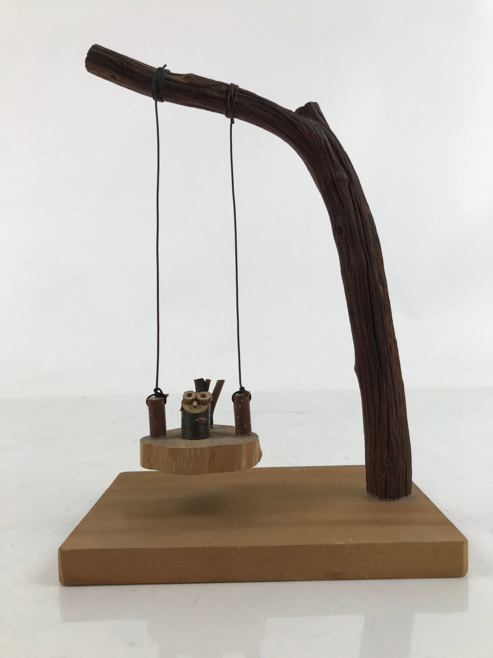 This is a vintage Japanese handcrafted owl figurine. It features a tree swing with a little owl one it. The swing is tied to the tree branch via brown string. It is all a natural brown wood color with no other added embellishments or details. It is perfect for adding flair to simple decor.