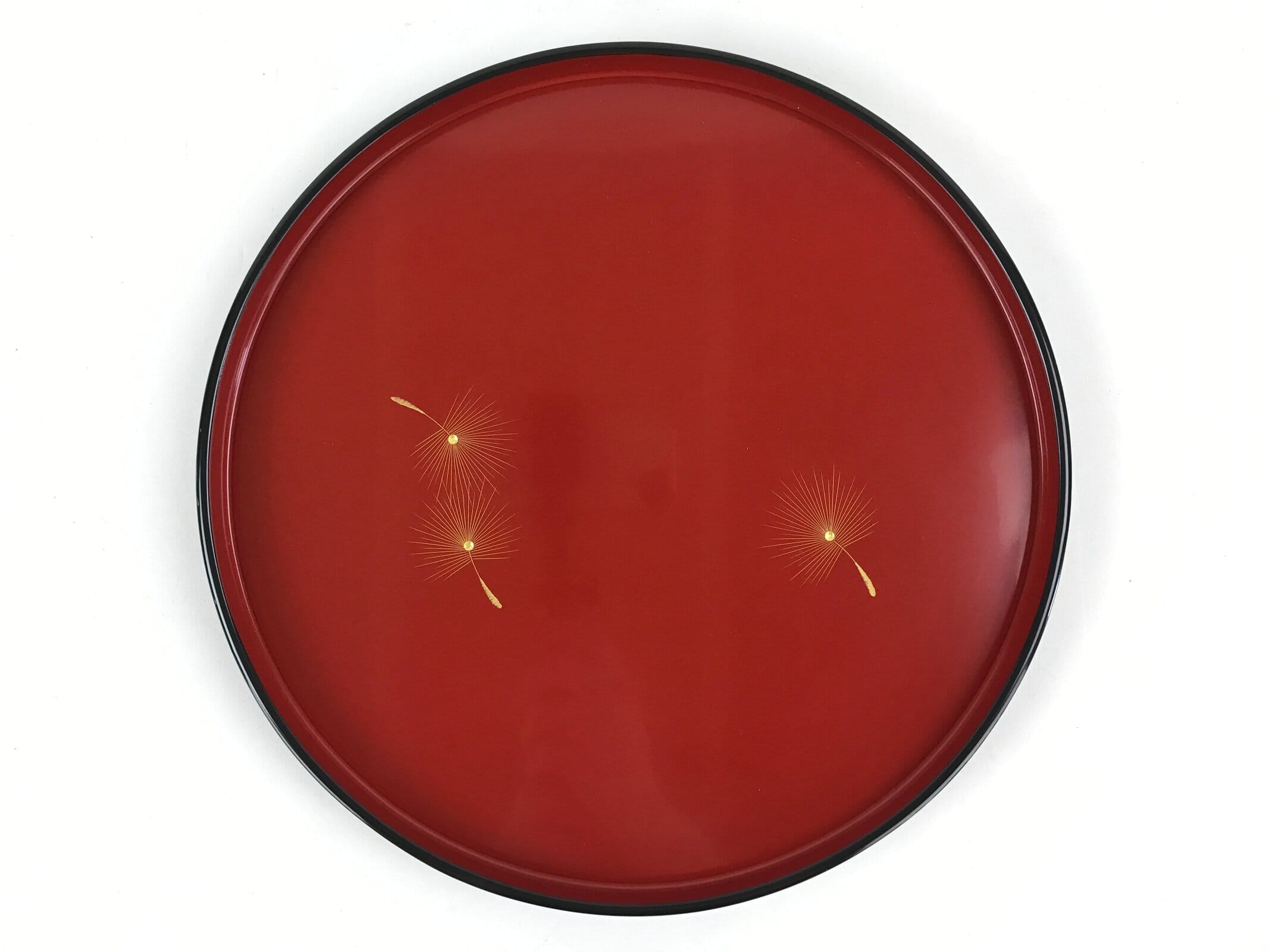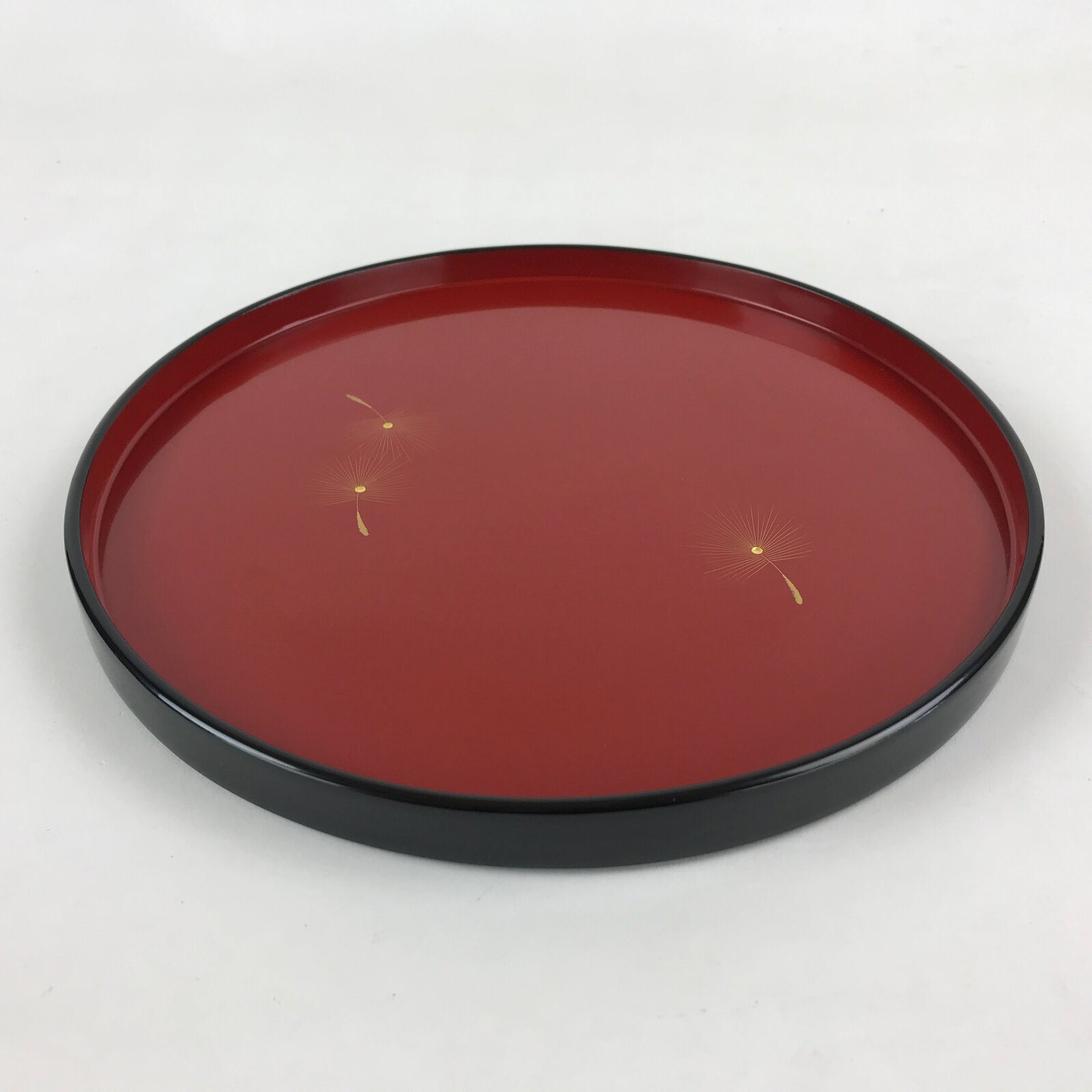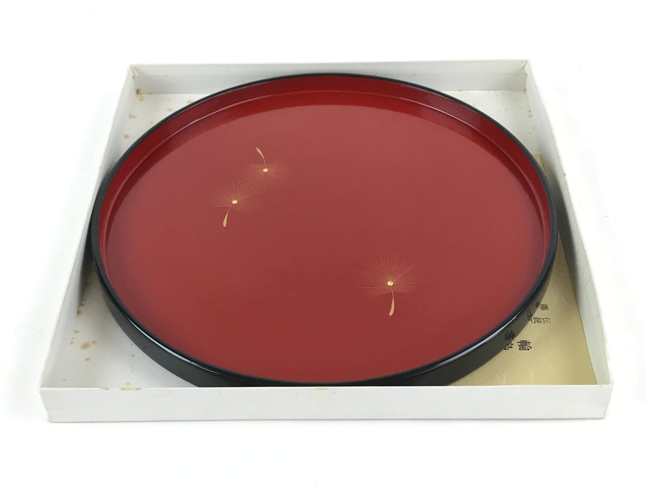 With a classic red and black combination lacquer, this cute round tray provides both function and beautiful decor. It features floating dandelion seeds carved into the tray and colored with gold paint. The design is simple, but in light, the gold shines brightly. The original box is also included.