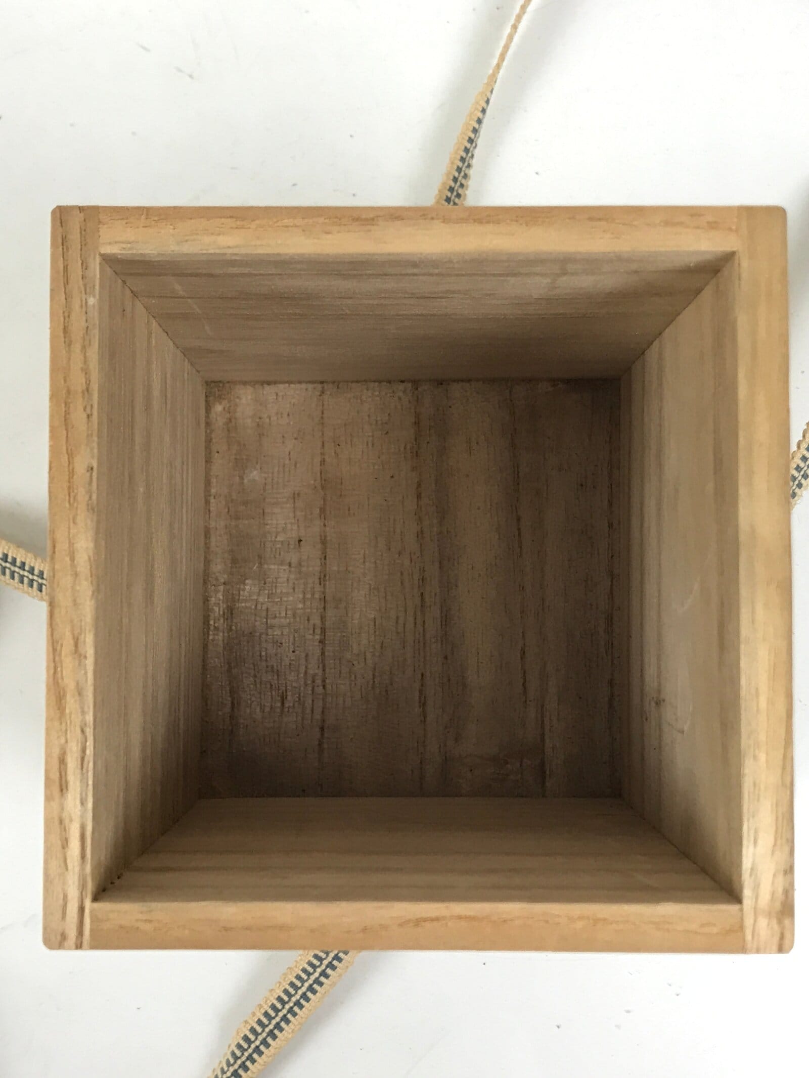 This small, lidded box is made of wood and is natural brown in color. It has strings to secure the lid and inscriptions on it. It is excellent for general storage, DIY, or decoration.