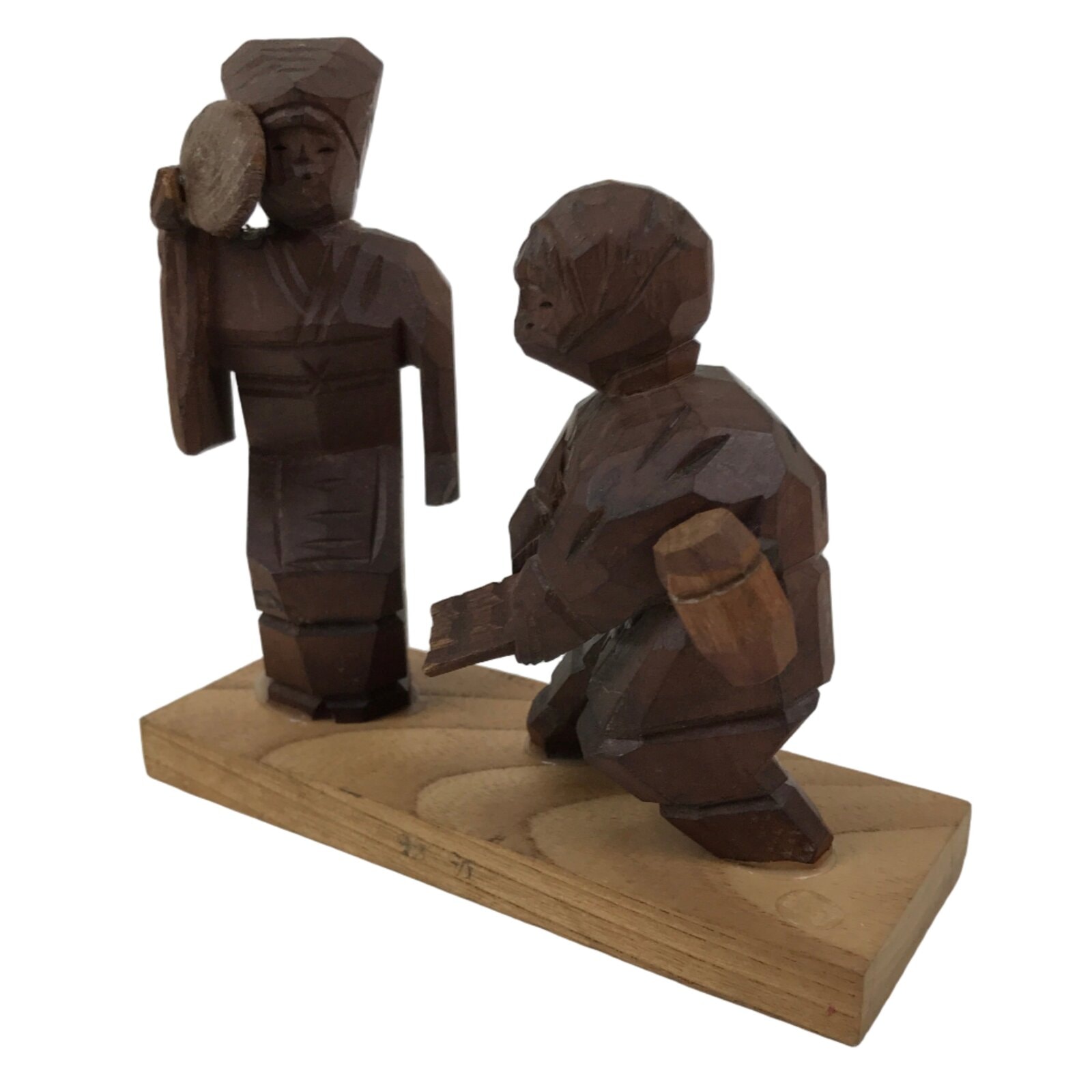 This is a small wooden figurine with two hand-carved people wearing traditional clothes. One is posed with some sort of plate or fan, while the other is crouched and holding a winnowing basket with a small basket attached at the hip. This scene represents loach scooping, which is a fishing activity done by using a basket to fish for loach. The figures are glued to a small wooden board.