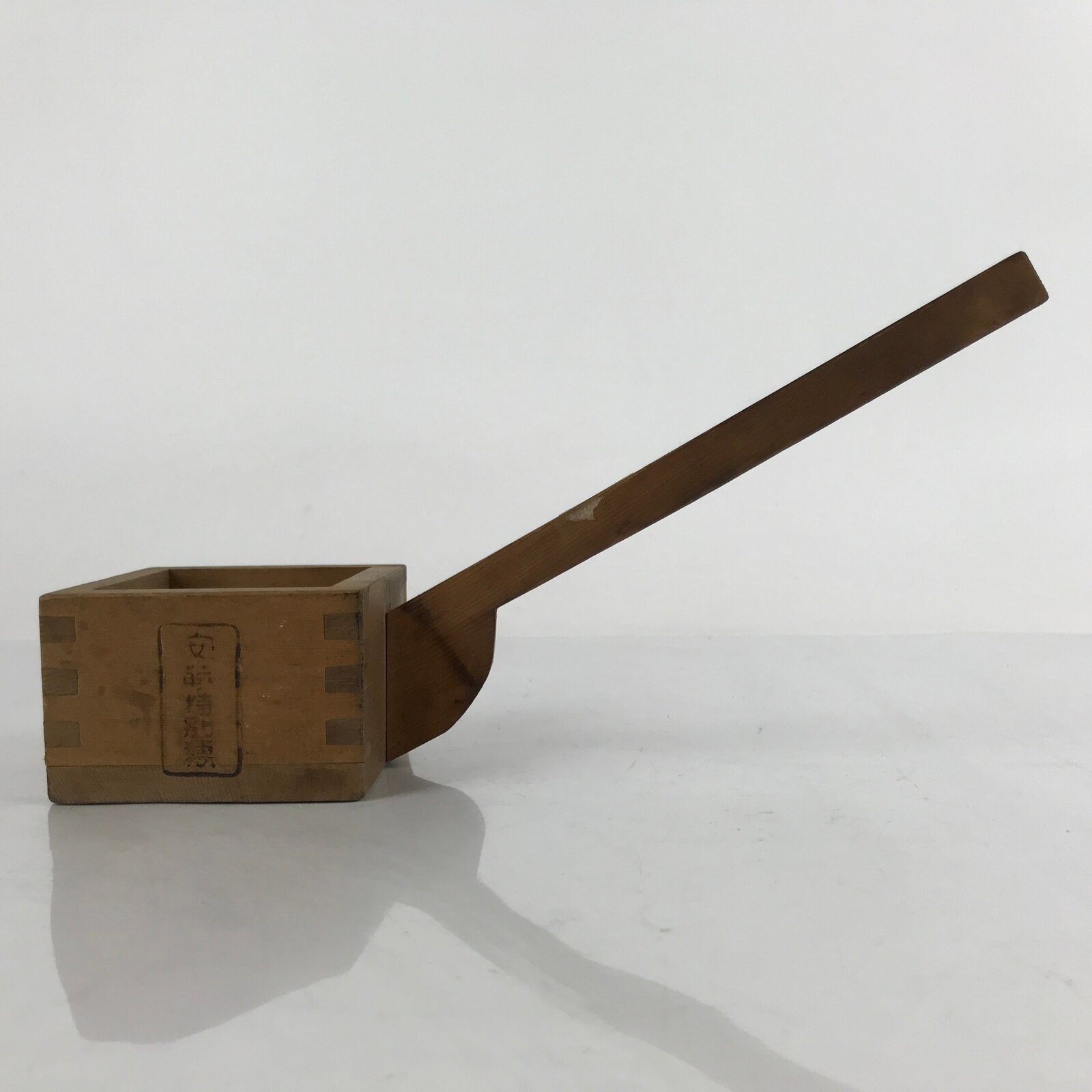 This traditional Japanese wood ladle for liquids, Masu, was once used for measuring liquids such as Japanese sake. It has a 2DL or 0.2L capacity. This ladle has inscriptions on the sides.