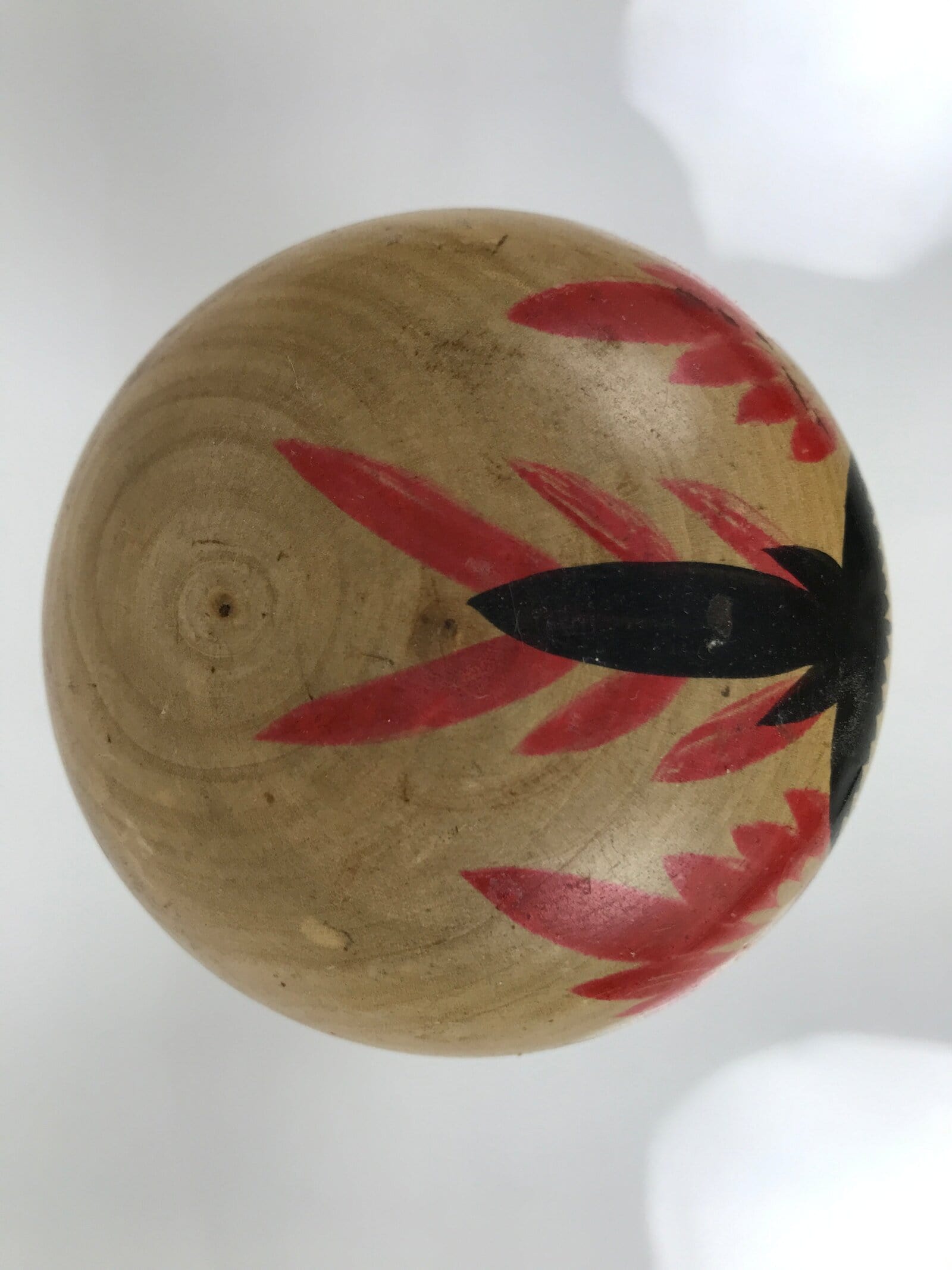 This vintage Japanese wooden kokeshi doll has a classic design (round head, cylindrical body). The body is slightly curved, and it is painted with red line bands and red floral designs. The facial expression is confident and youthful, and it is surrounded by tufts of black painted hair and extra red details to match the body. It has been brushed with a clear lacquer coating to give it shine.