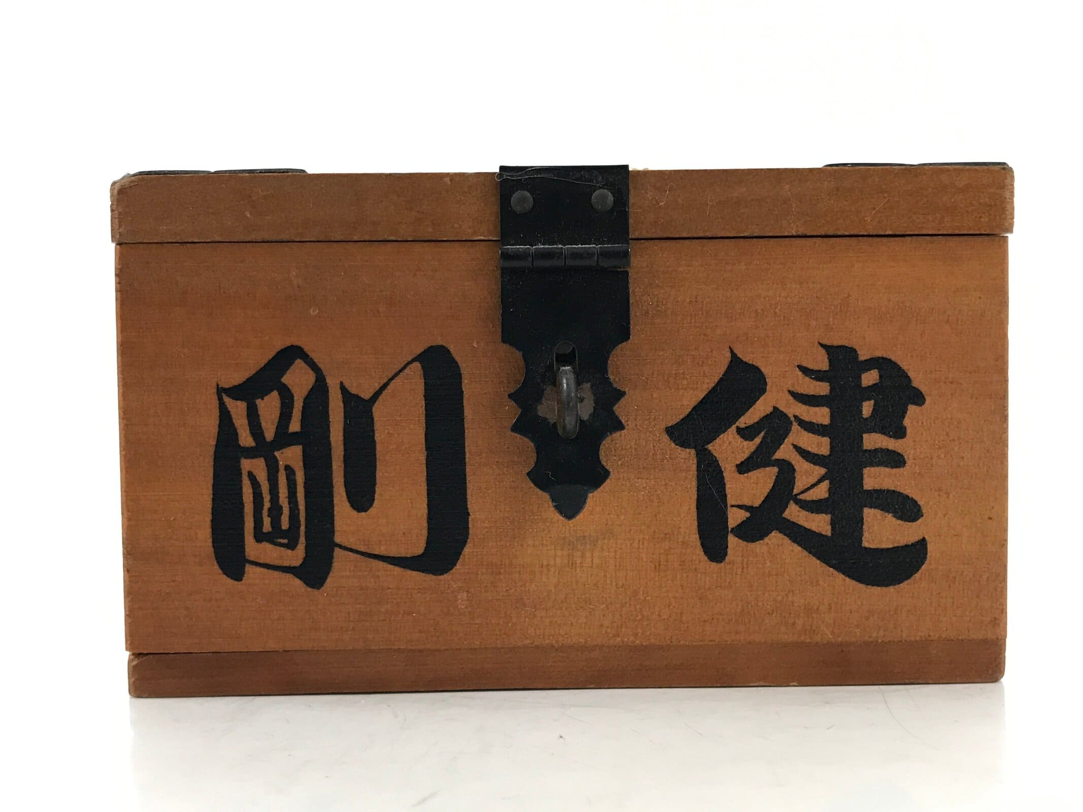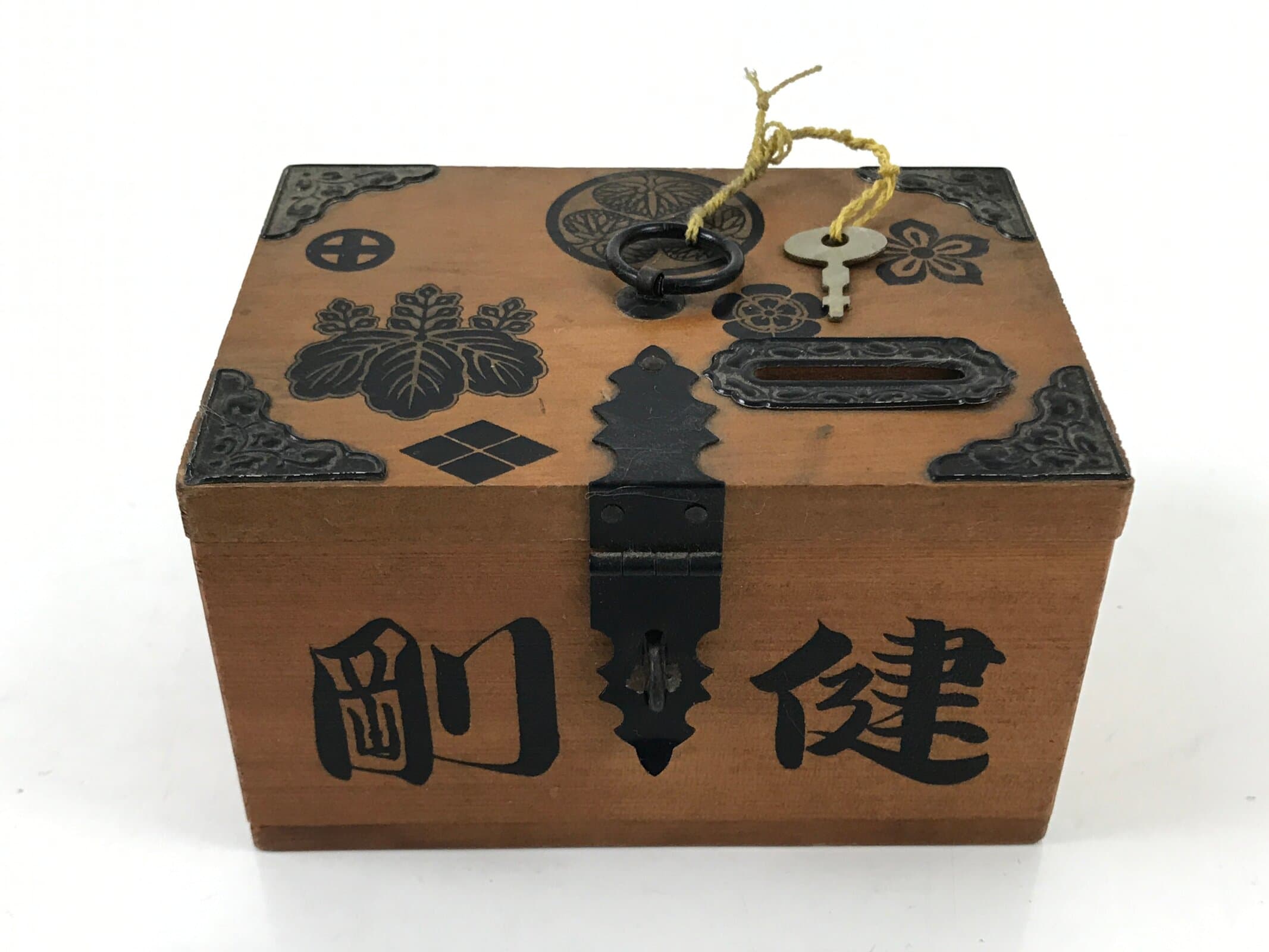 This vintage Japanese wooden coin bank is brown and decorated with several popular kamon family crests. It has some letters on the front, possibly a name, and black metal embellishments. You can insert coins thanks to a split on the lid. A key is attached but the lock is missing.