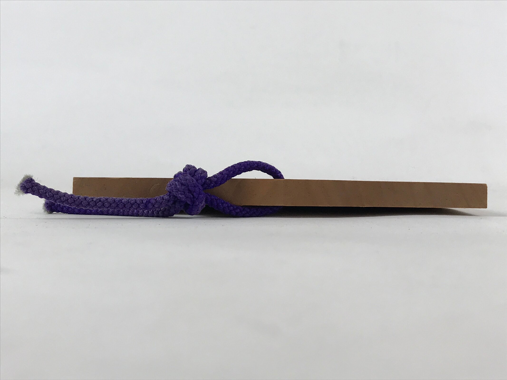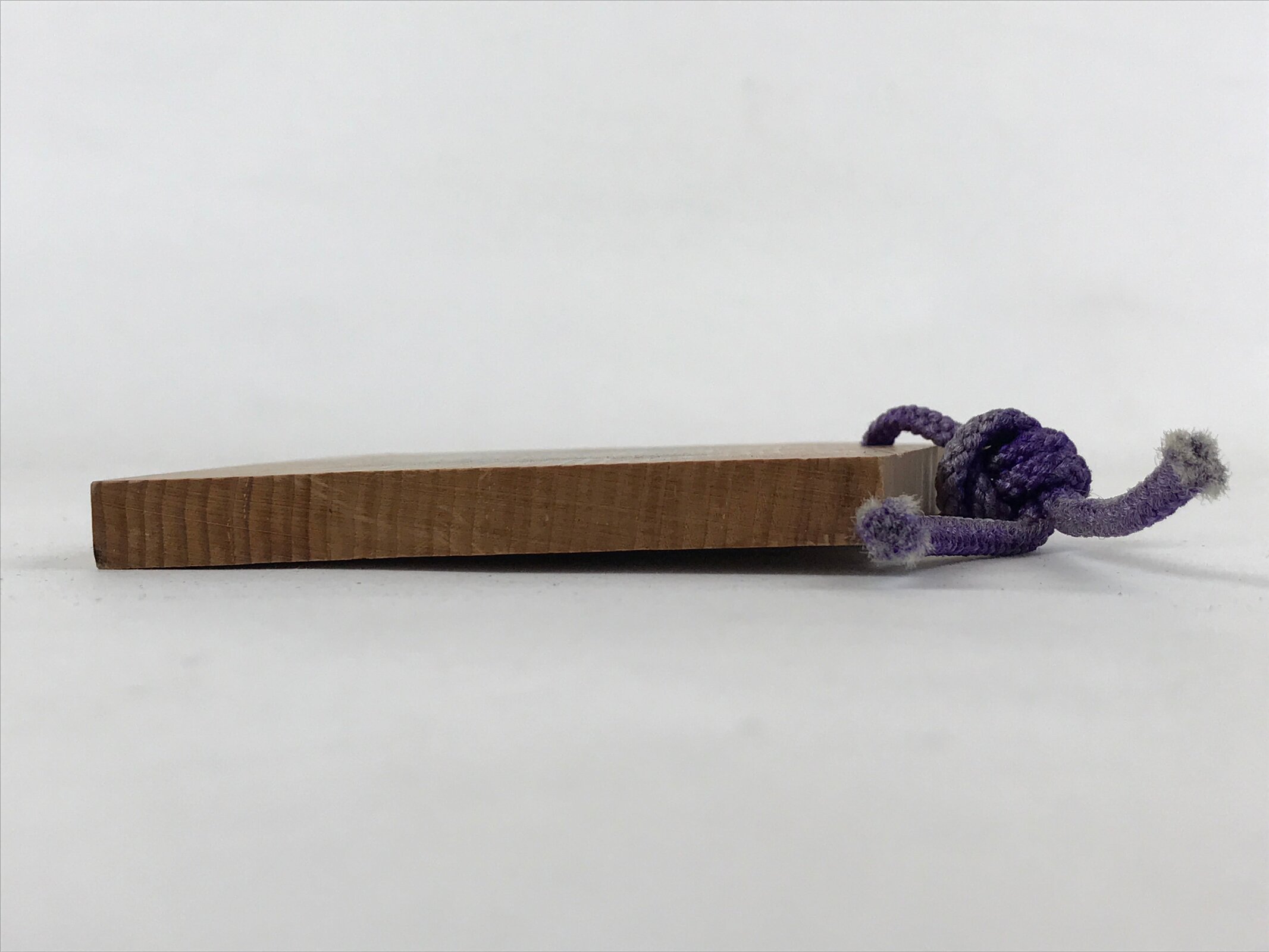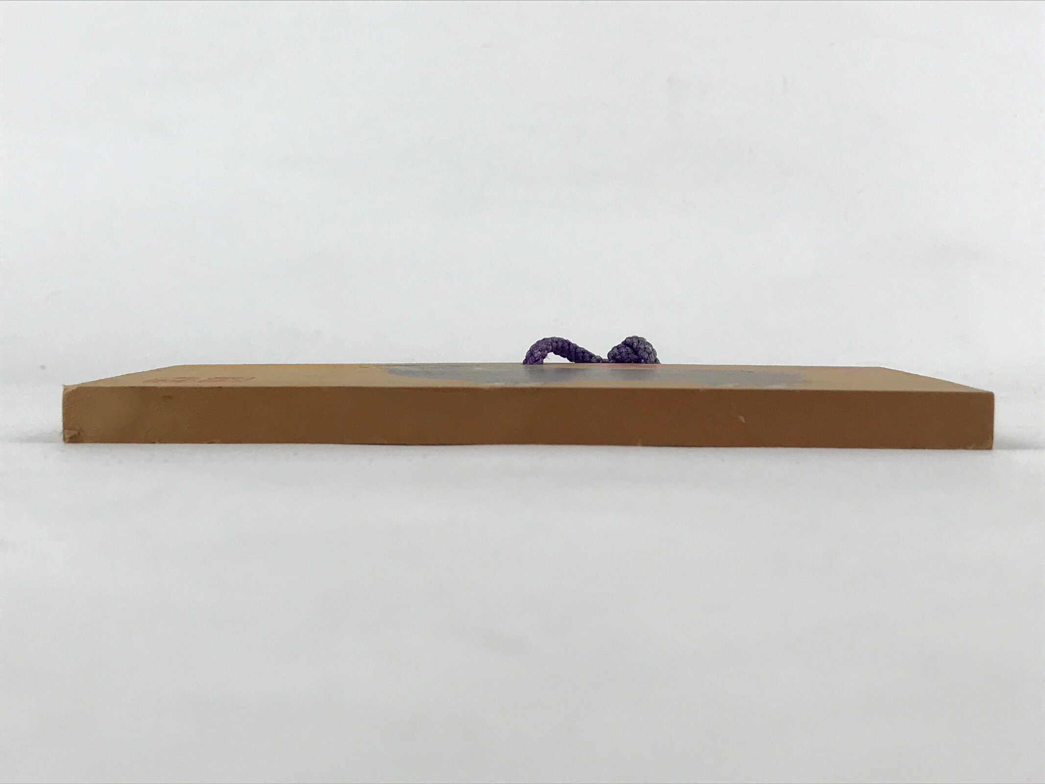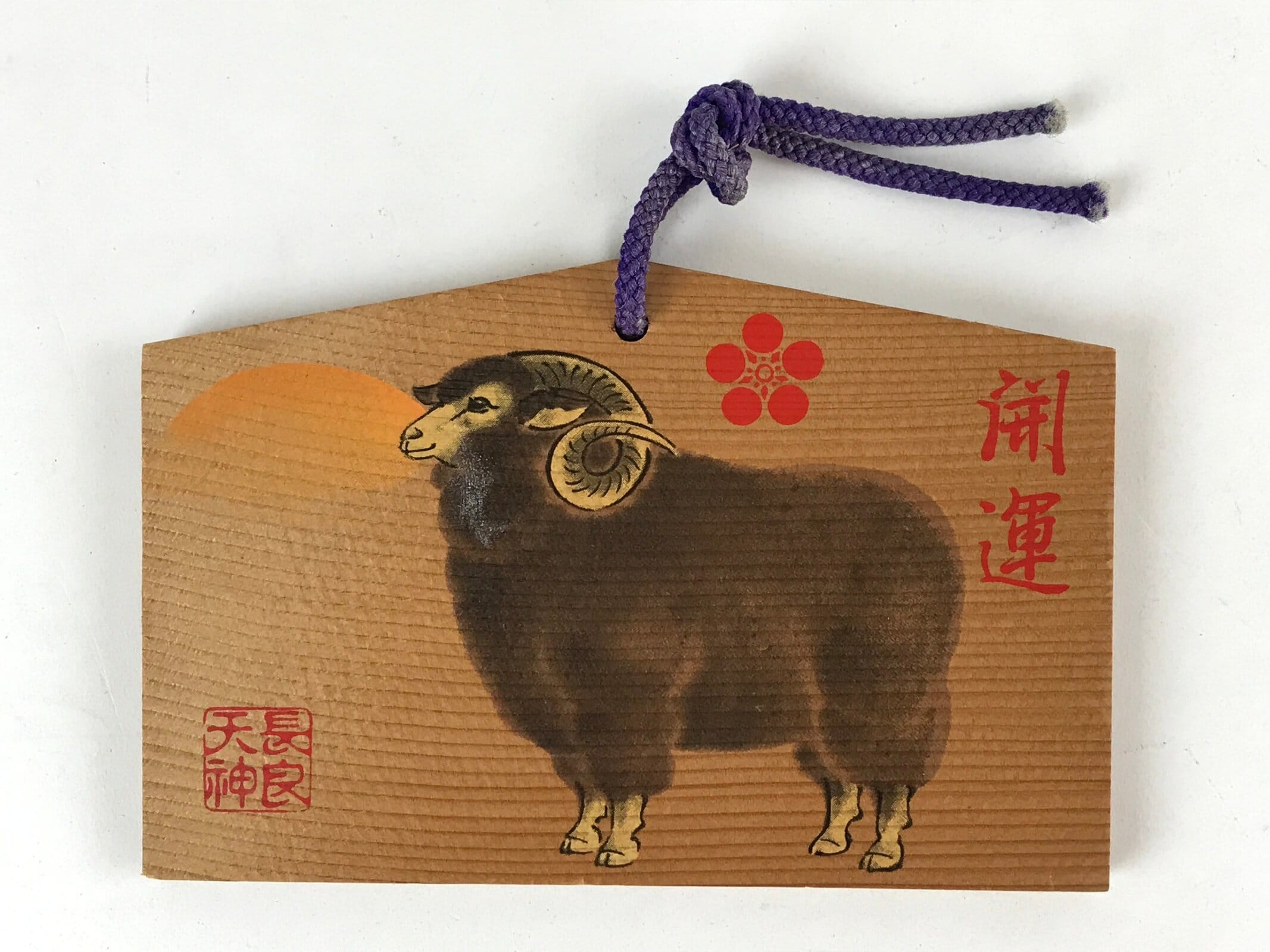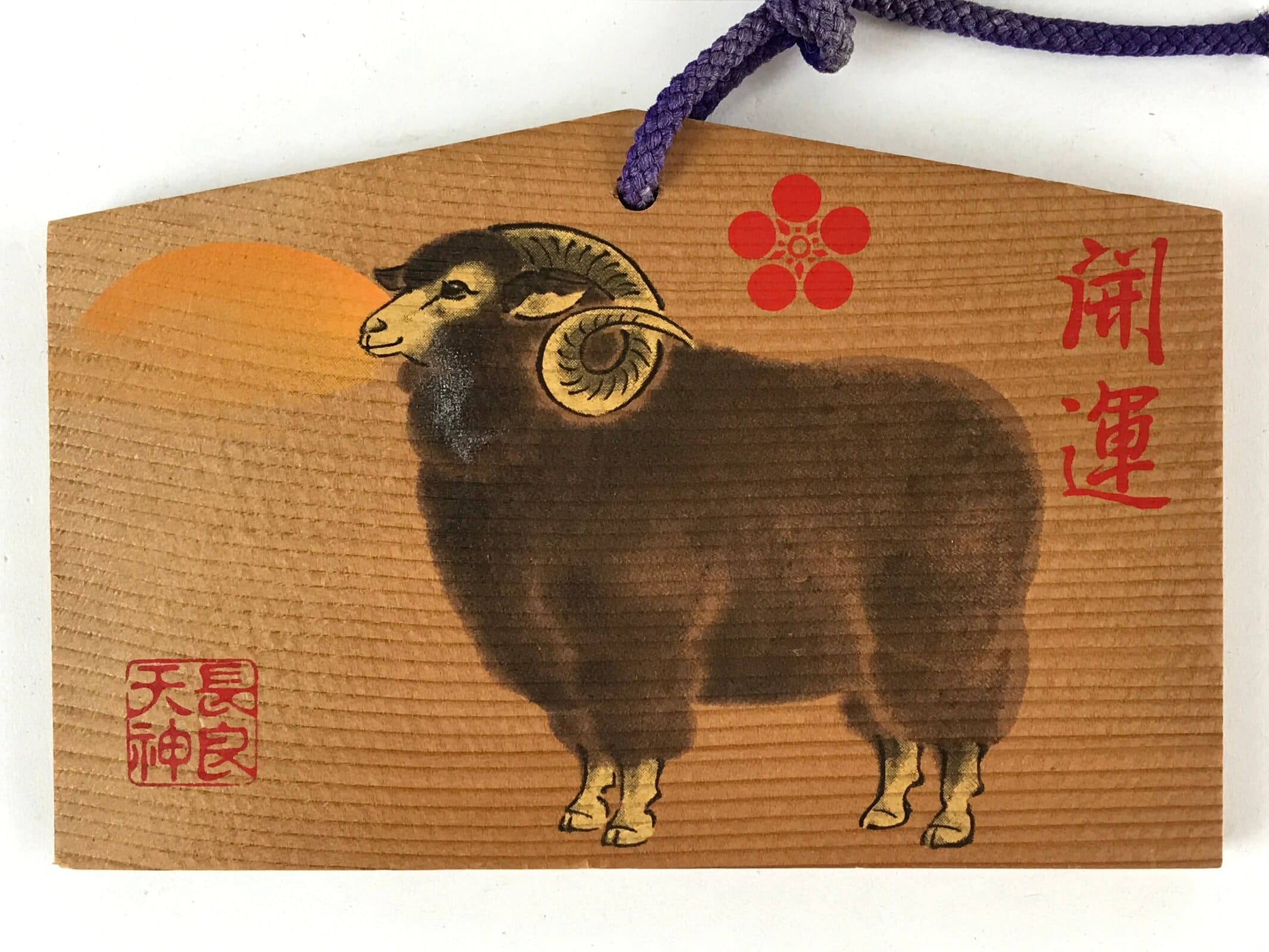 This ema plaque has a picture of a black sheep in front of a rising sun. Zodiac animal imagery is common around the New Year. It also features a purple braided cord.