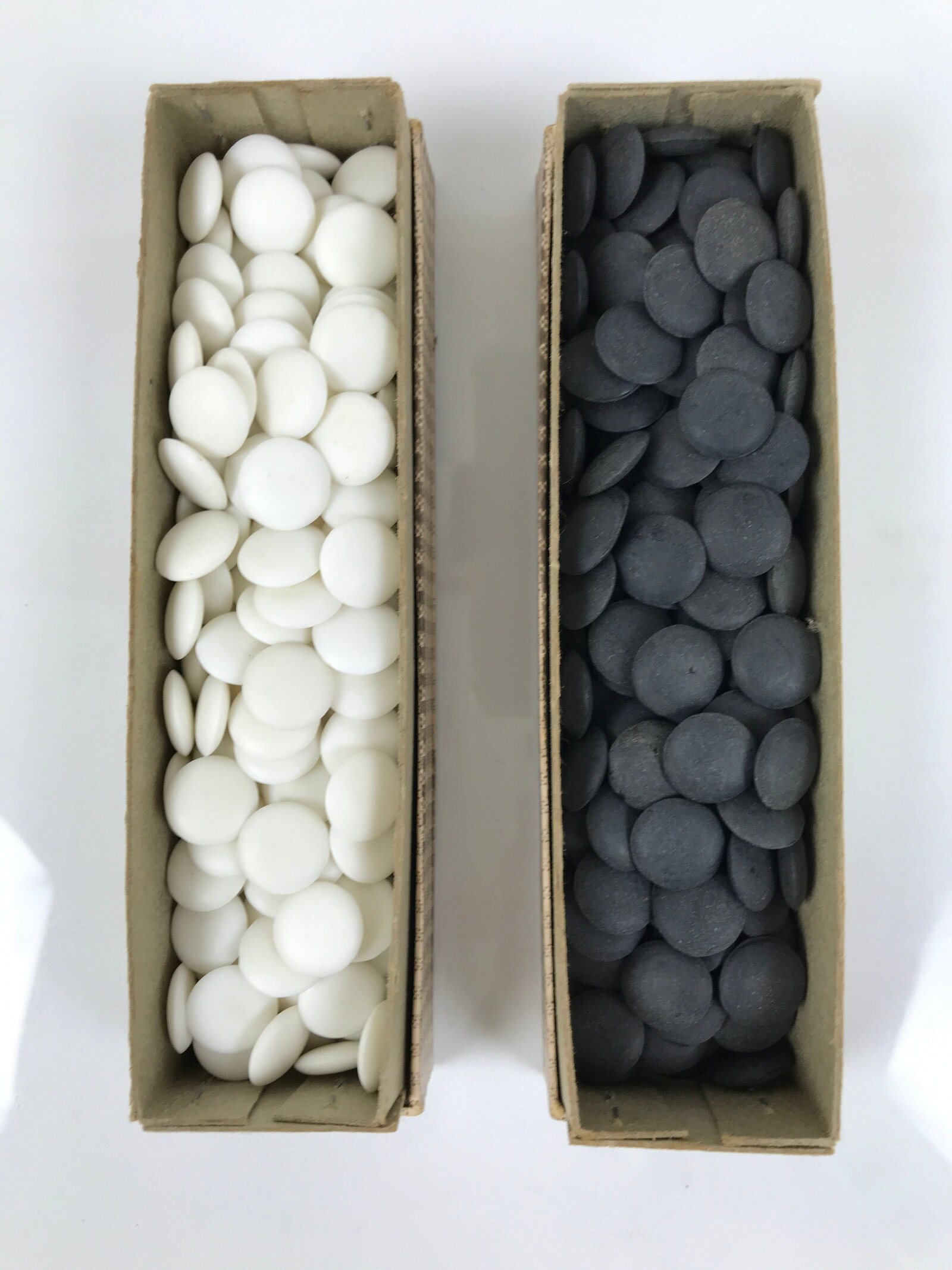 Black and white stones are used as game pieces by two players. By placing the stones on the intersections of lines on a go board, the goal of the game is to section off a larger portion of the board as the other player.
