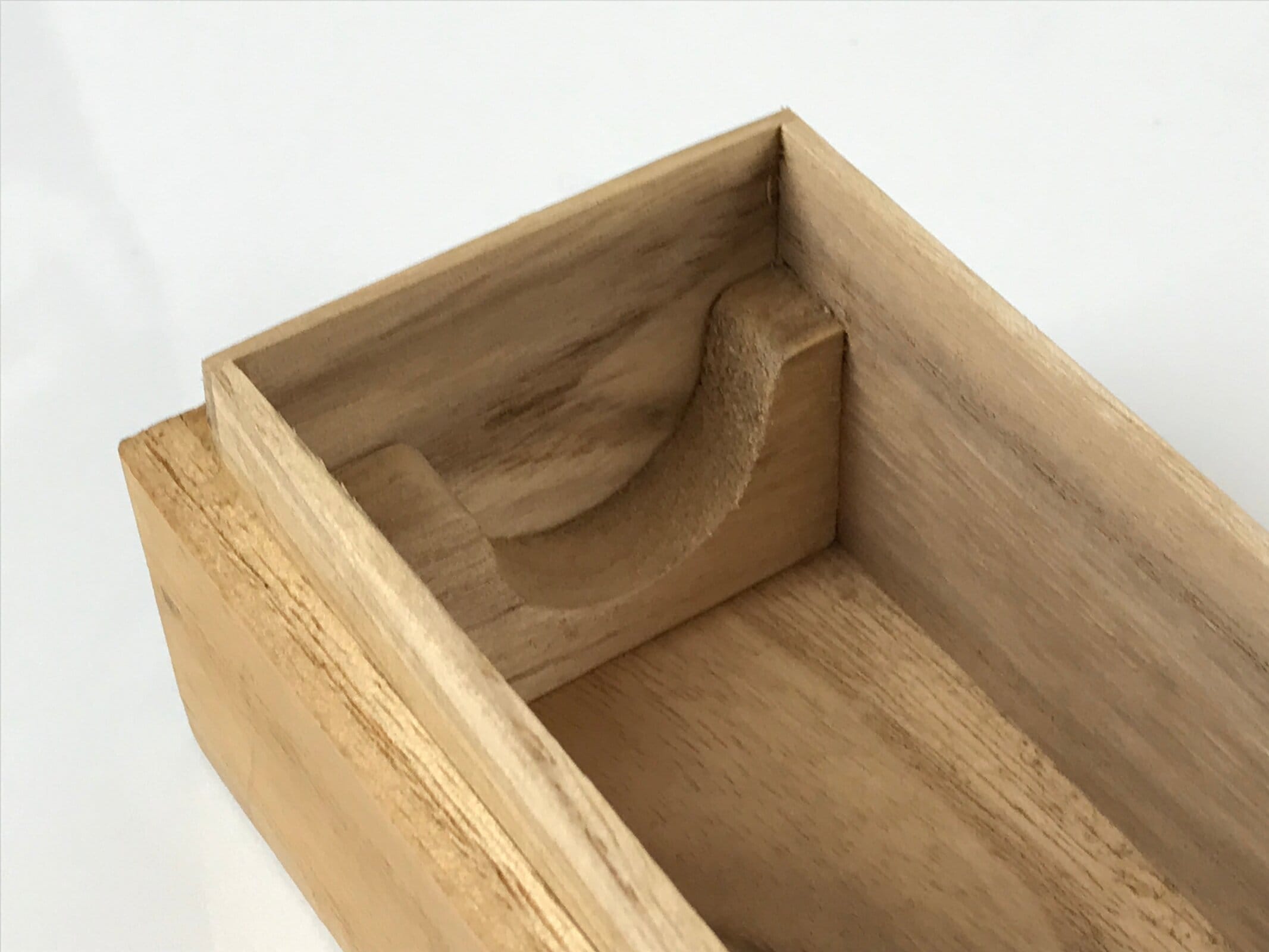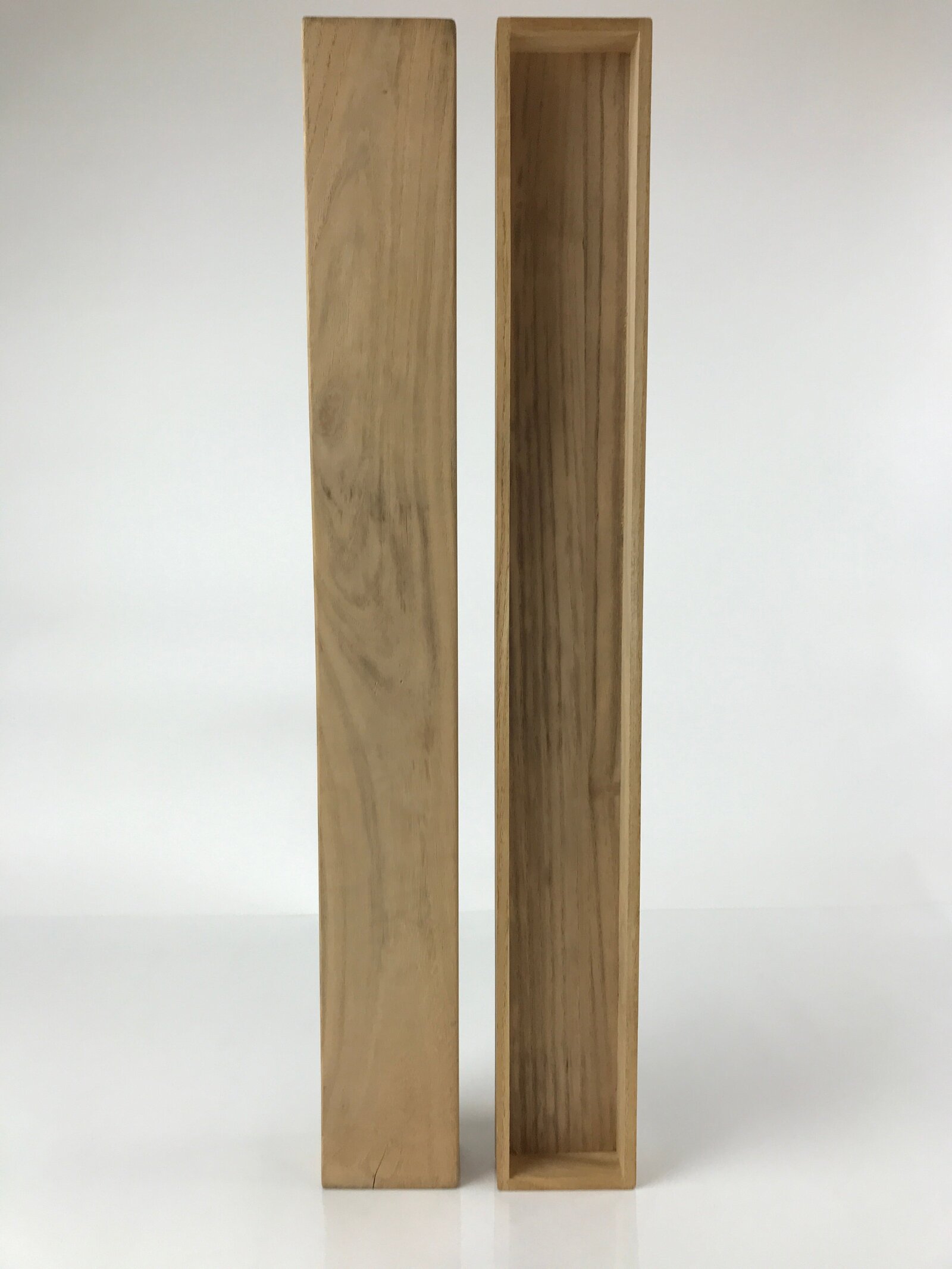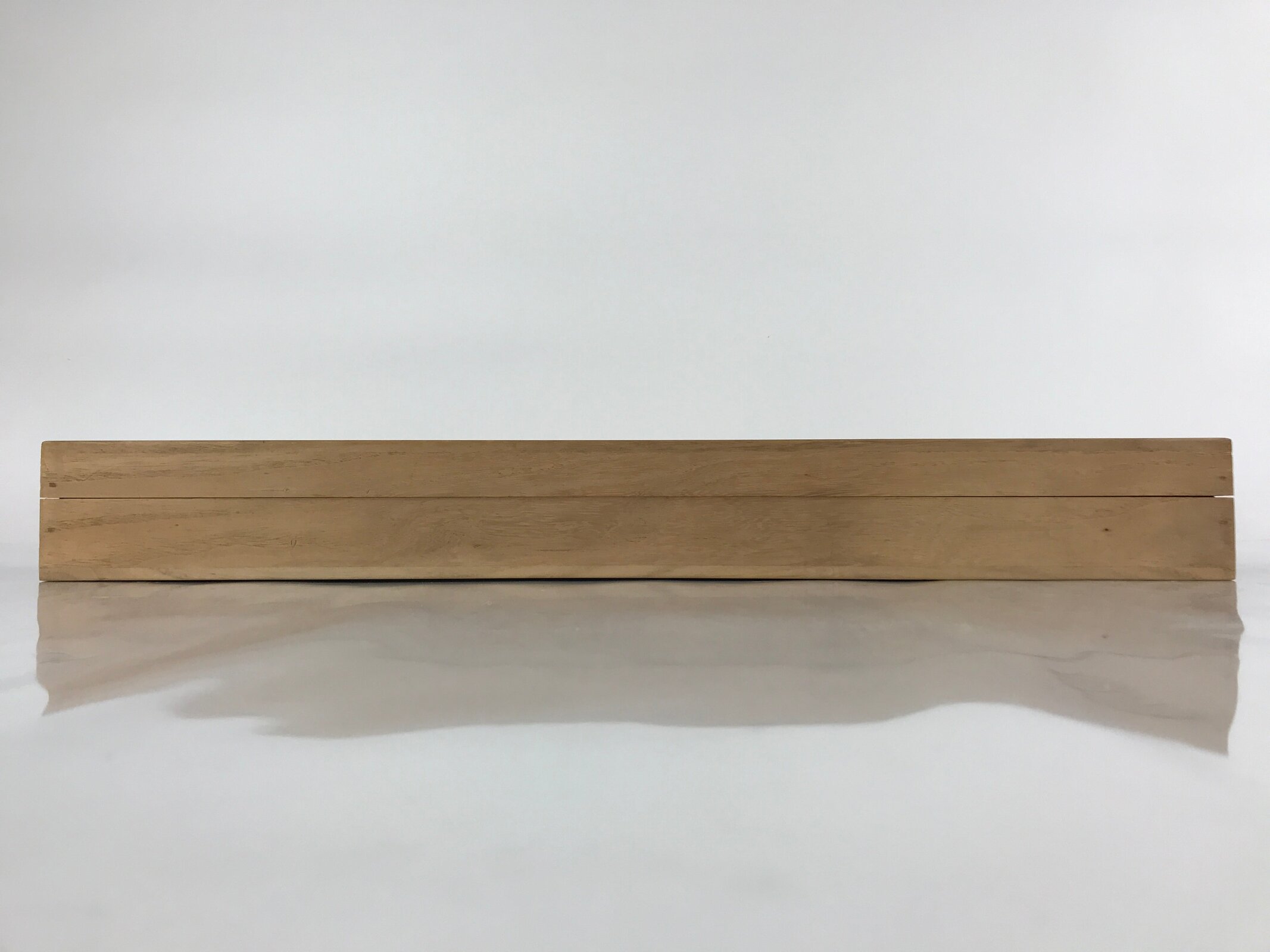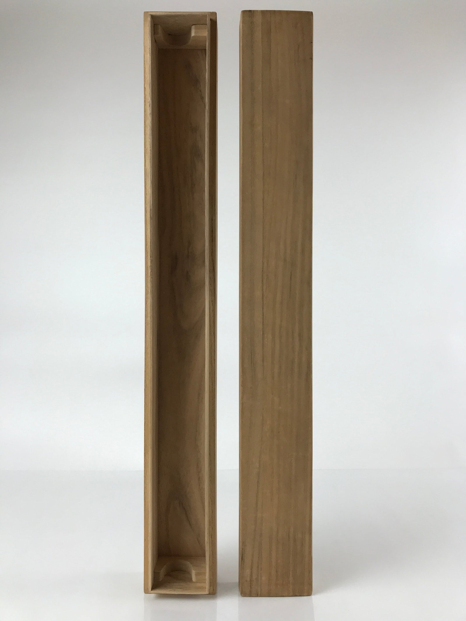 Hand-crafted and in a light brown color, this unique, sturdy, and slender wooden box is made to store a hanging scroll, or kakejiku. The lid fits flush and securely on the top. It has two carved, wooden brackets inside to keep the scroll in place.