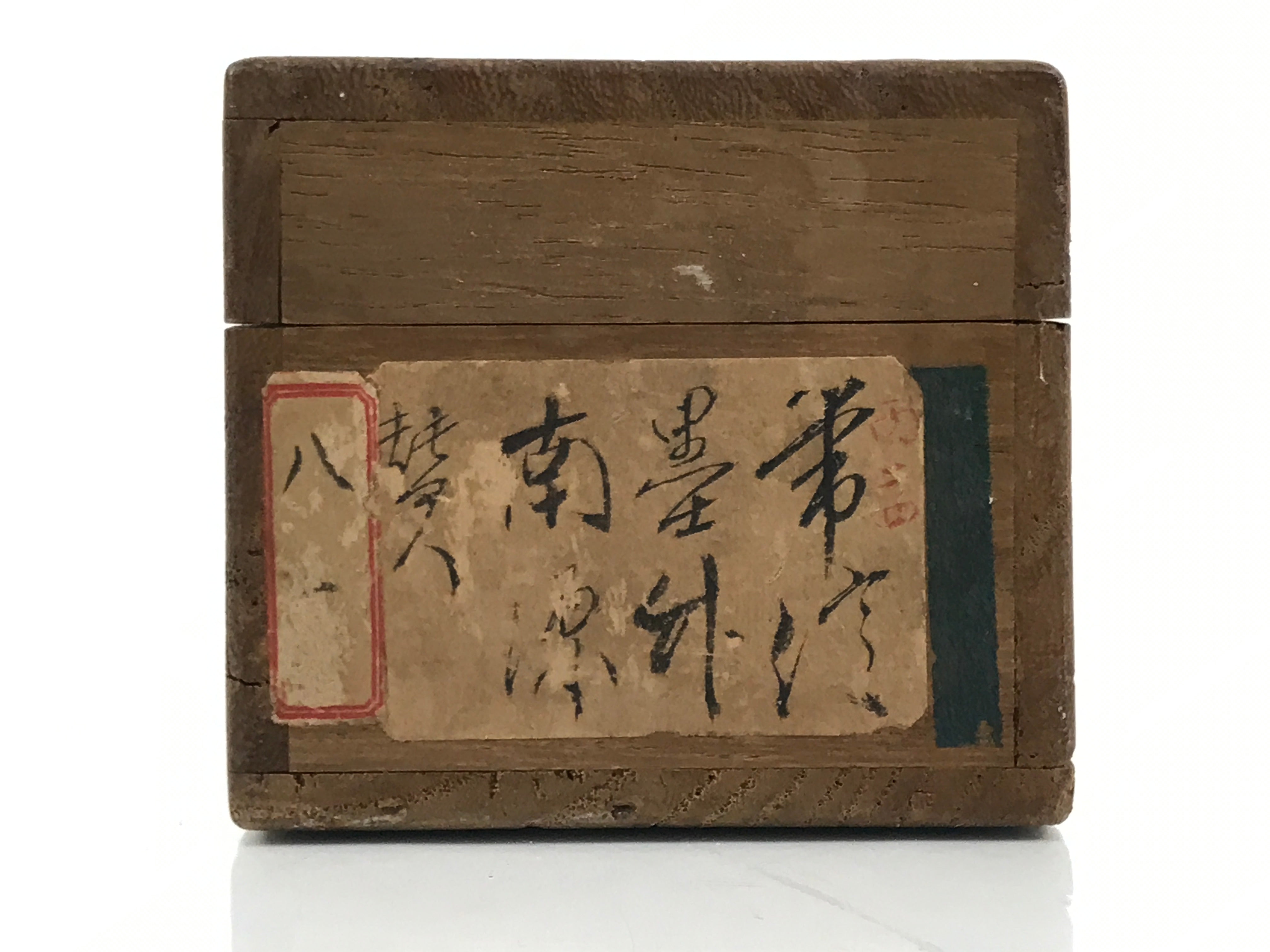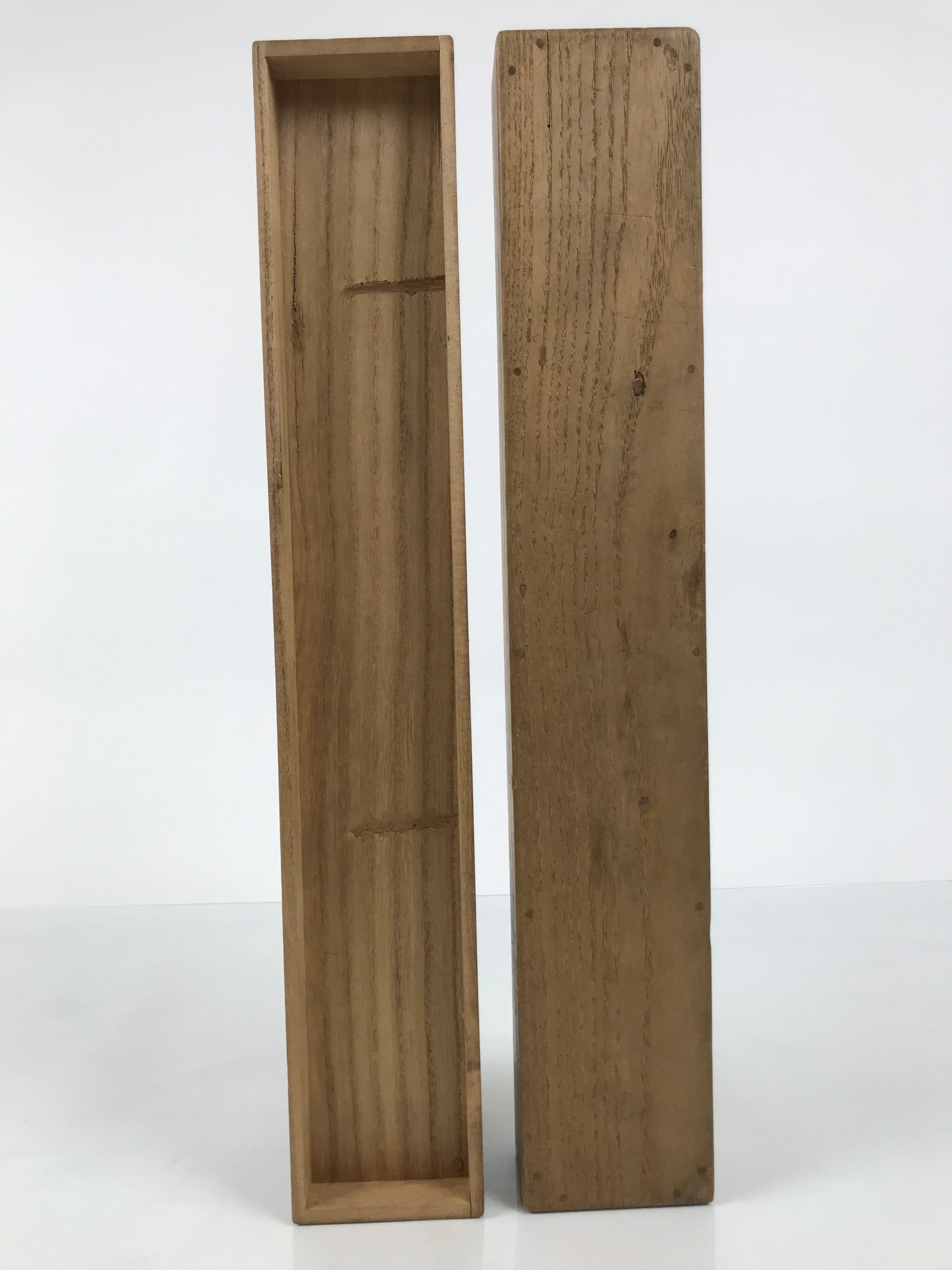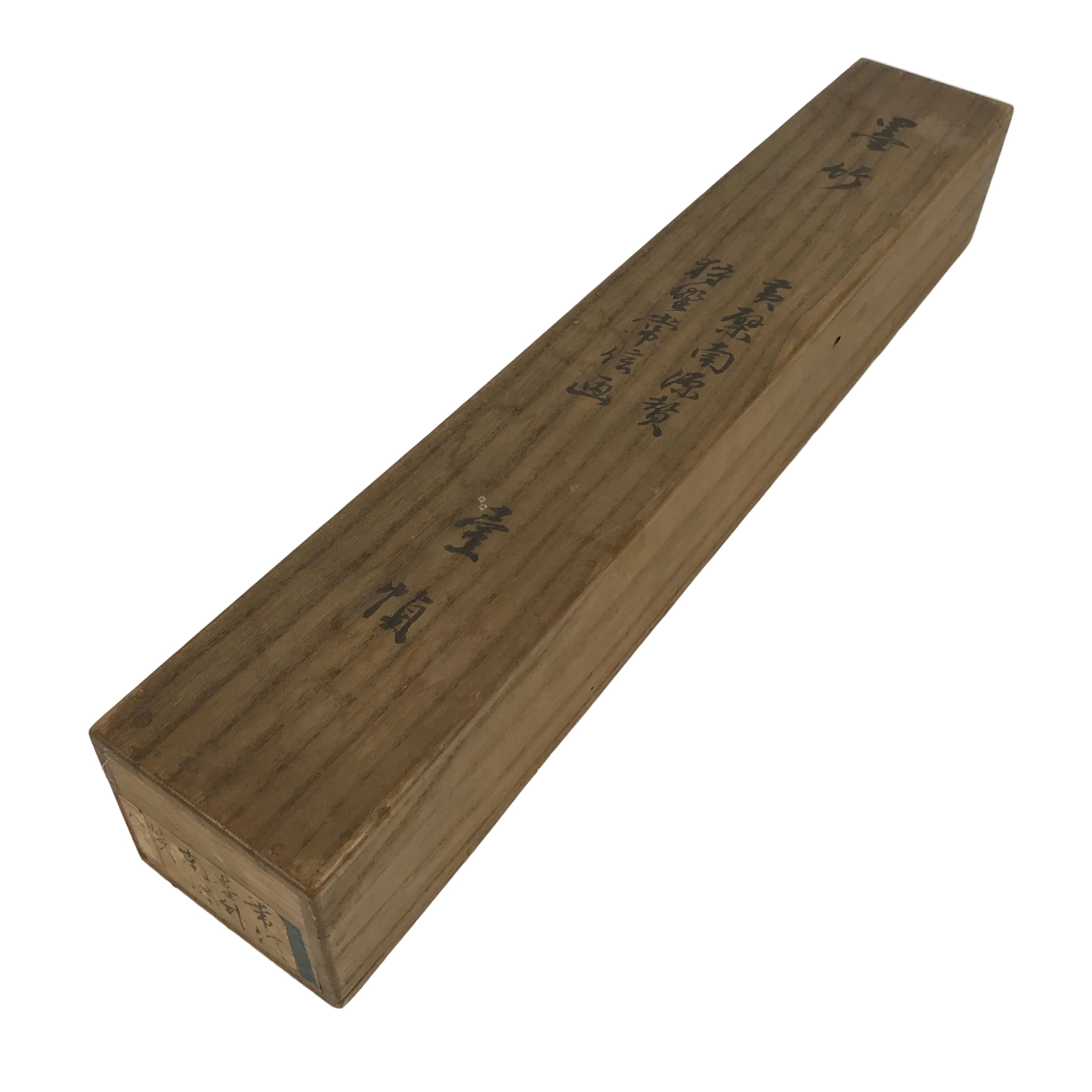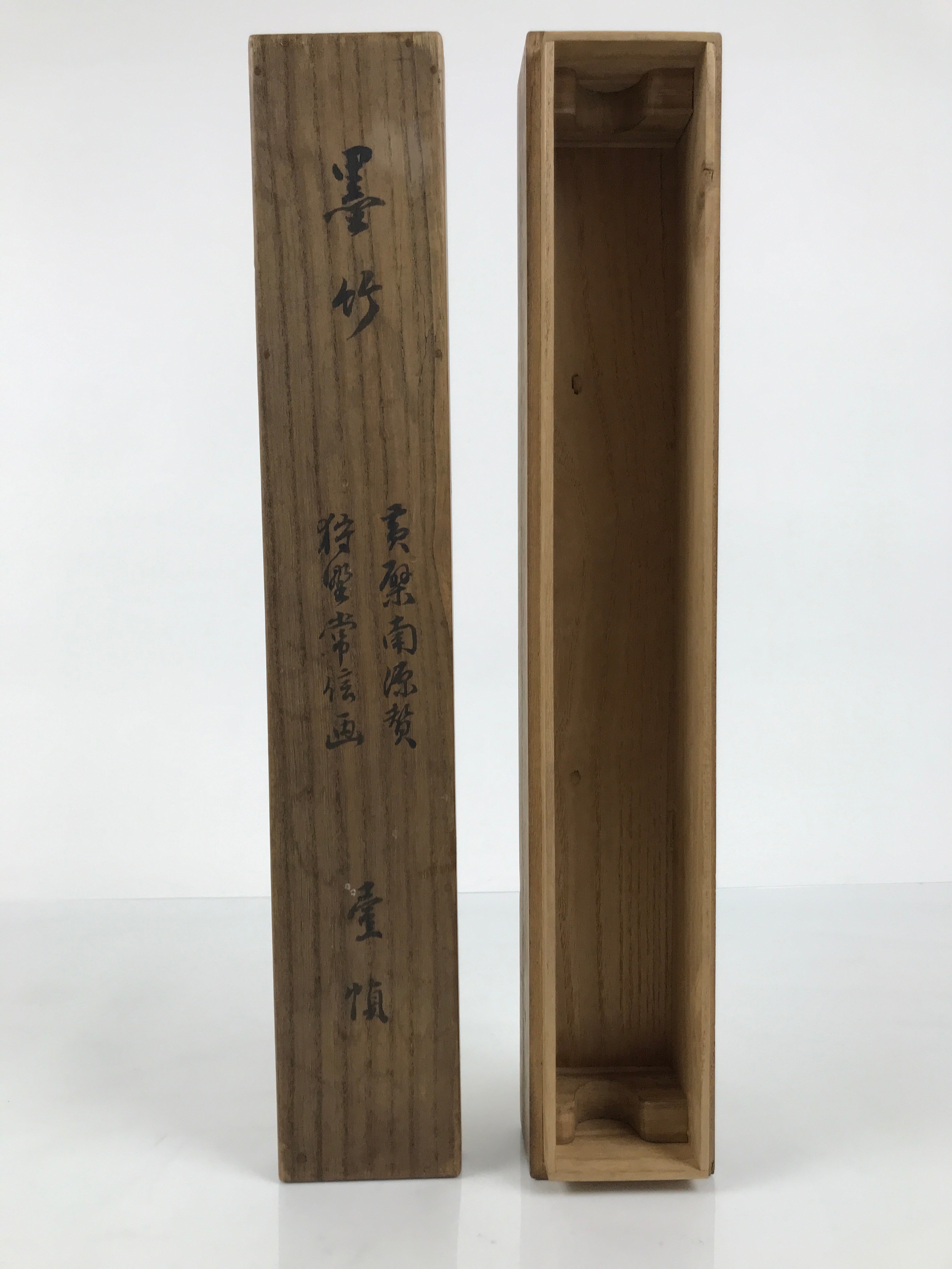 Hand-crafted and in a brown wood color, this sturdy, slender box is made to store a hanging scroll, or kakejiku. The lid fits flush on the top. It has two wooden brackets inside the box to secure the scroll. This specific box has inscriptions on the top of the lid, and a sticker with black inscriptions on one side.