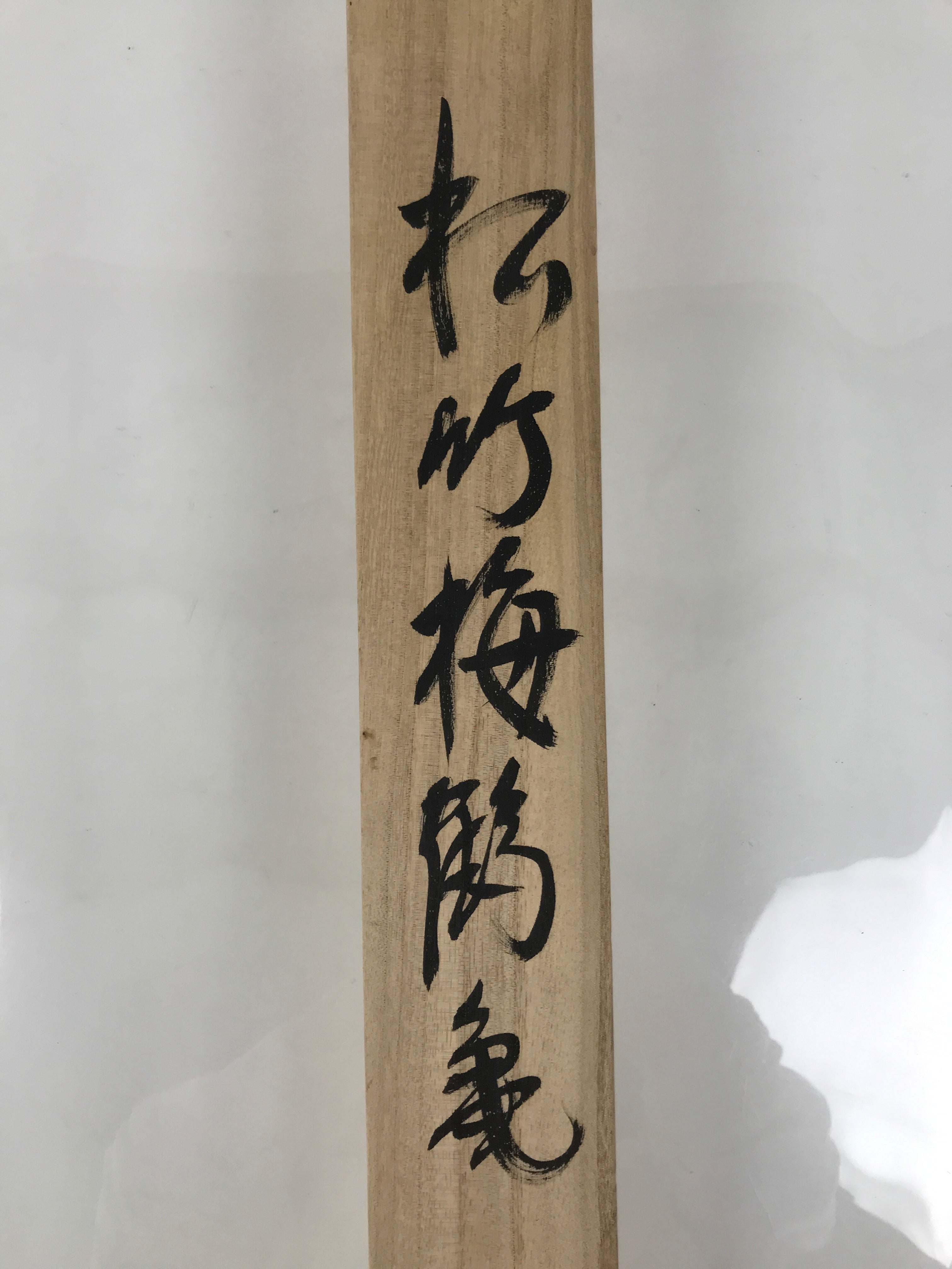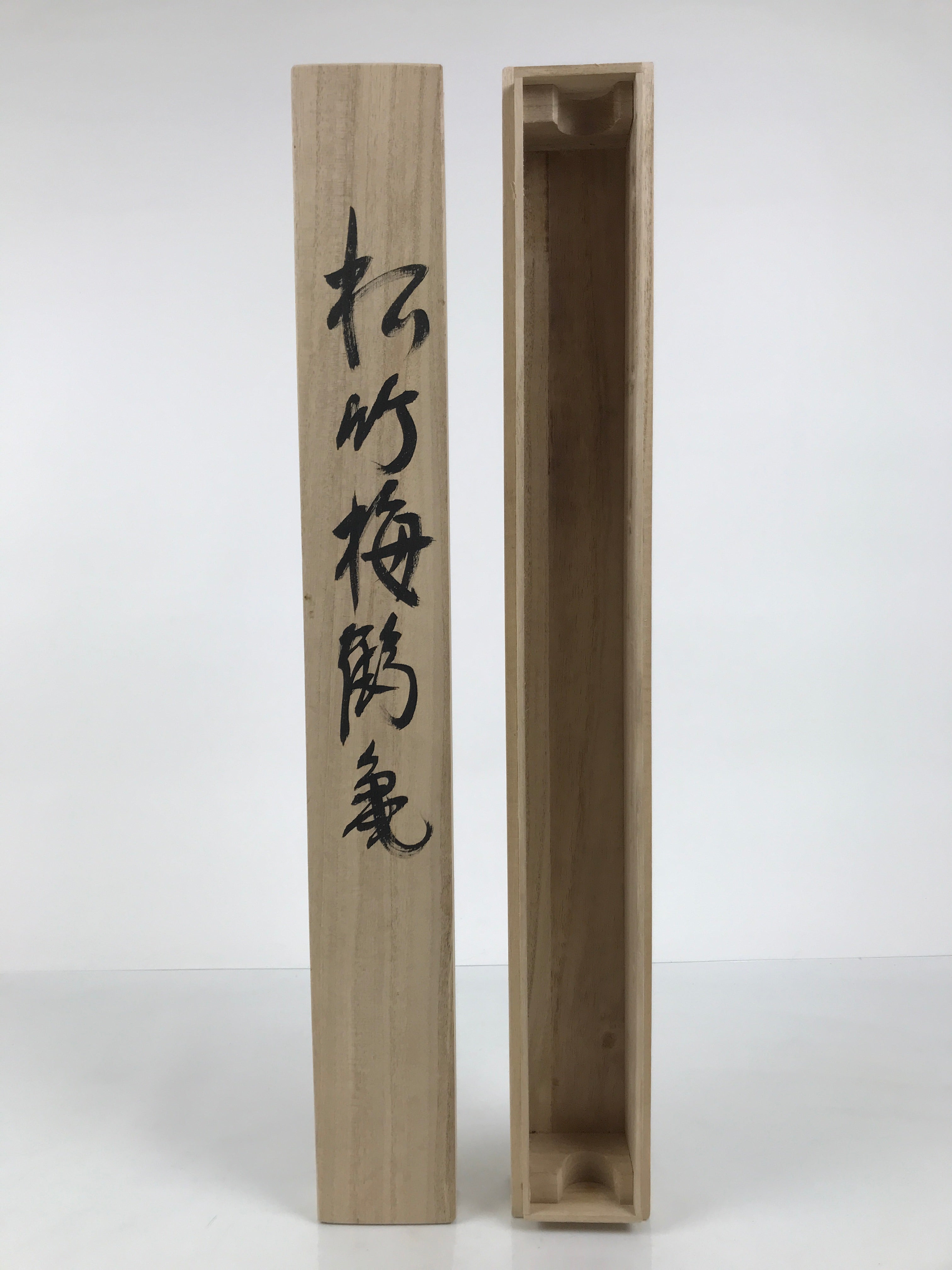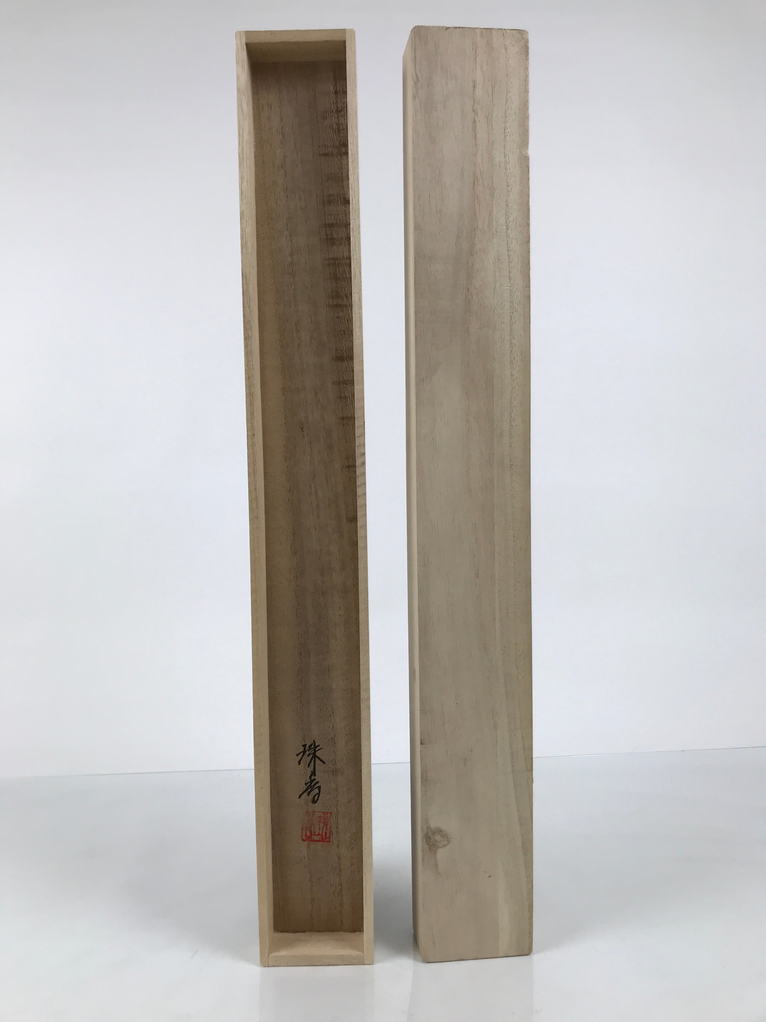 Hand-crafted and in a natural wood color, this sturdy, slender box is made to store a hanging scroll, or kakejiku. The lid fits flush on the top. It has two wooden brackets inside the box to secure the scroll. This specific box has inscriptions on the top, and a red seal and a sign on the inside of the lid.