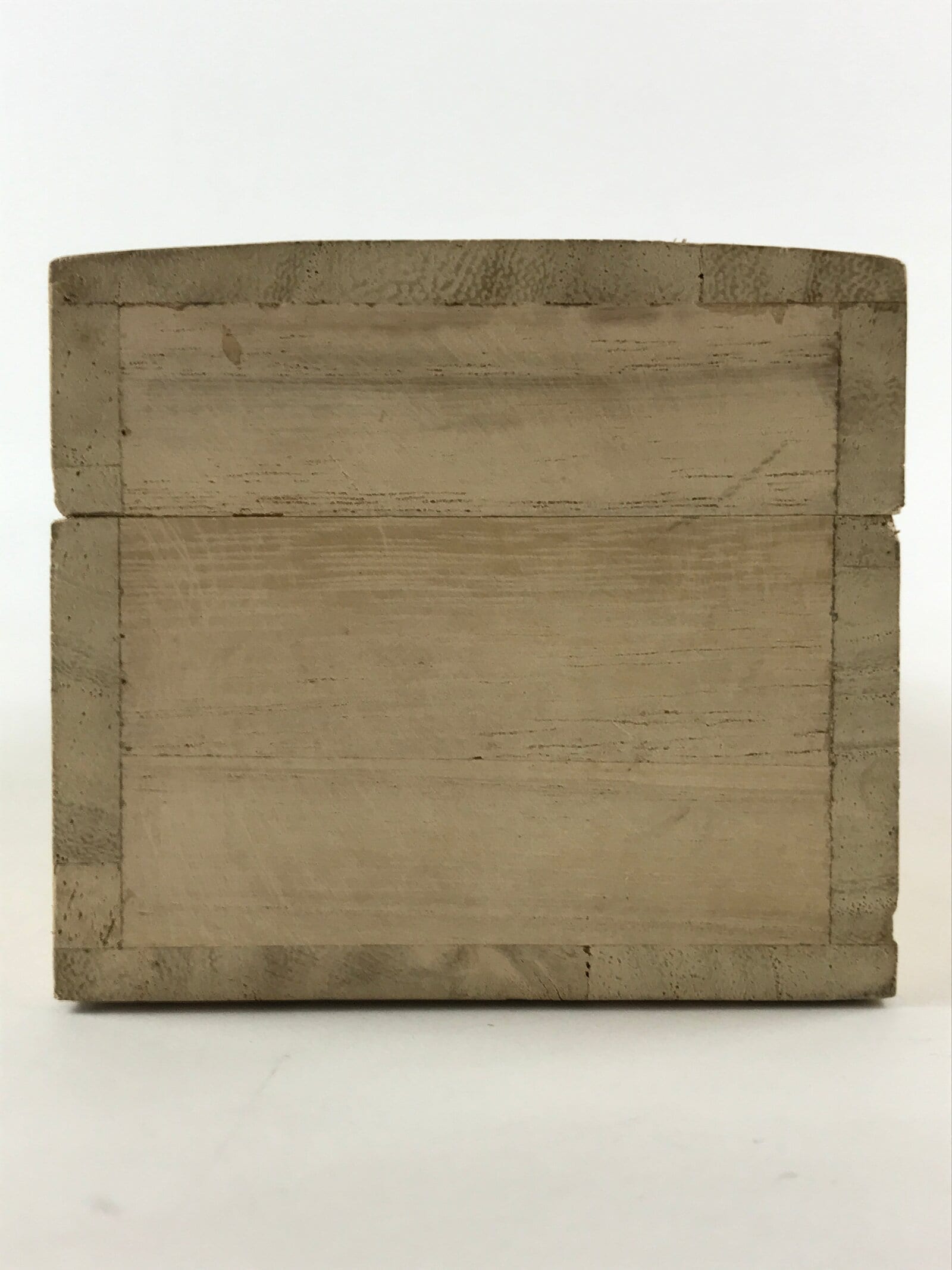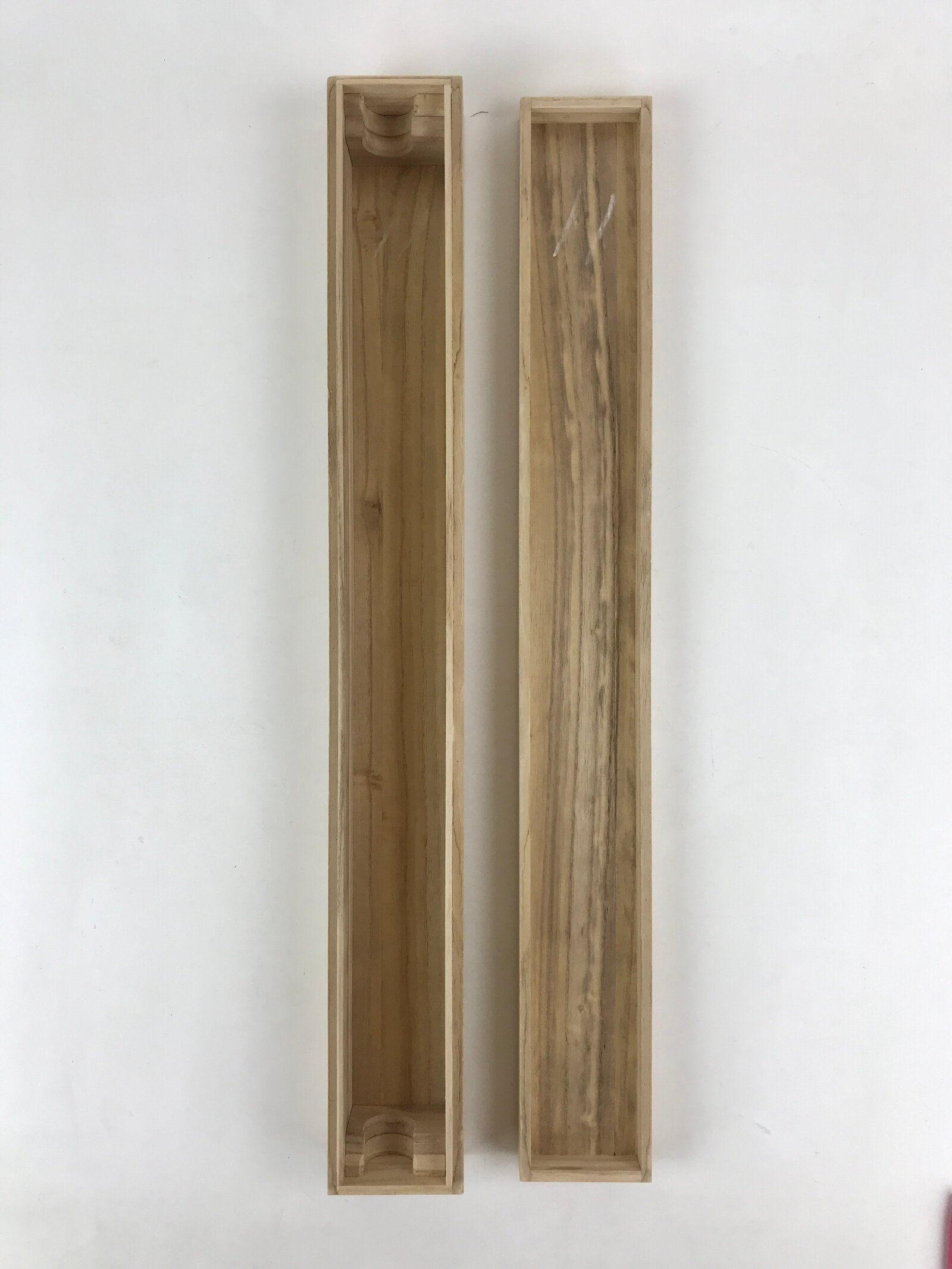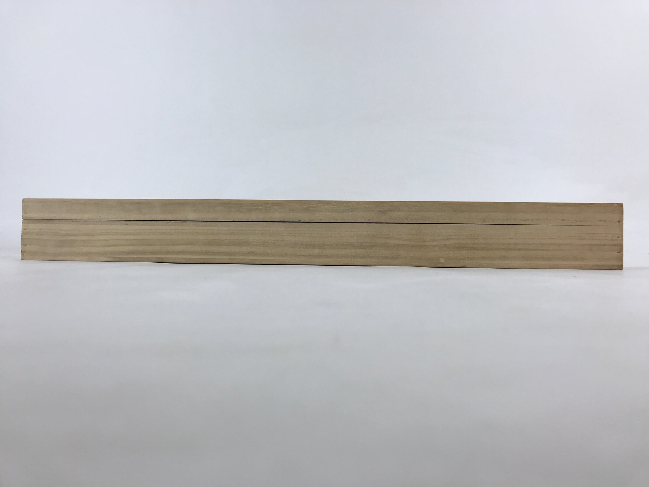 This is a hand-crafted light brown wooden box made to store a hanging scroll, or kakejiku. The lid fits flush with the rest of the box for a uniform look. Inside are two non-adjustable carved brackets meant to secure a scroll in place.