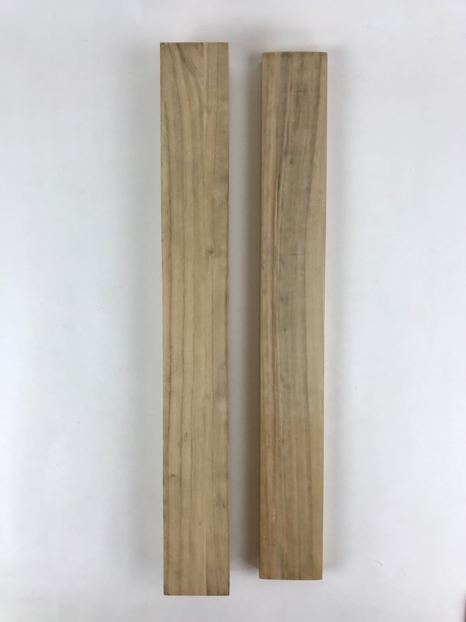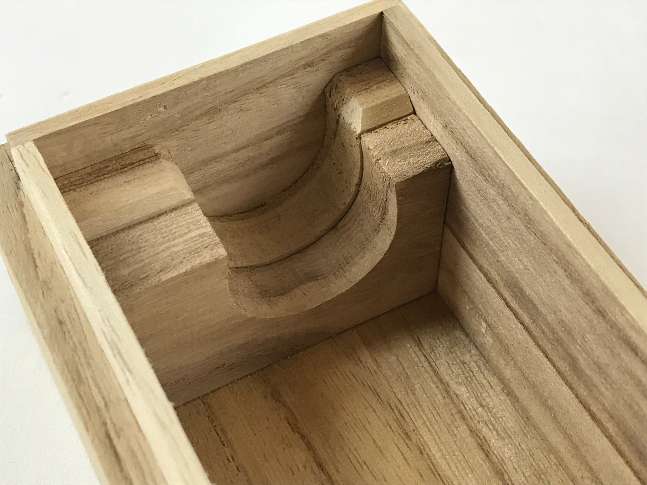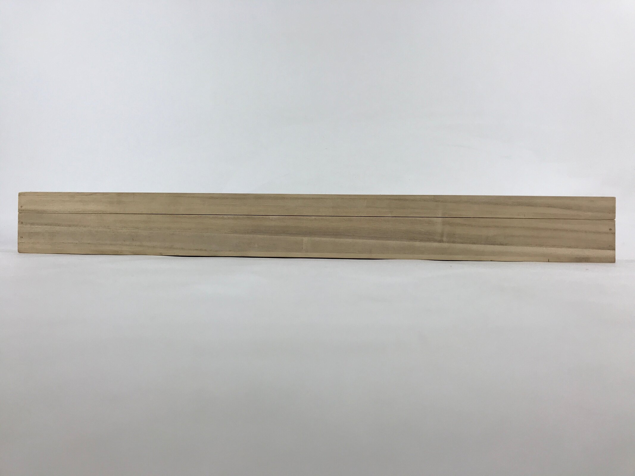 This is a hand-crafted light brown wooden box made to store a hanging scroll, or kakejiku. The lid fits flush with the rest of the box for a uniform look. Inside are two non-adjustable carved brackets meant to secure a scroll in place.