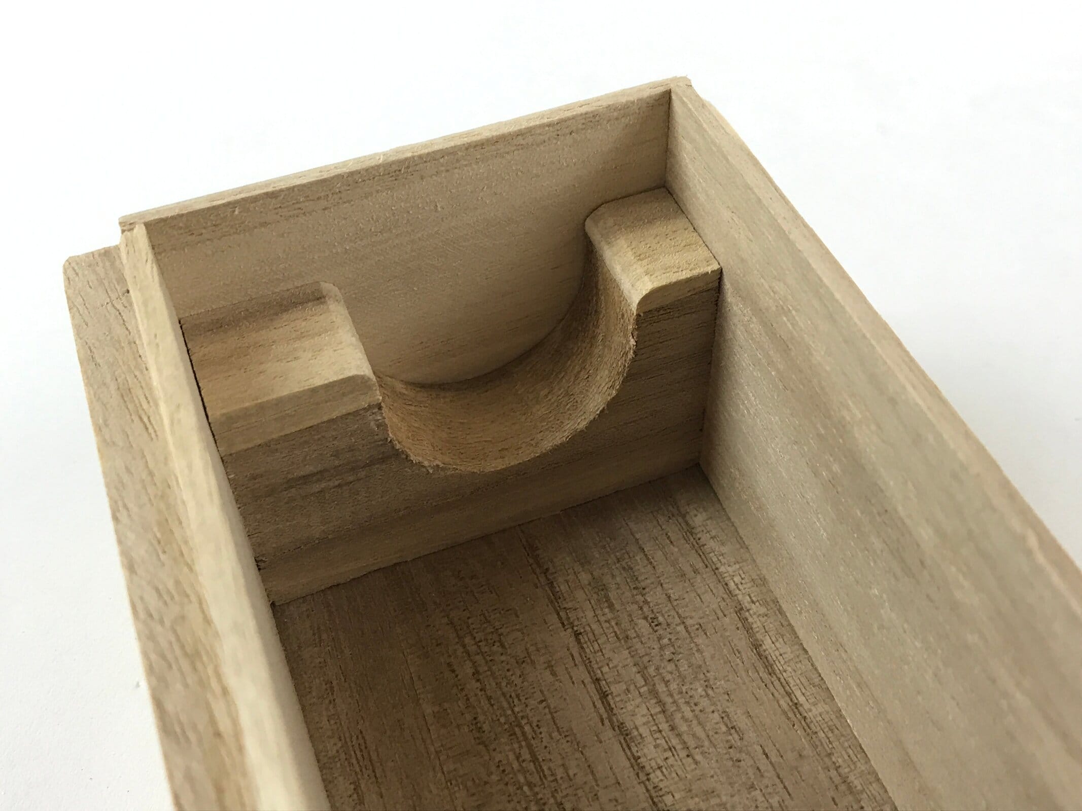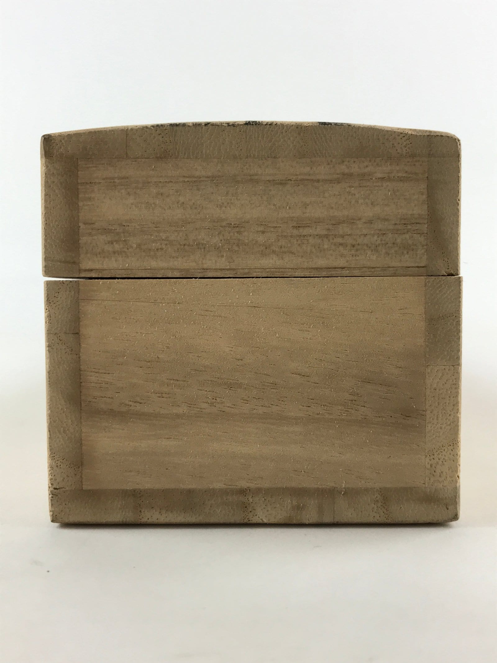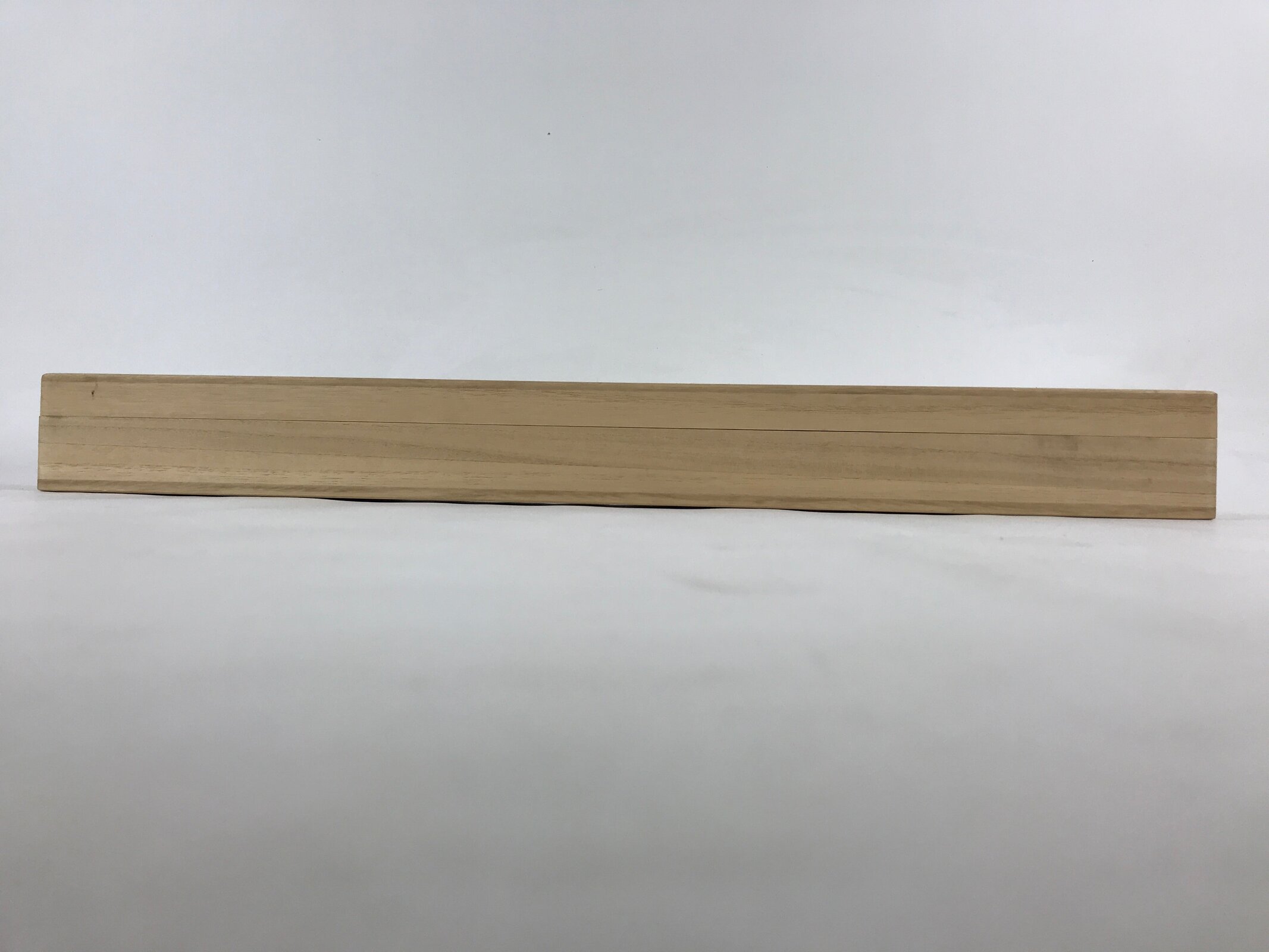 This is a hand-crafted light brown wooden box made to store a hanging scroll, or kakejiku. The lid fits flush with the rest of the box for a uniform look. Inside are two carved brackets meant to secure a scroll in place.