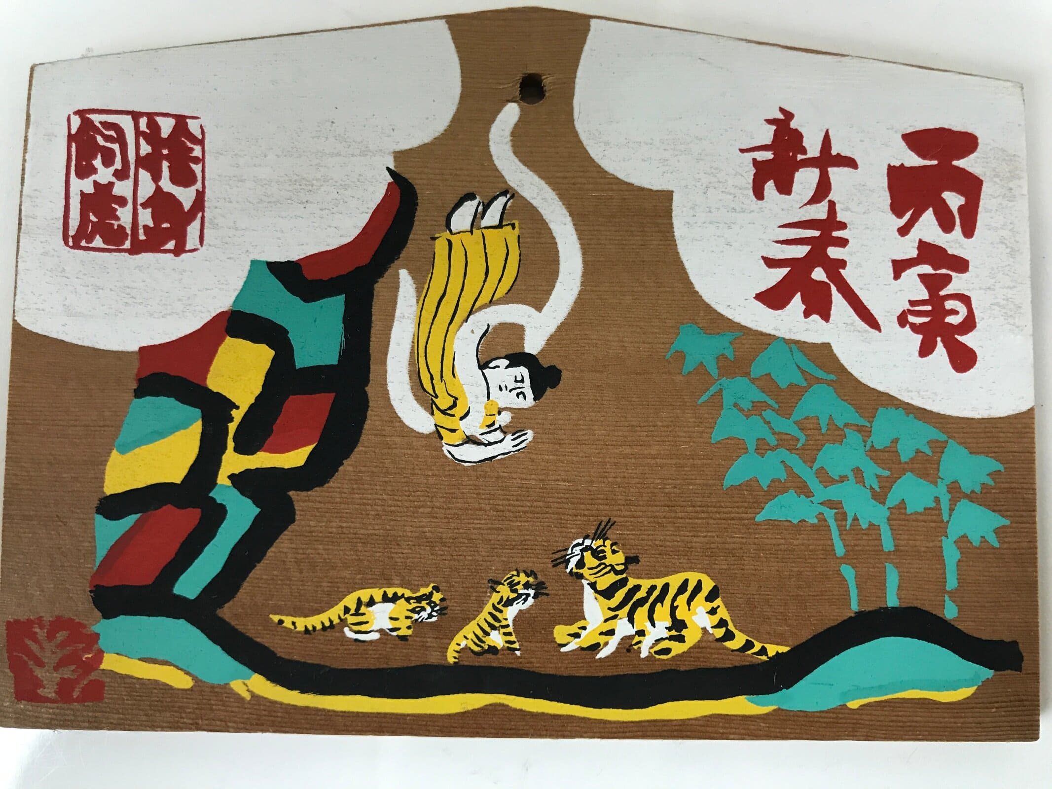 January 23, 2026Japanese Wooden Shrine Plaque Ema Vtg Buddha Offering Life Feed Tigers EM64