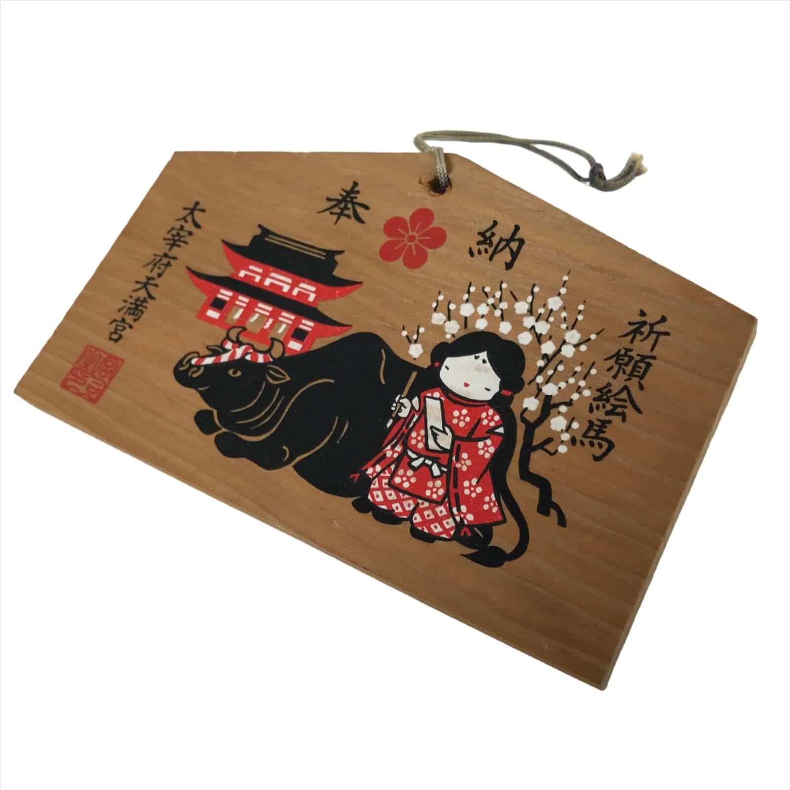 - Kanji on ema: 太宰府天満宮 Daizaifu Tenmangu, 祈願絵馬 kigan ema ema plaque for prayer, 奉納 hono votive offering
