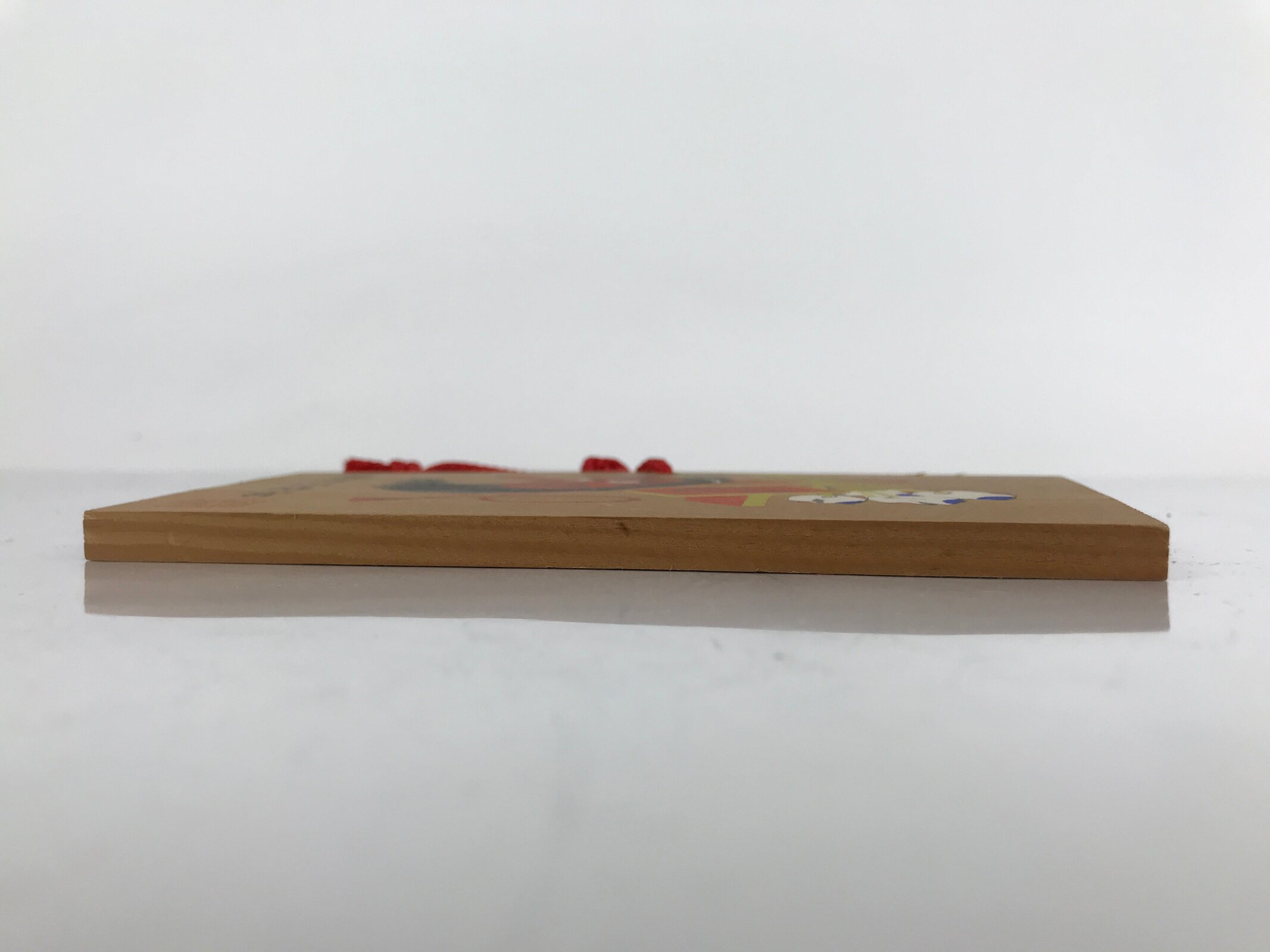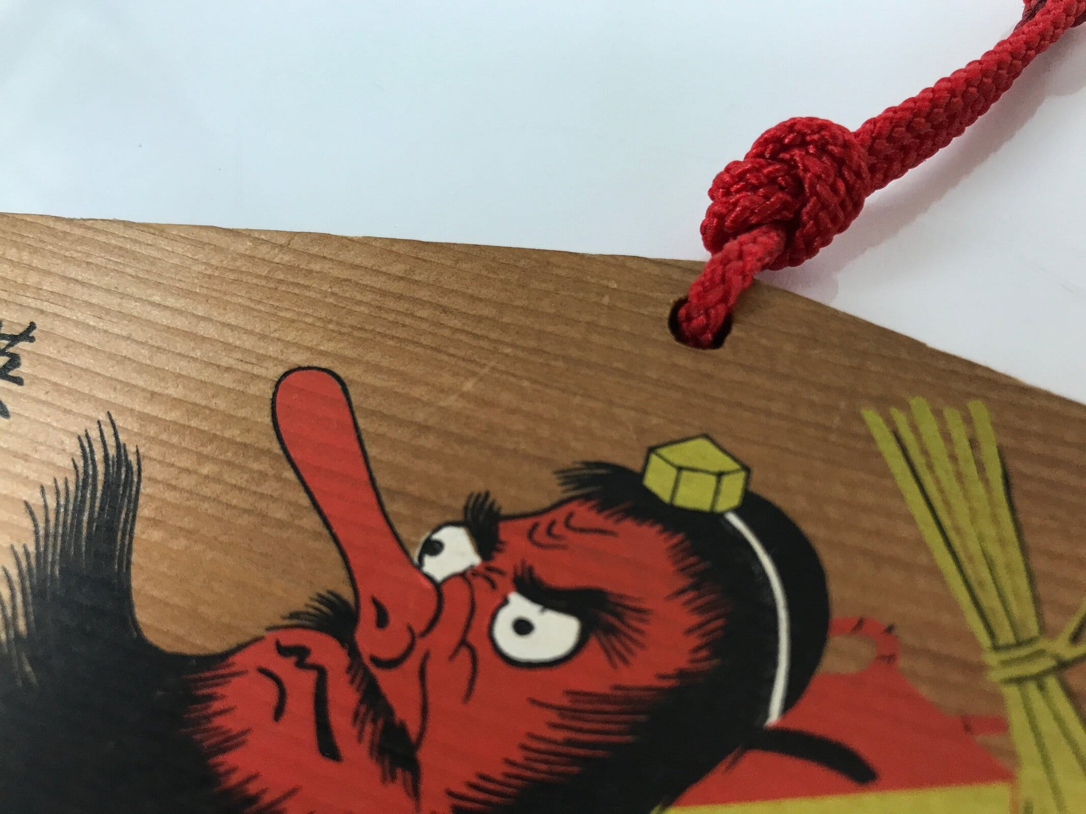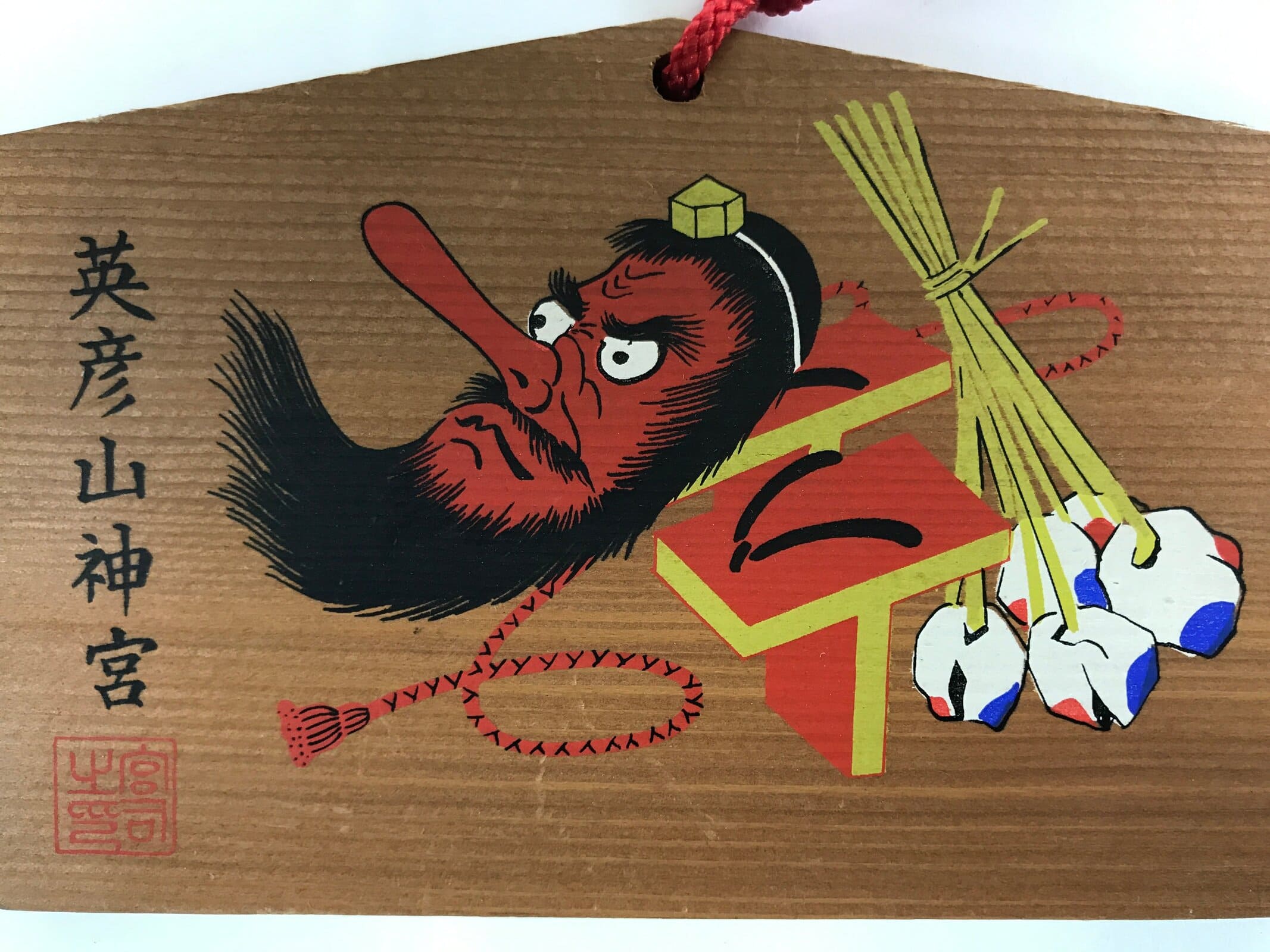 This vintage Japanese ema plaque has a picture with a tengu mask, geta shoes and other objects. It has also a red seal and black inscriptions. It has a red braided cord.