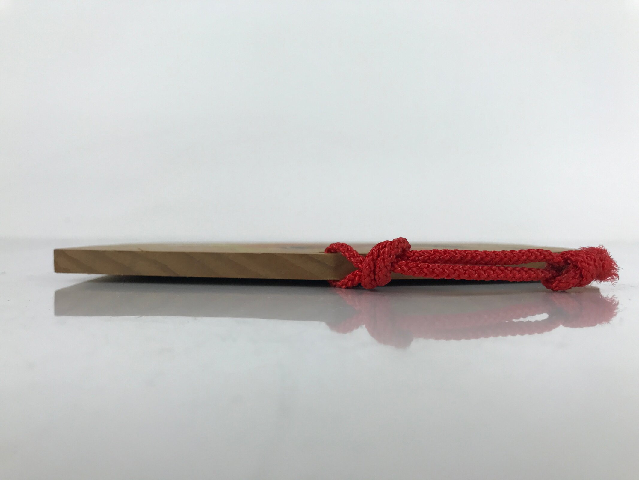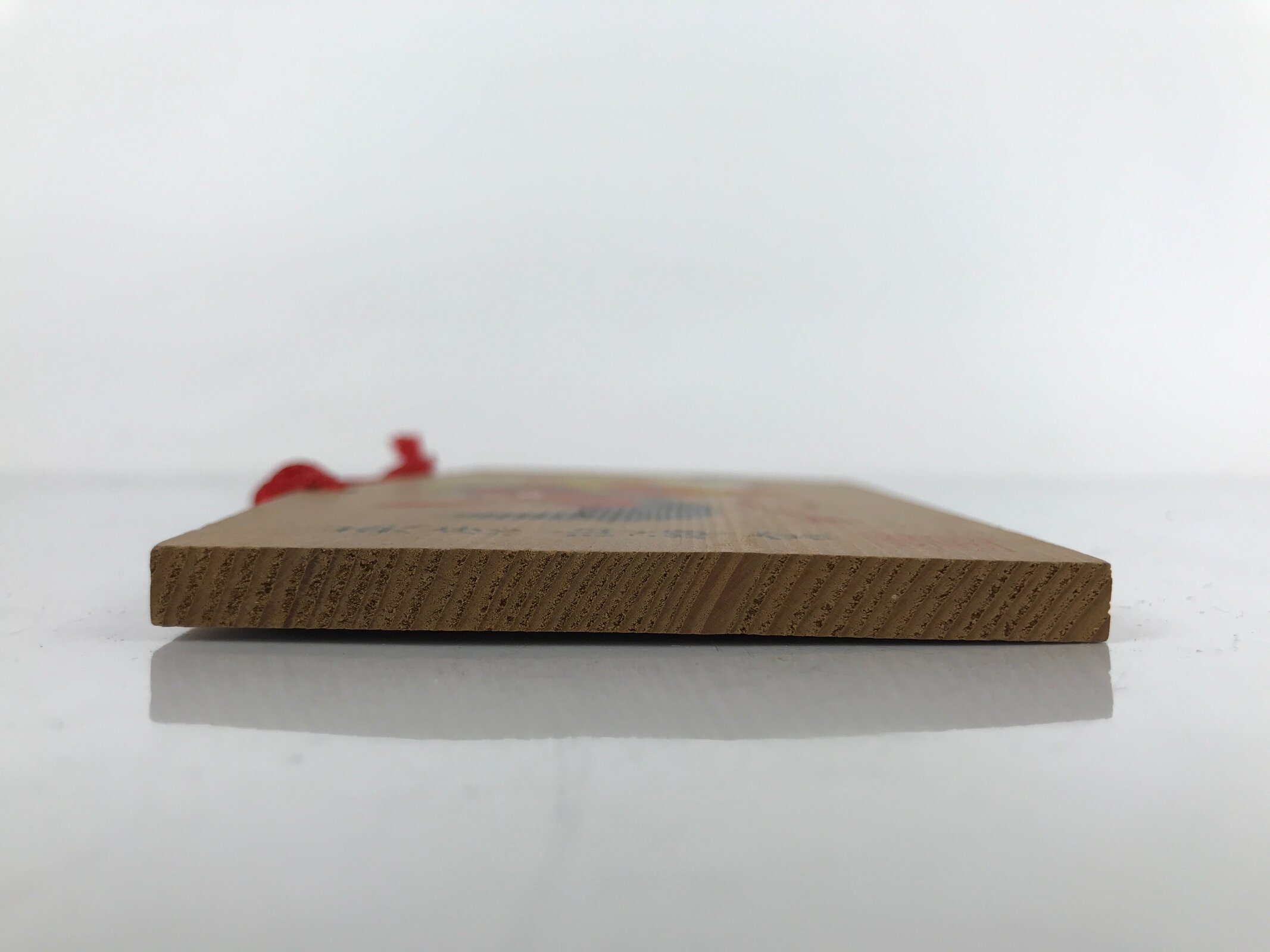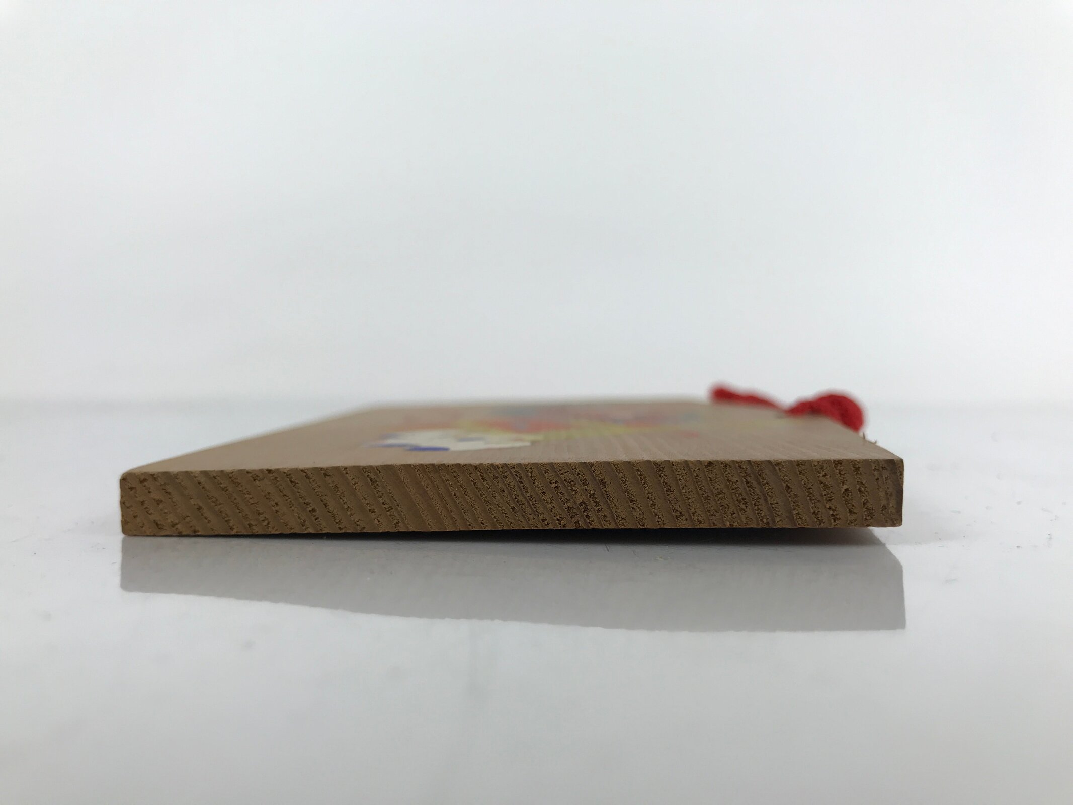 This vintage Japanese ema plaque has a picture with a tengu mask, geta shoes and other objects. It has also a red seal and black inscriptions. It has a red braided cord.
