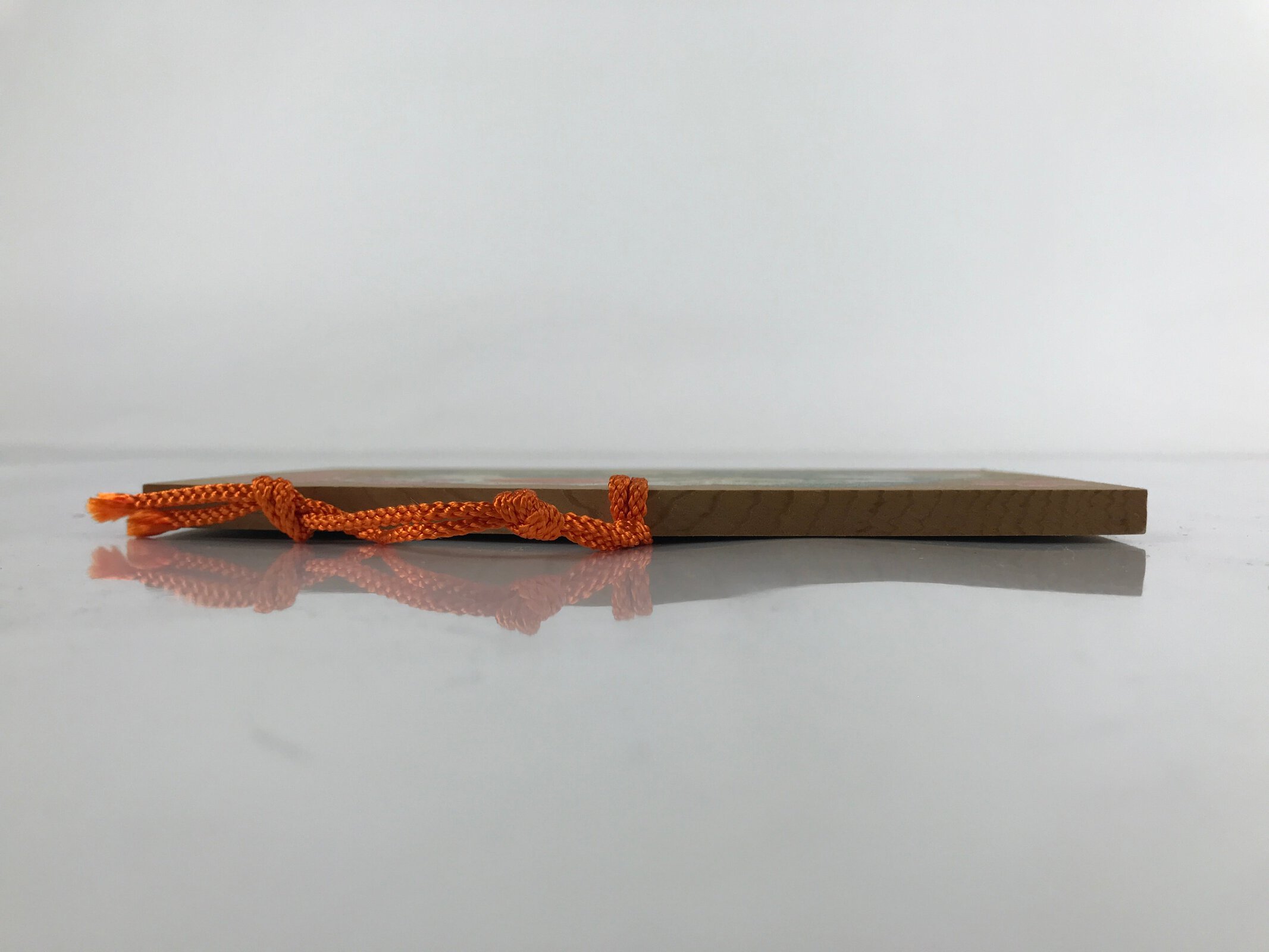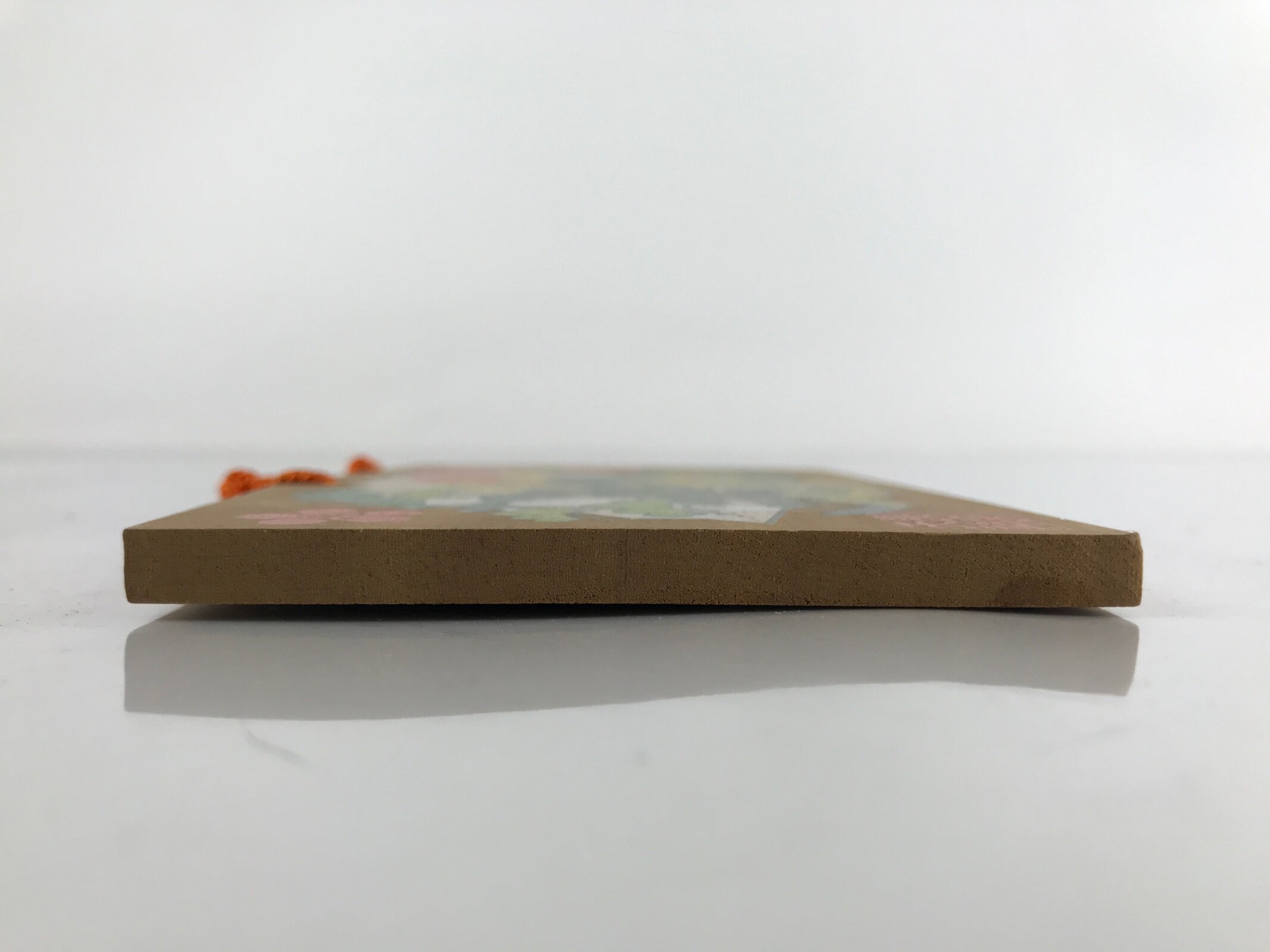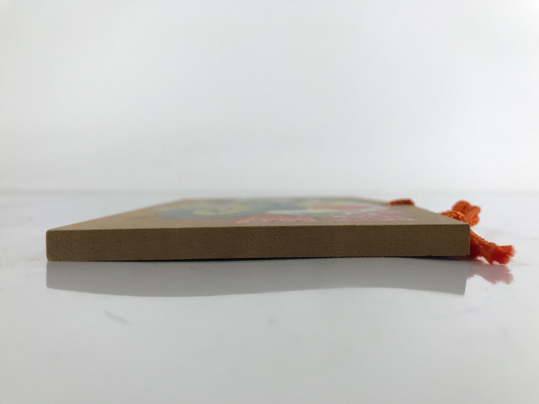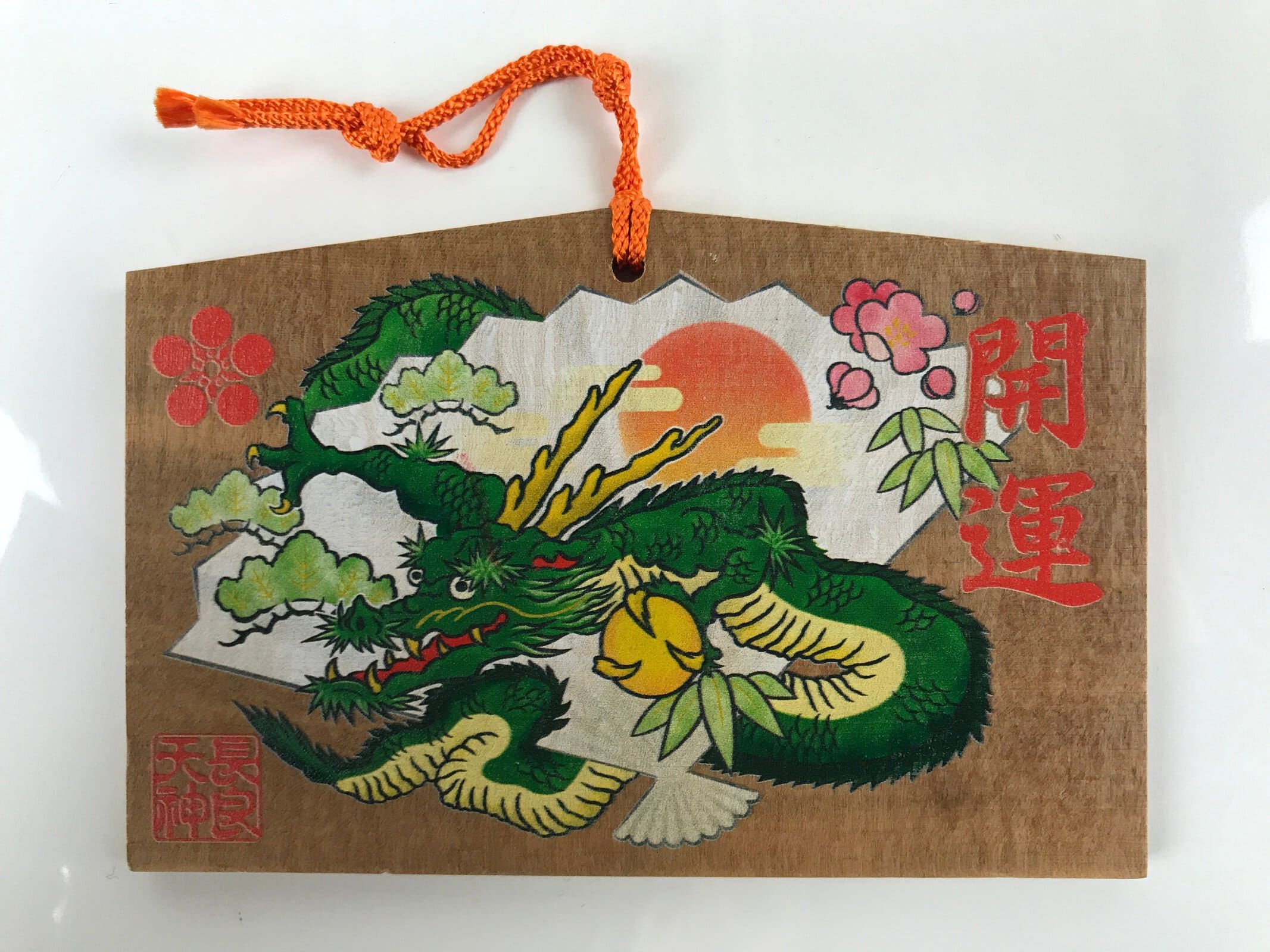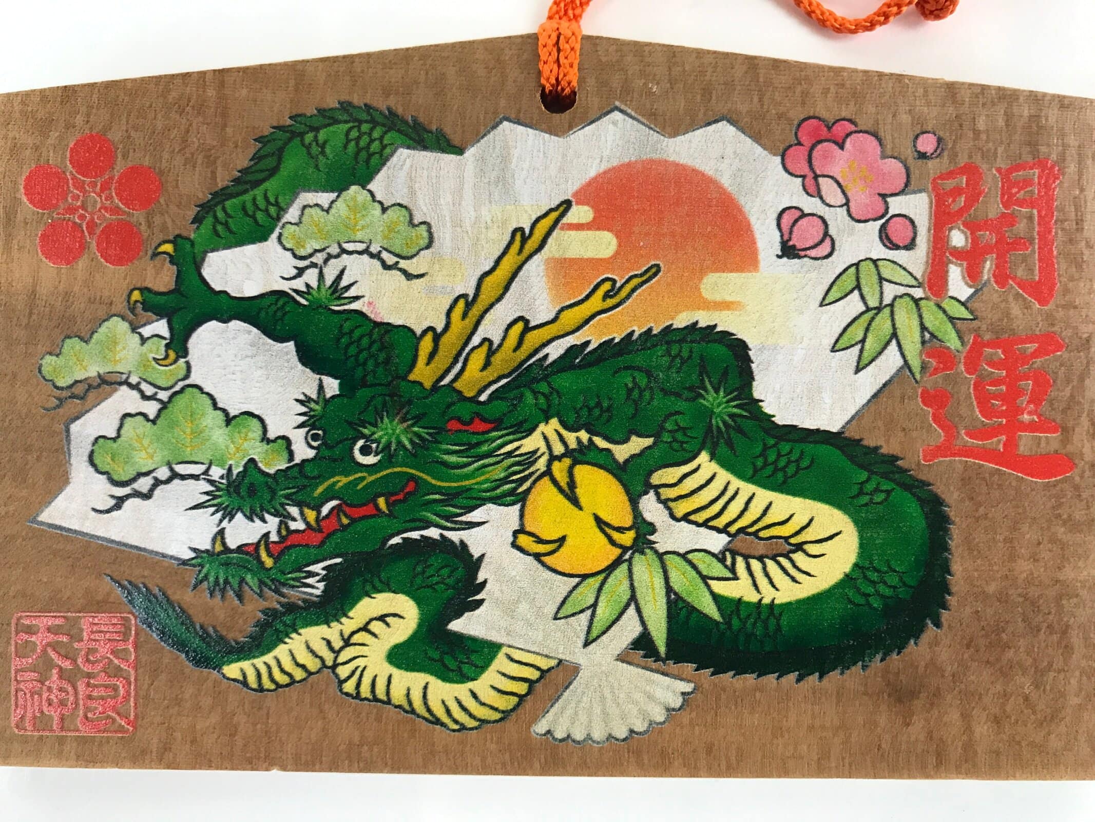This vintage Japanese ema plaque has a picture of a green dragon holding a yellow ball in one of its hands. It also includes other graphic elements such as a folding fan with an orange sun and floral elements. It also has some inscriptions. It has an orange braided cord.