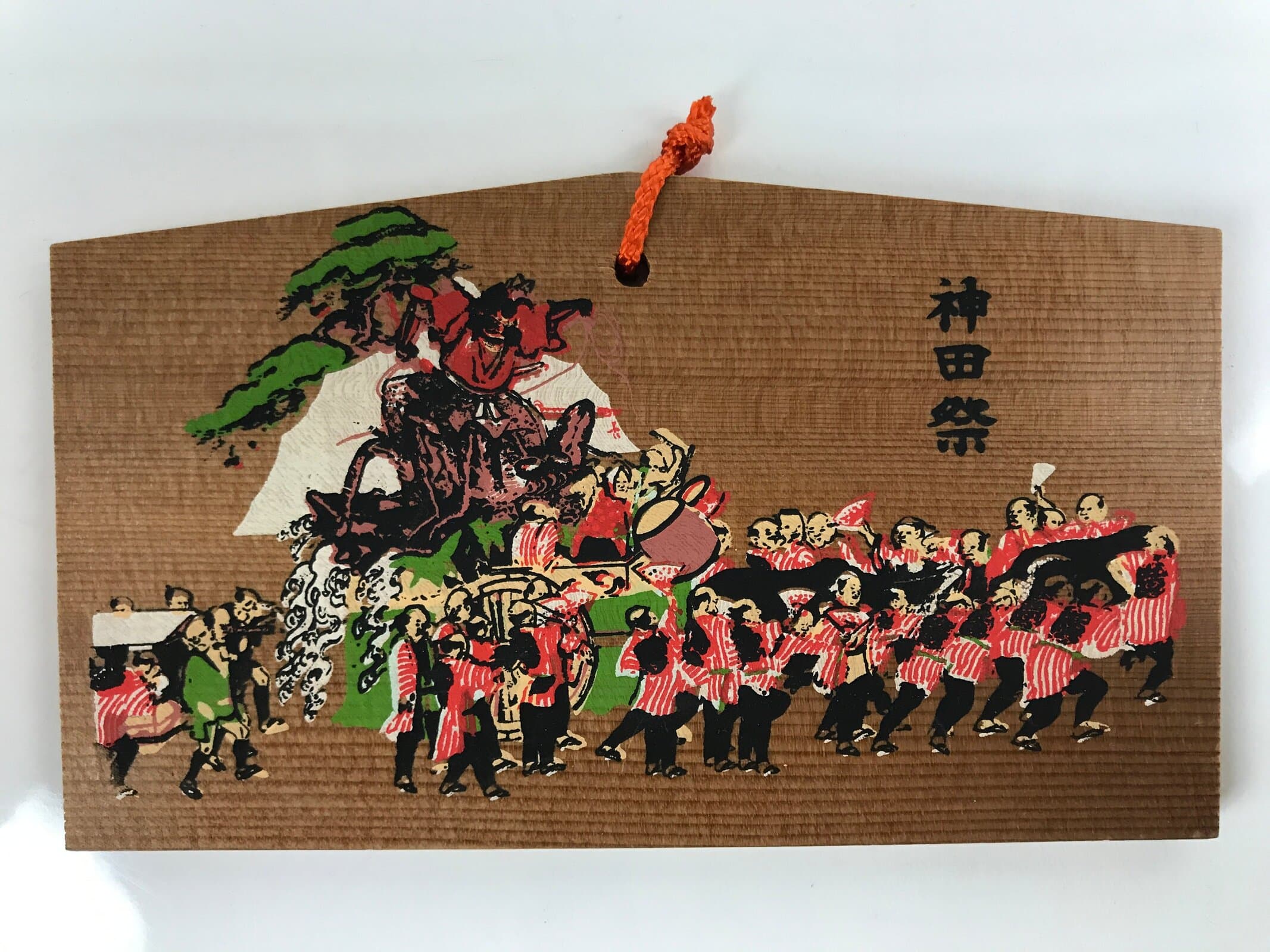This vintage Japanese ema plaque has a picture representing the Kanda Festival in Tokyo. It is very detailed. It has also black inscriptions. It has an orange braided cord.